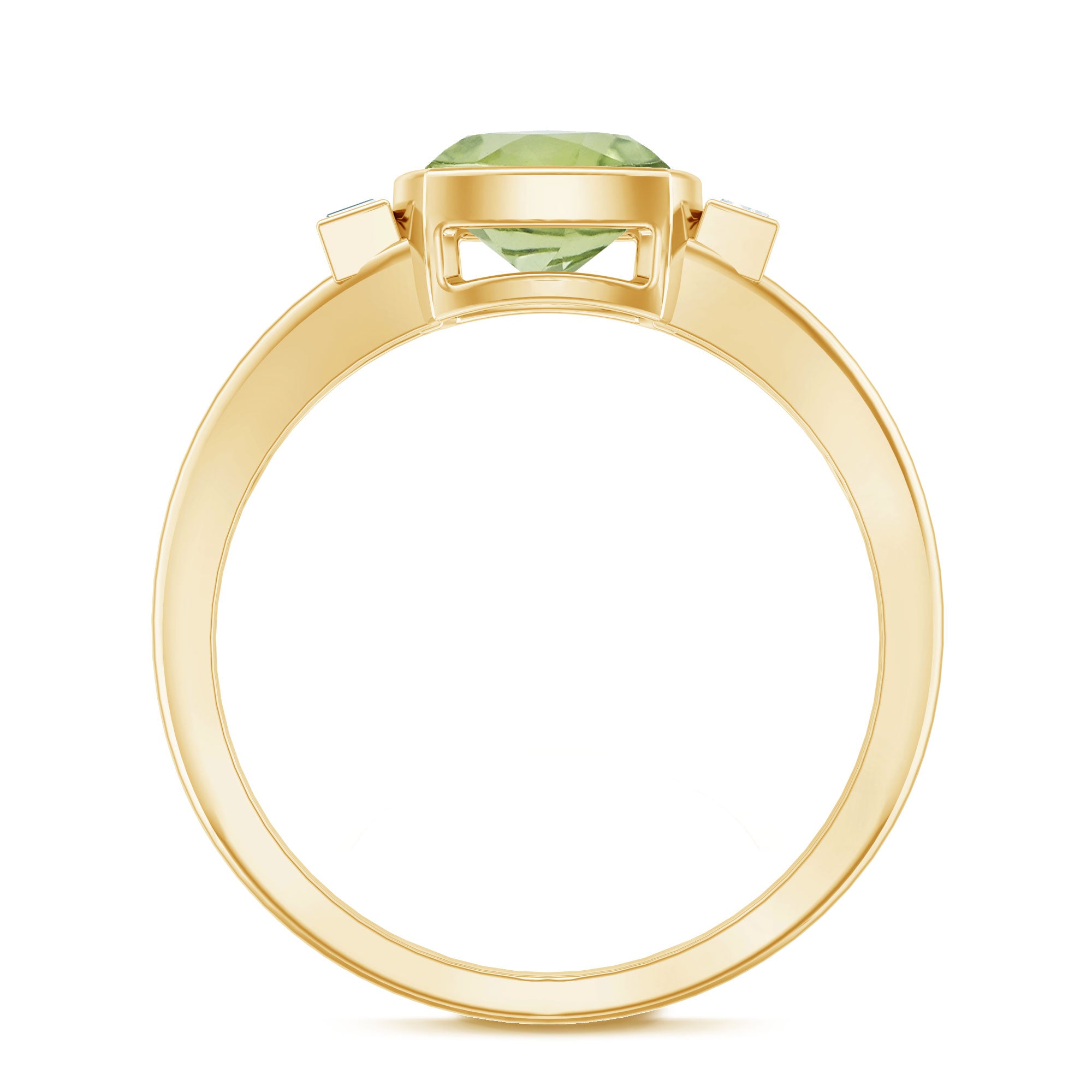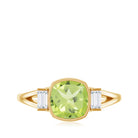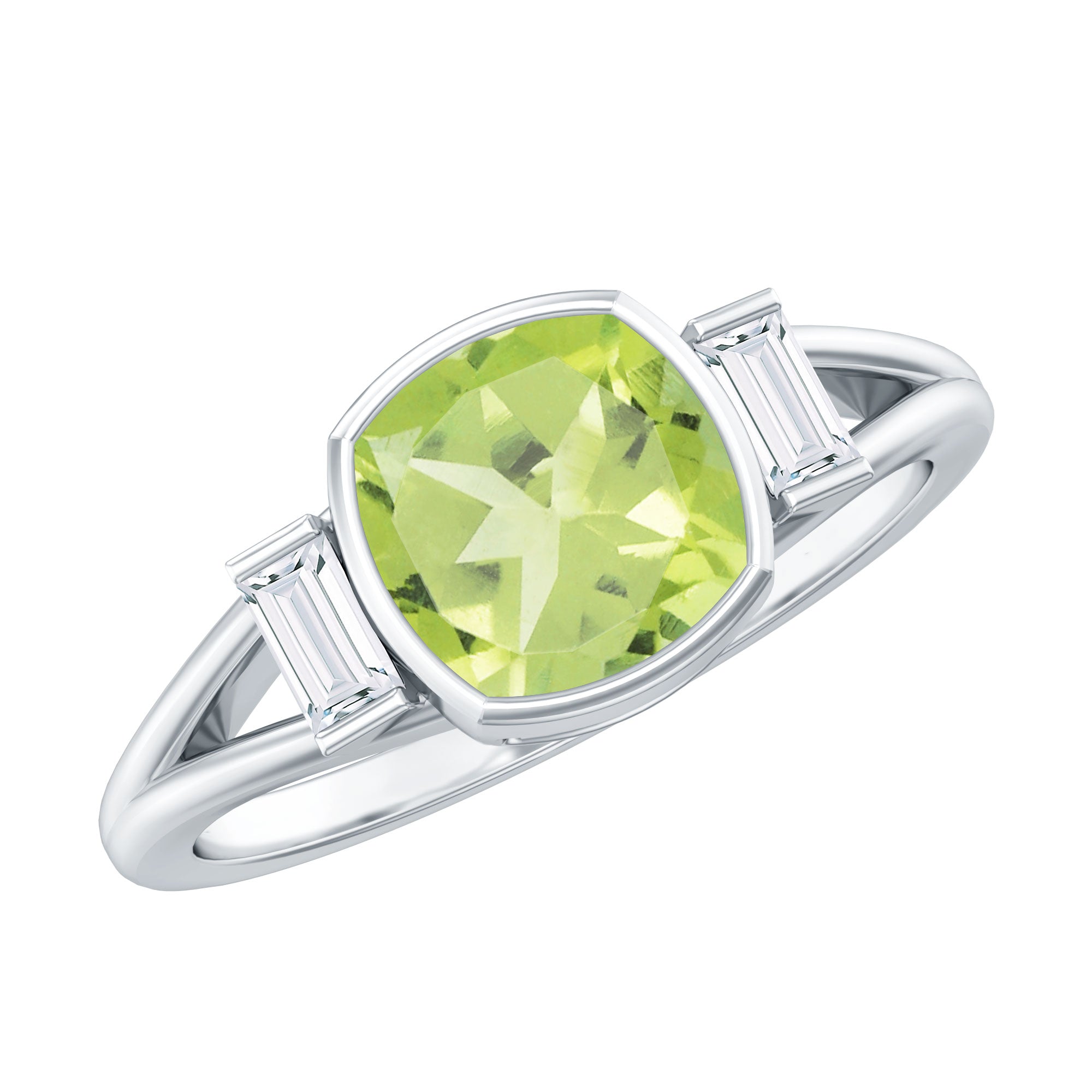 This exquisite engagement ring features a stunning cushion-cut peridot center stone set in a sleek bezel setting. The bright green gemstone is perfectly complemented by the elegant addition of a baguette-cut Diamond in a bar setting, adding an extra touch of brilliance and sparkle. The split shank band adds a modern and sophisticated touch to the overall design, making it a perfect choice for a contemporary bride who loves classic elegance. This ring is a timeless symbol of love and commitment that will be treasured for a lifetime.