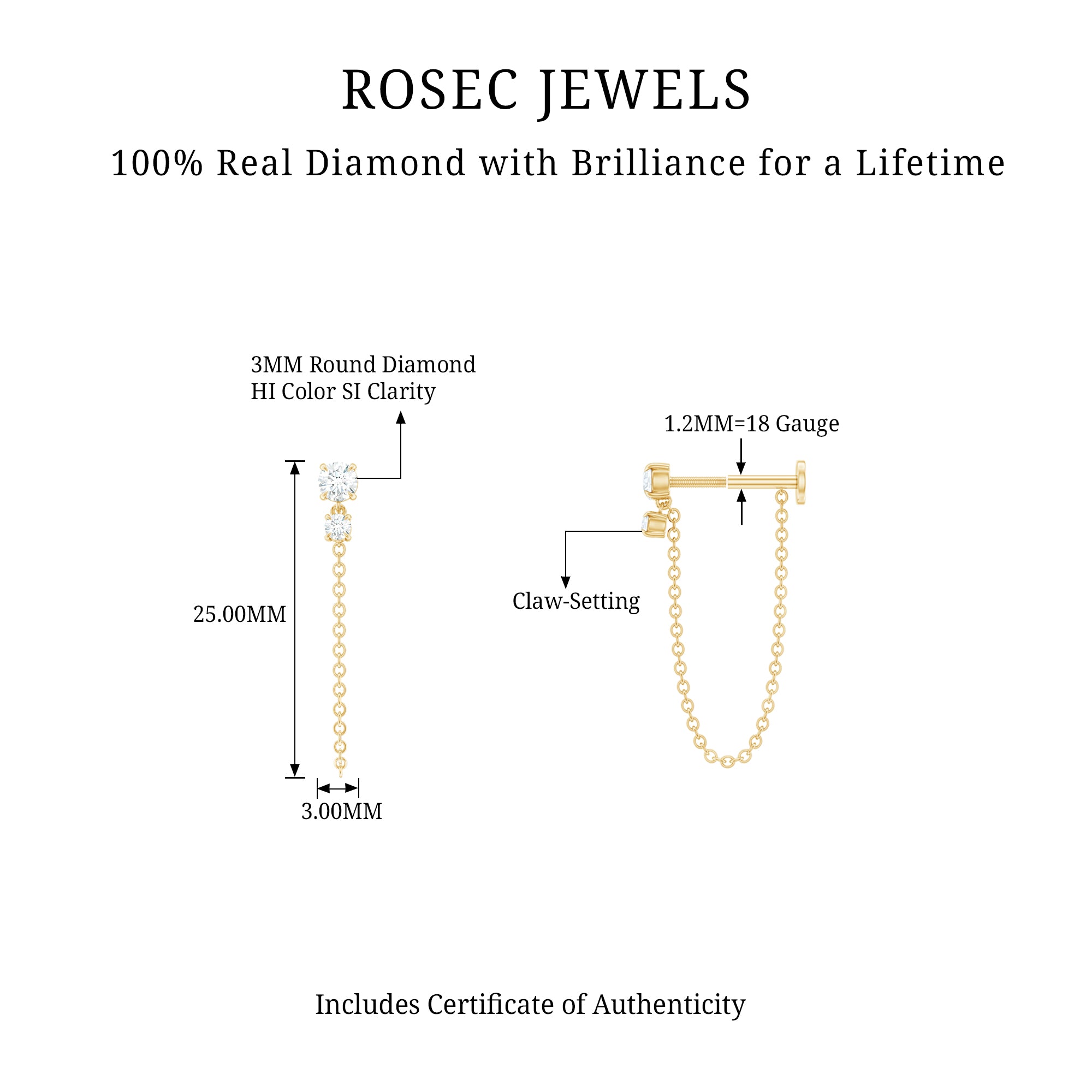 Craft a distinctive ear stack adorned with a unique Chain Drop Earring. This earring features two round shape diamonds on the top secured by prong setting while a dangling chain adds movement.
