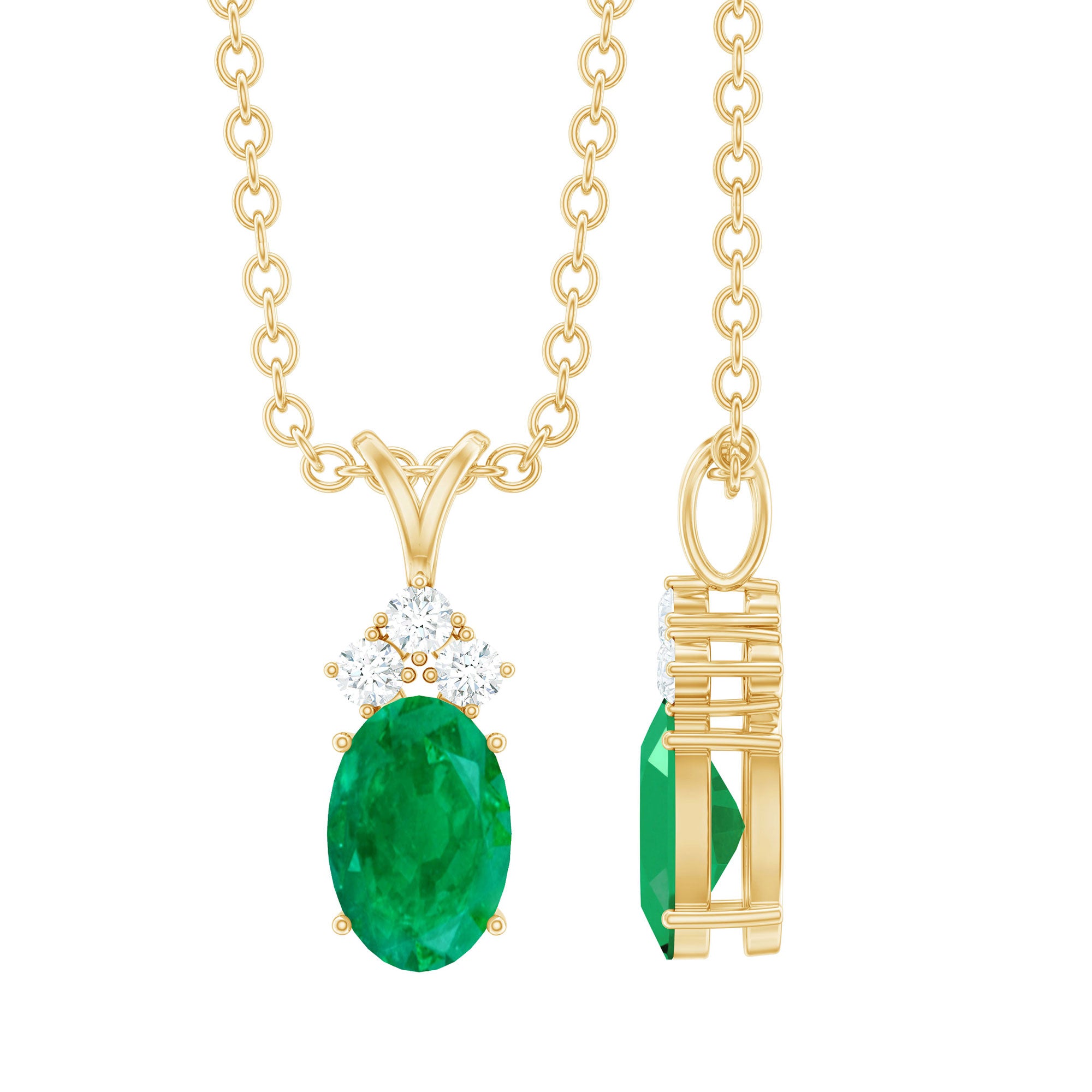 Complement her attire with this Oval Pendant Necklace embellished with an Oval Cut Emerald in 4 Prong Setting and topped with Round Diamond Trio. This Emerald Pendant is composed of Solid Metal and features a Rabbit Ear Bail. Present this Emerald Pendant Necklace to your special person and make her feel special.