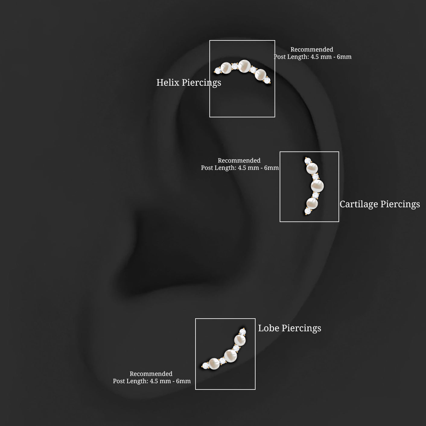 The Climber Earring showcases a curved design and alternate Freshwater Pearl and Moissanite to create a unique and eye-catching pattern that climbs up the ear. This Pearl Helix Earring is both durable and stylish, making it perfect for any occasion. You can style this Freshwater Pearl Earring on your Helix, Cartilage, or Upper Lobe Piercing.