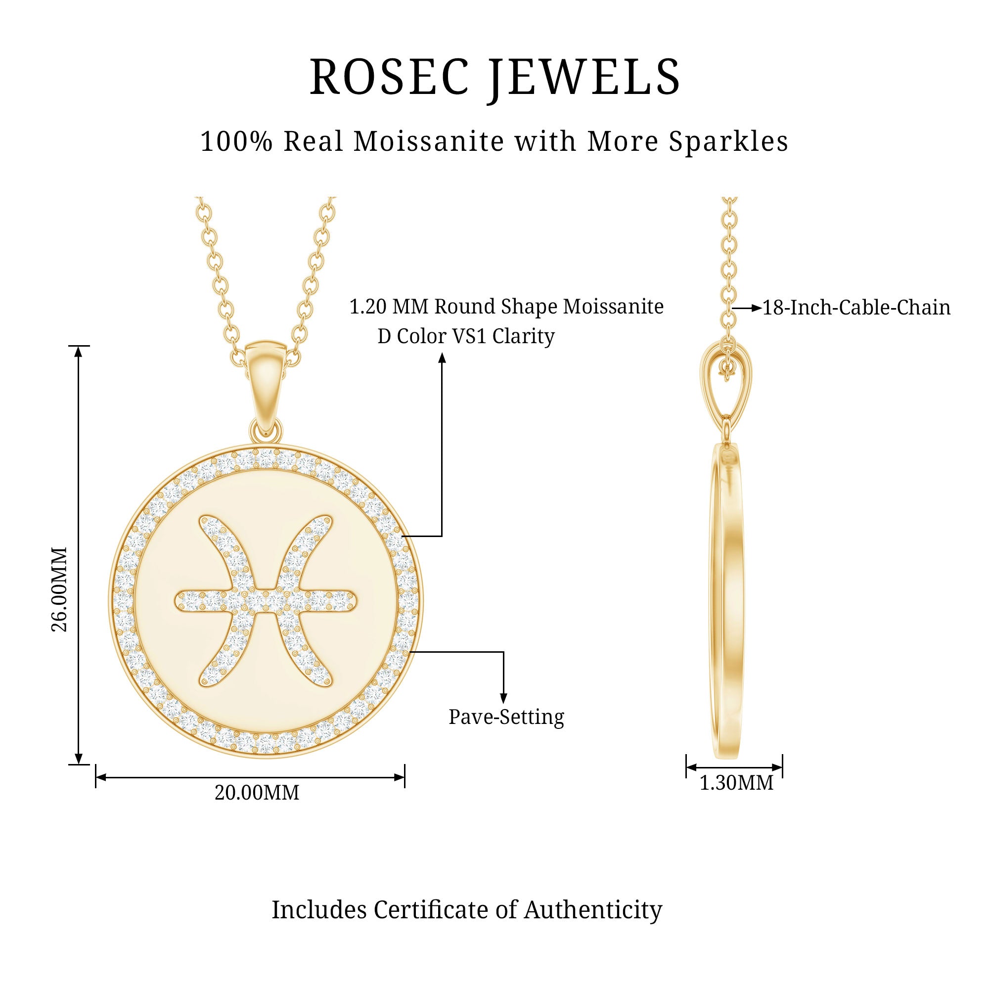 Allow the Pisces Zodiac Pendant to serve as a powerful talisman, accompanying you through challenging times. Adorned with mesmerizing Round Cut Moissanite gems meticulously set in a Pave Setting, this pendant showcases the intricate pattern of the Pisces Zodiac.