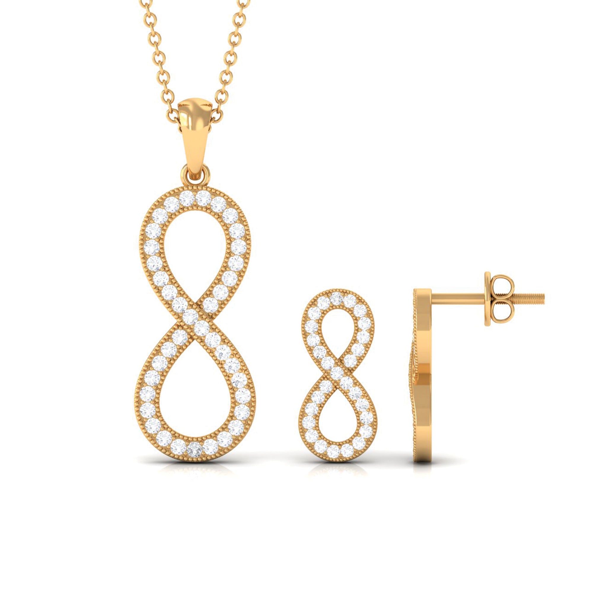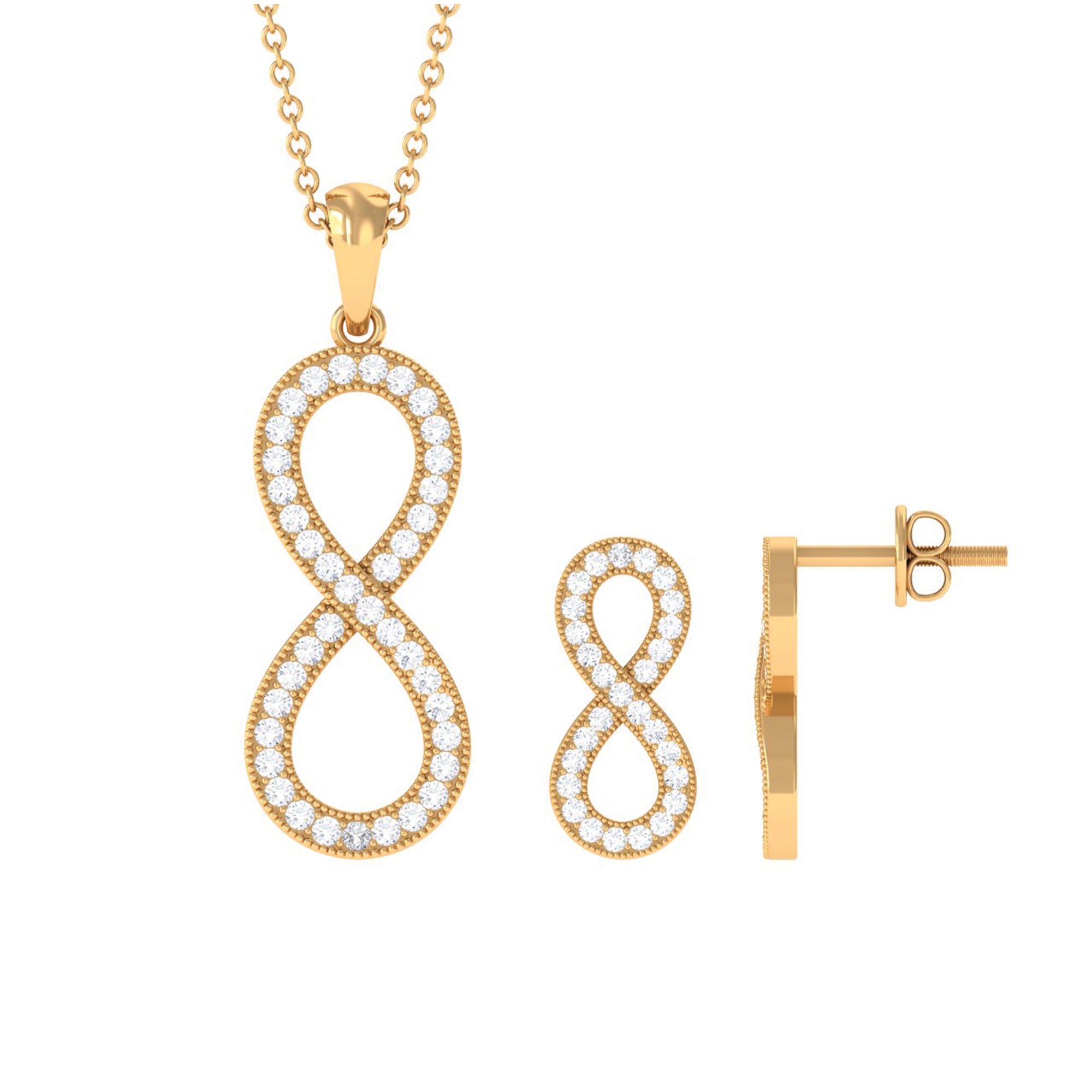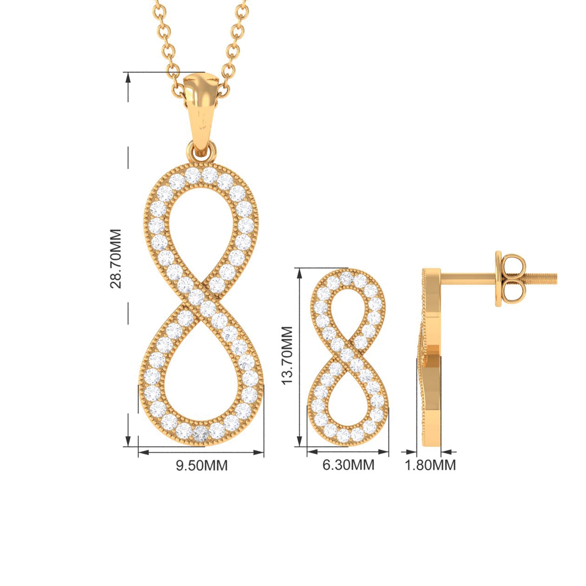 Capture the endless bond of love with our simple moissanite infinity jewelry set. This set features a timeless infinity symbol pendant and earrings, beautifully crafted and adorned with sparkling moissanite. The pave setting ensures the stability and durability of the stone. This delicate design is perfect for everyday wear, and the sparkling moissanite stones will catch the light and add a touch of glamour to any outfit.