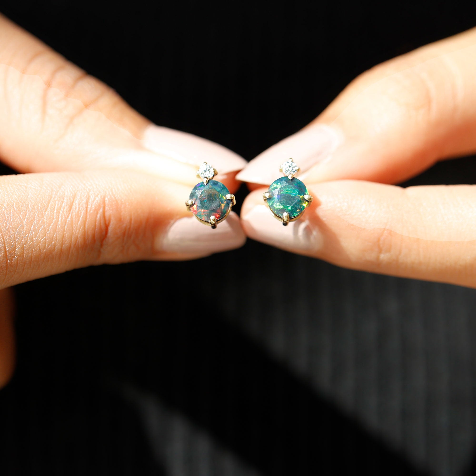 Simple Round Black Opal Solitaire Stud Earrings with Dainty Moissanite