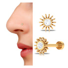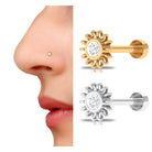 Elevate your look with this stunning Sunburst Nose Pin, adorned with a small Round Shape Diamond in a Bezel Setting. Delicately crafted from Gold Metal, this Nose Jewelry is available in Yellow Gold, White Gold, and Rose Gold. The simple Flat Back Closure ensures that it stays securely in place. This beautiful Nose Piercing is perfect for adding a touch of charm to your overall look. You can also gift this Gold Nose Pin to your loved one on her birthday to impress her with your impeccable choice of jewelry.
