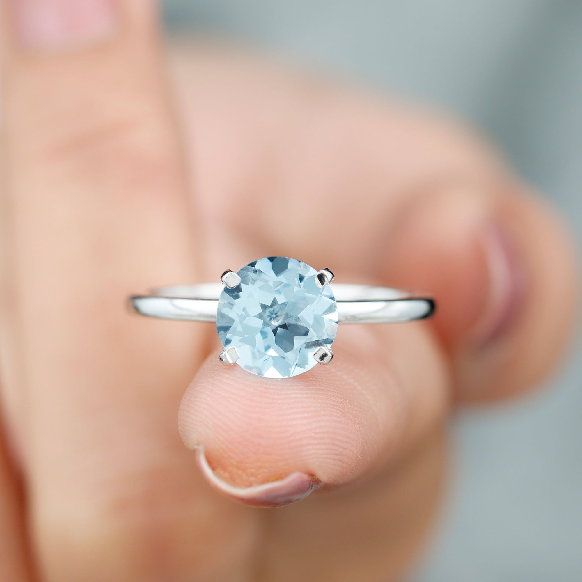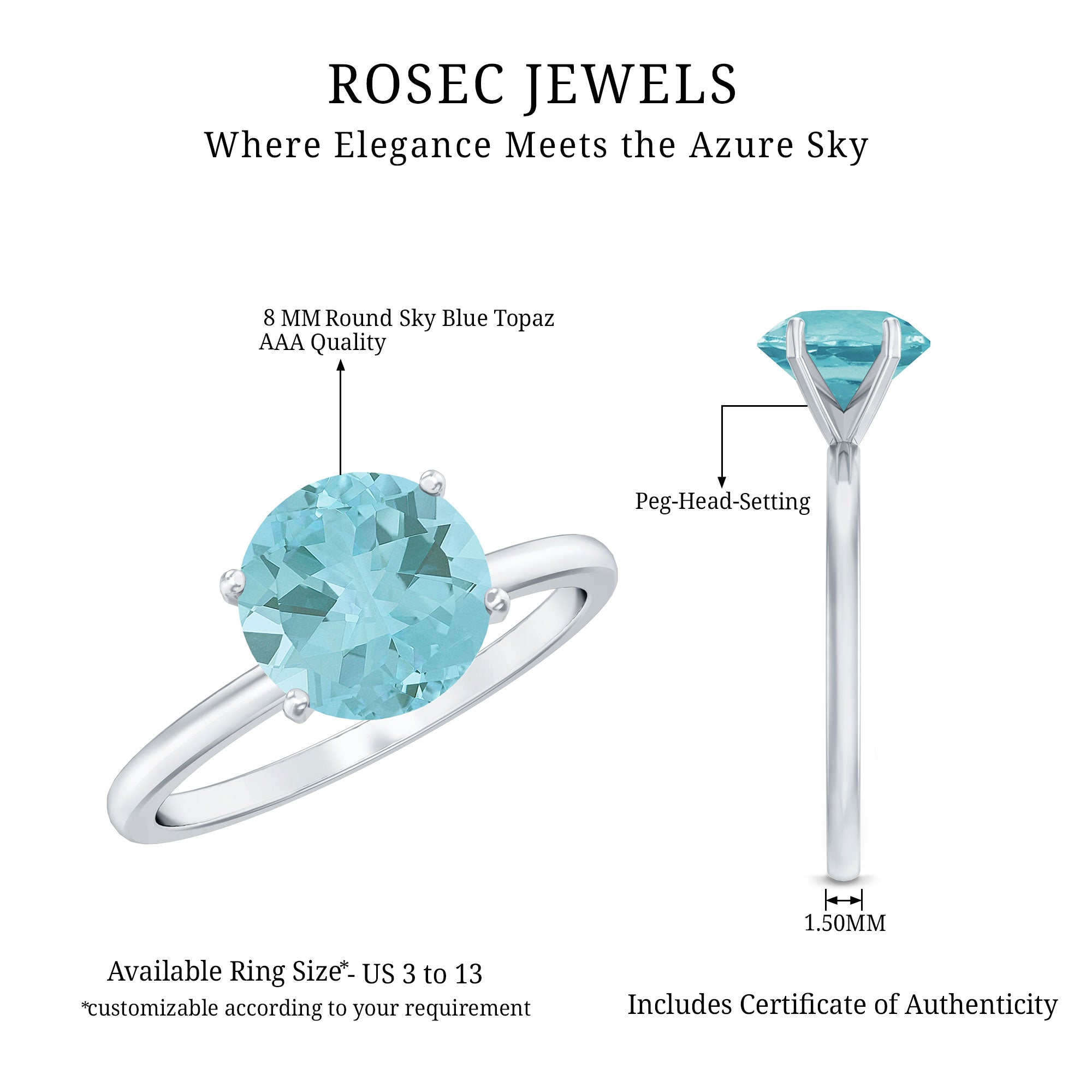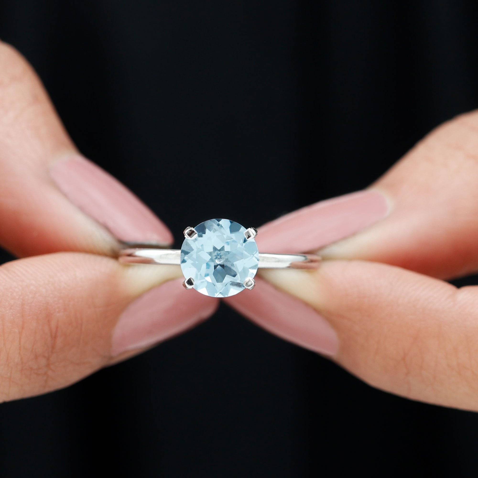 Capture her heart with a symbol of eternal devotion when you gift her this exquisite Solitaire Ring. Adorned with a round shape Sky Blue Topaz, securely nestled in a Peg-Head Setting, this blue topaz ring is destined to become a cherished heirloom. Its timeless beauty and significance make it a perfect choice as a birthstone ring for women born in September, adding an extra layer of sentiment to this already captivating piece of jewelry.