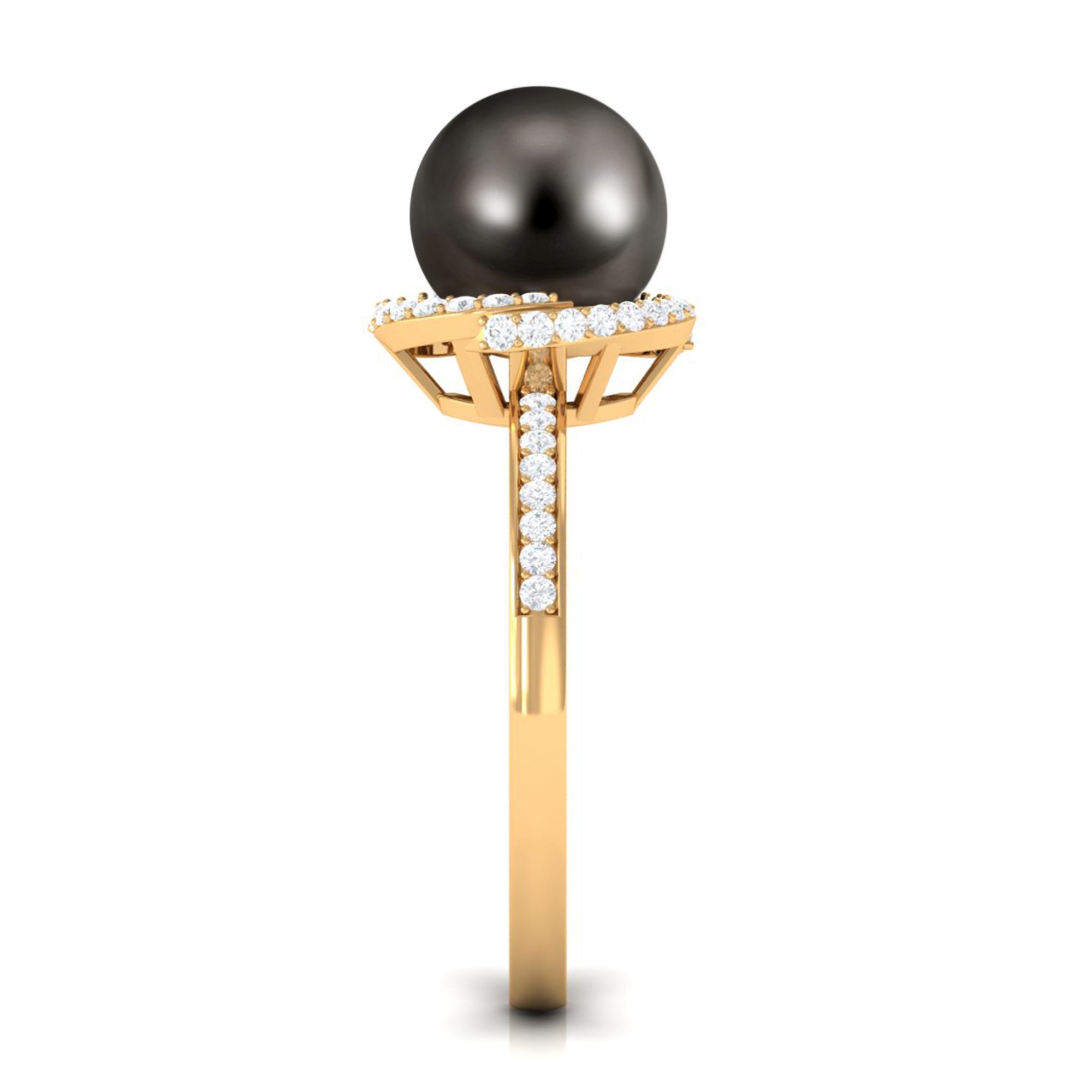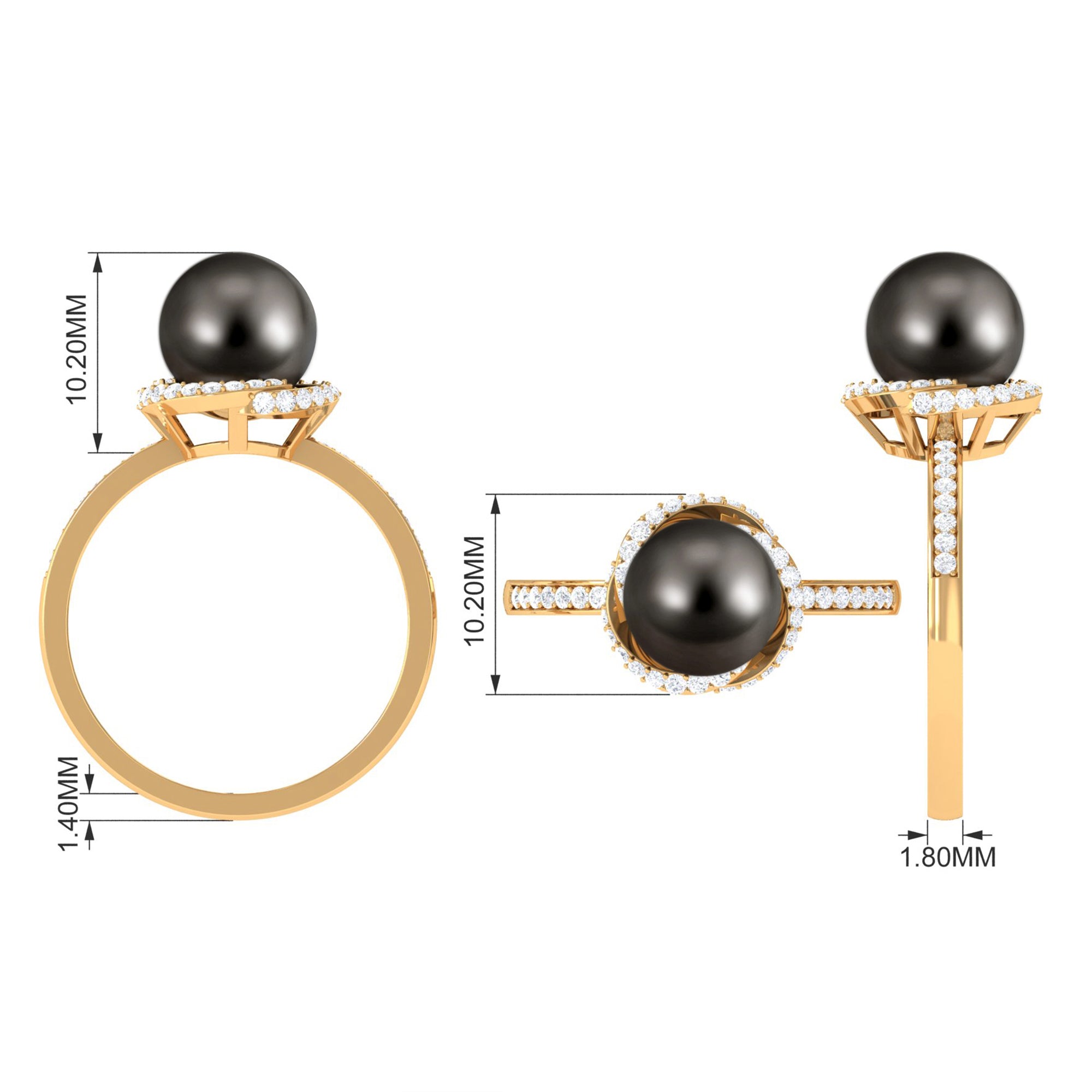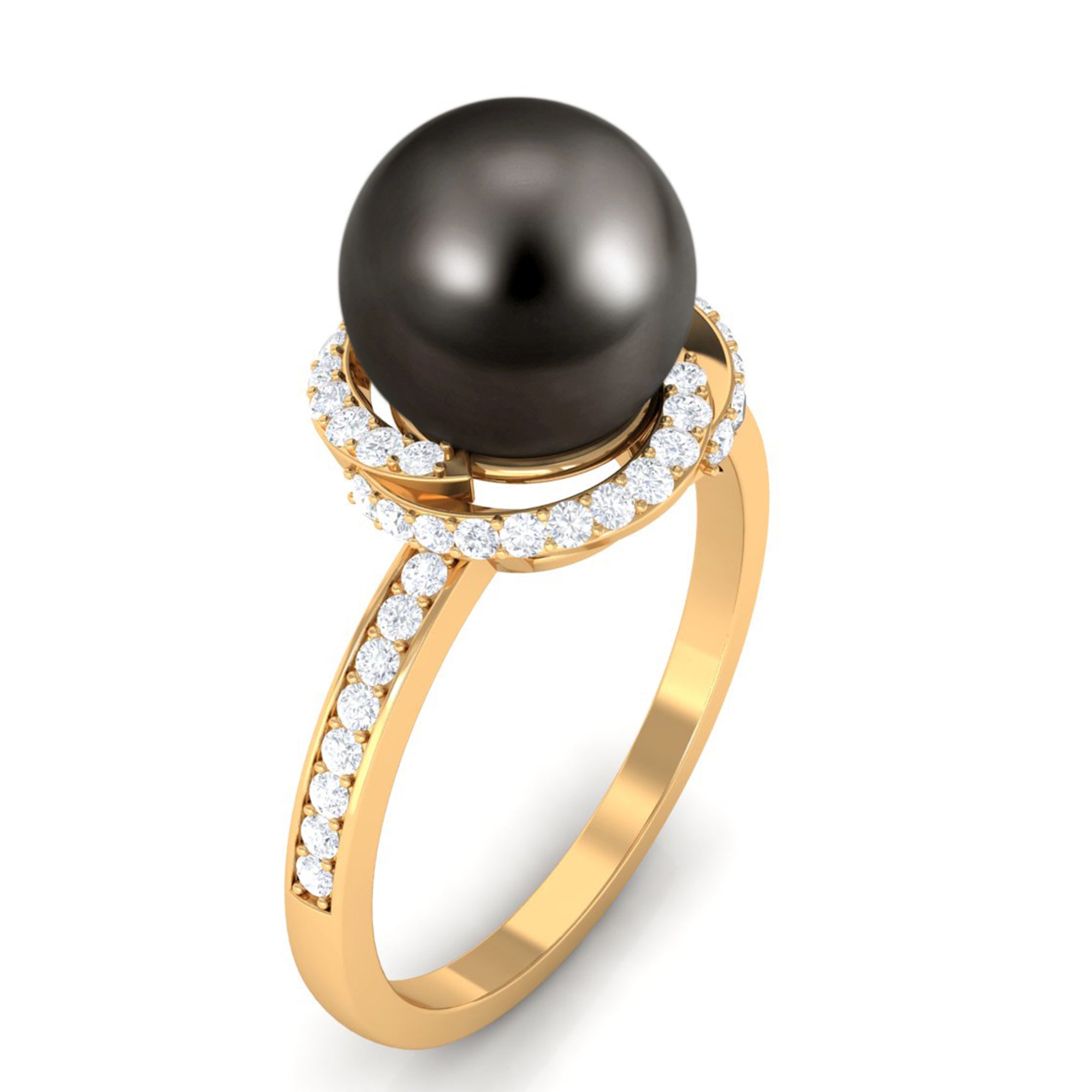A round Tahitian pearl sits atop this gleaming solitaire ring and exhibits an enchanting hue that is hard to miss. It is accented with Diamond studded swirl motifs that form an exquisite halo around the center stone. Additional sparkly Diamond is laid out on the shank band to create a timelessly elegant solitaire style. If you want a versatile piece that helps you survive a myriad of occasions, then do not look past this minimal Tahitian pearl ring.