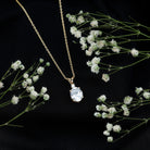 Add a touch of elegance to your ensemble with this Simple Pendant Necklace. Featuring an oval and round cut Zircon, this necklace shines bright. The rabbit ear bail adds a unique and stylish element. Elevate your look with this beautiful and versatile pendant necklace.