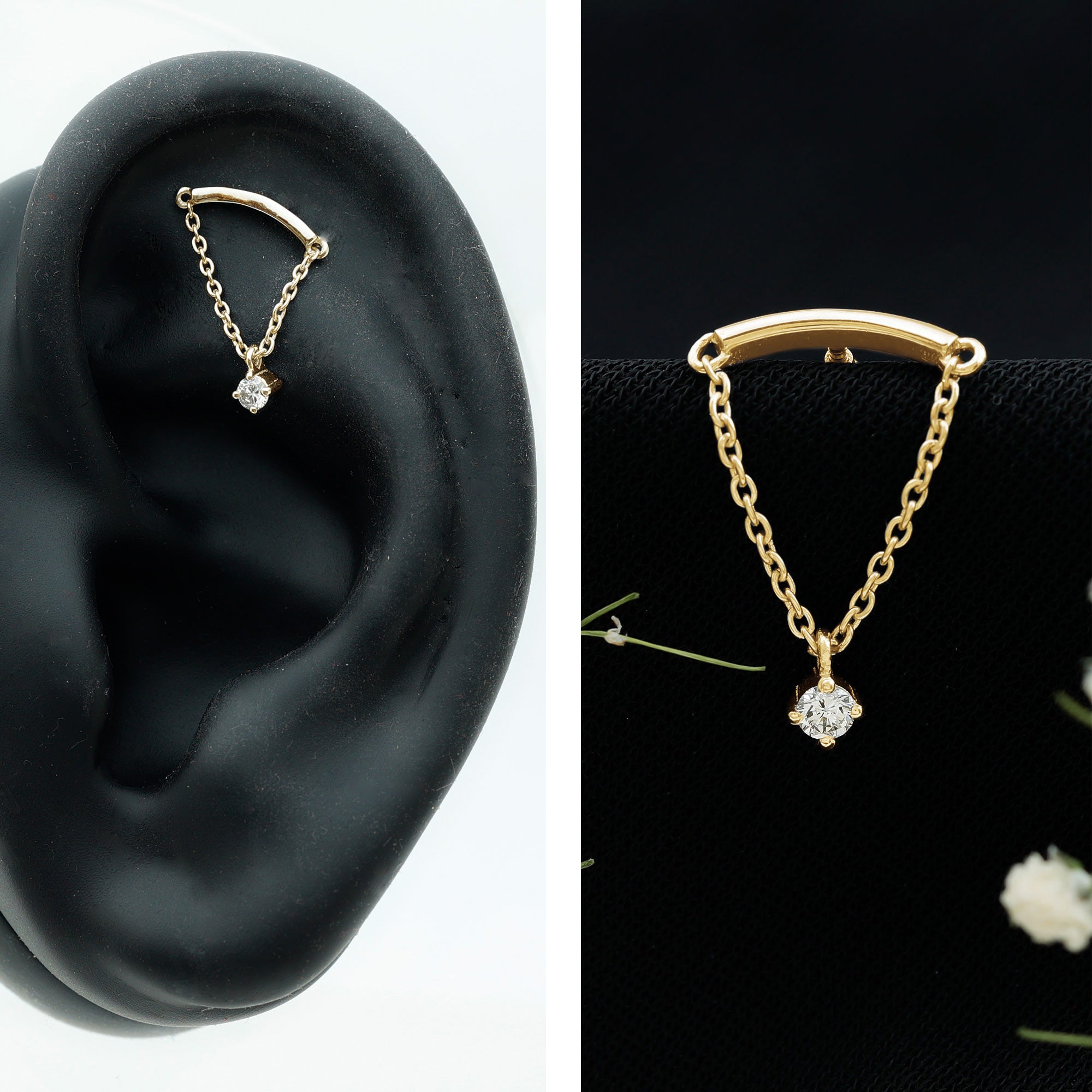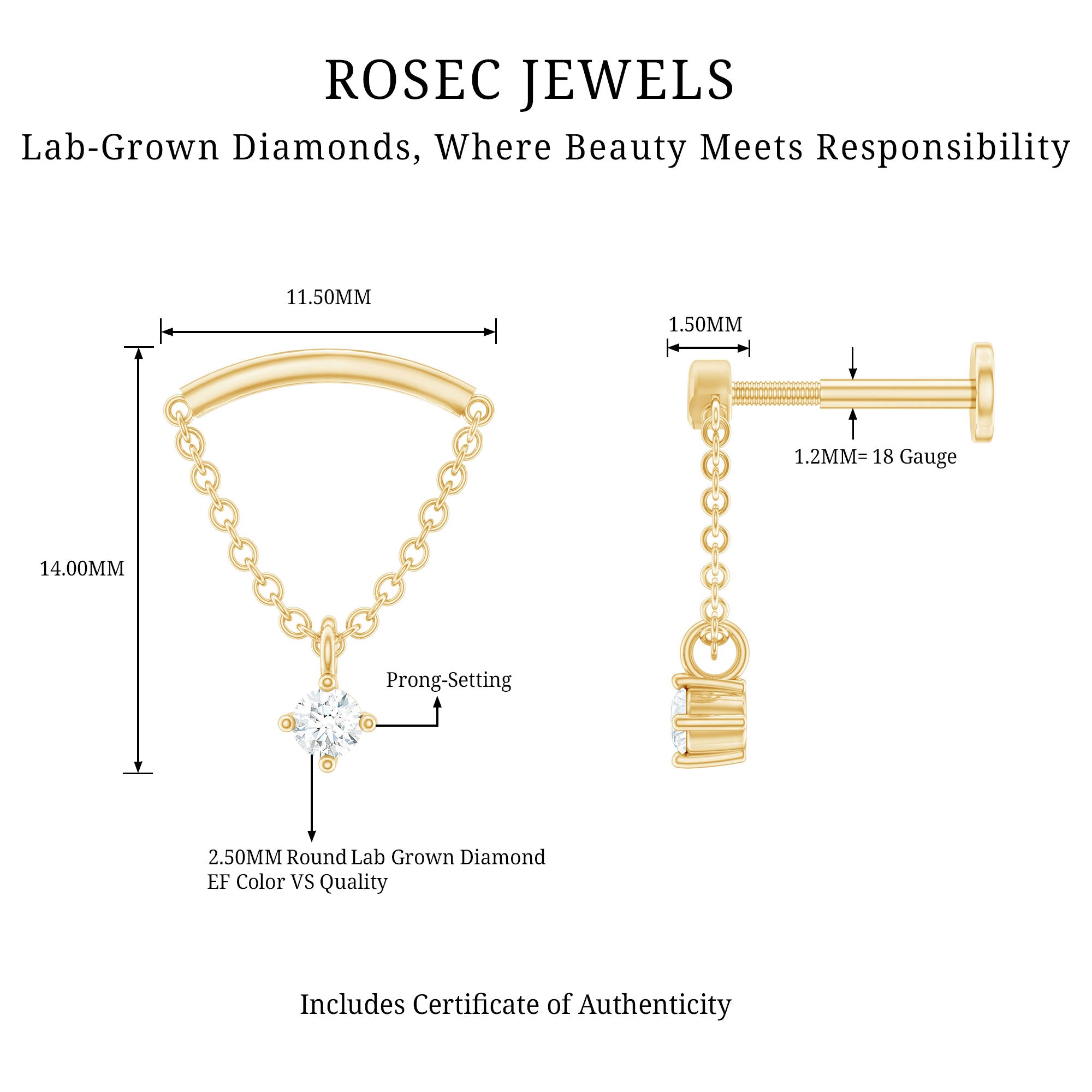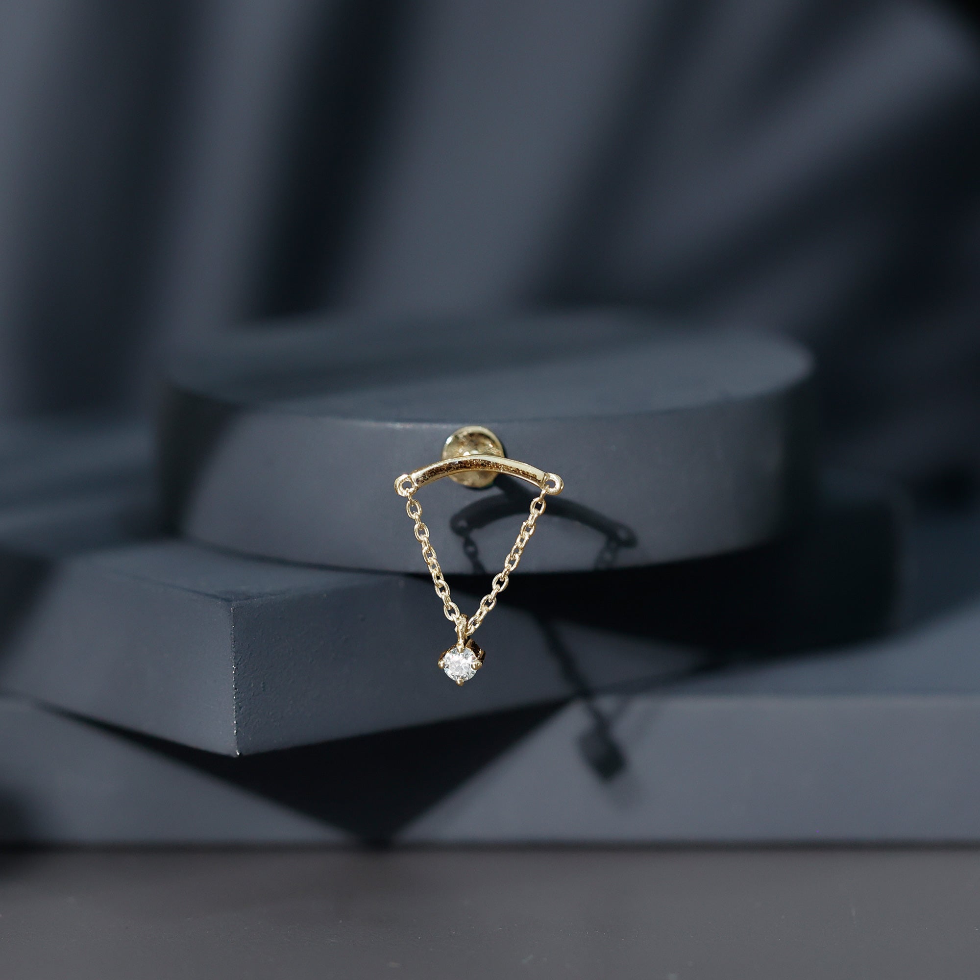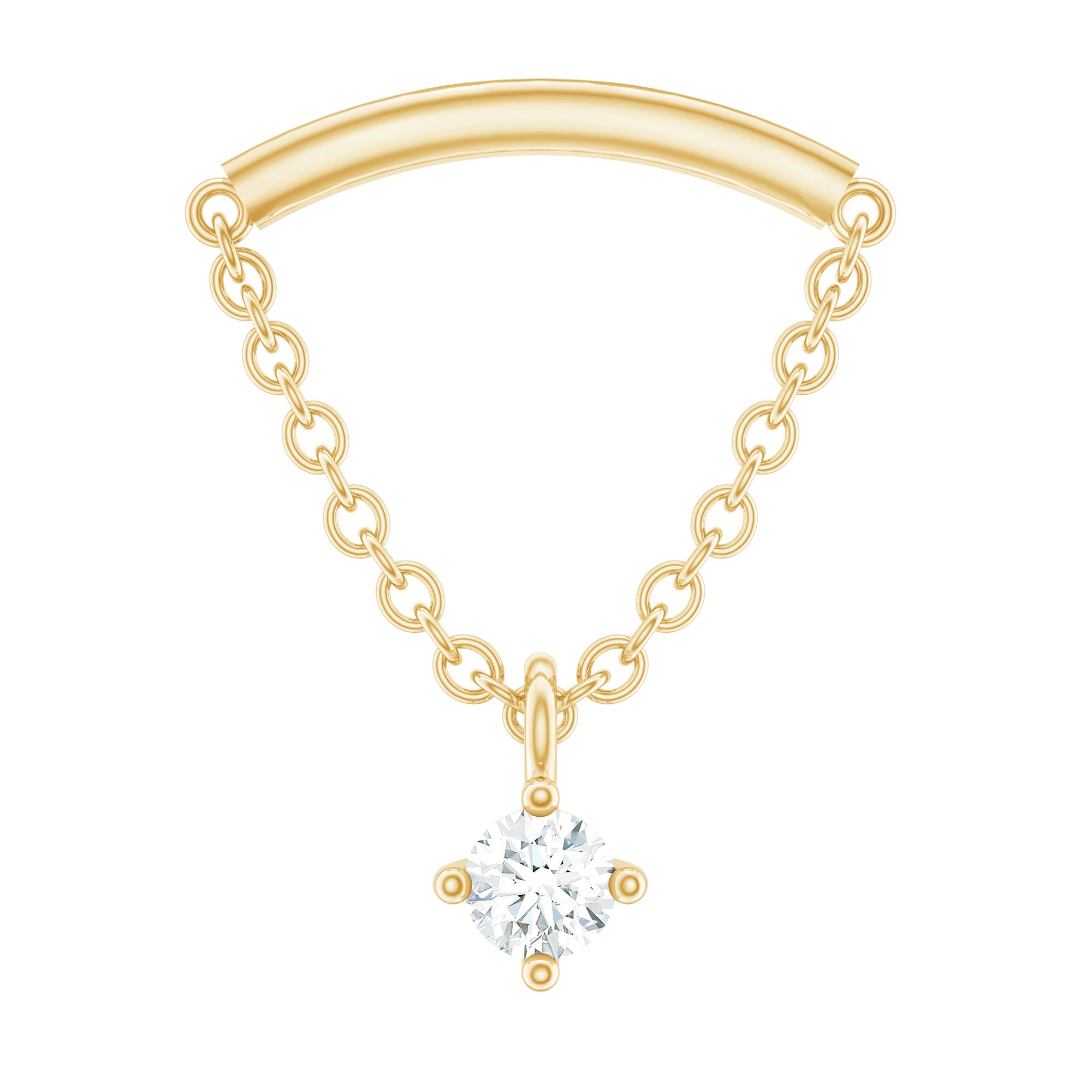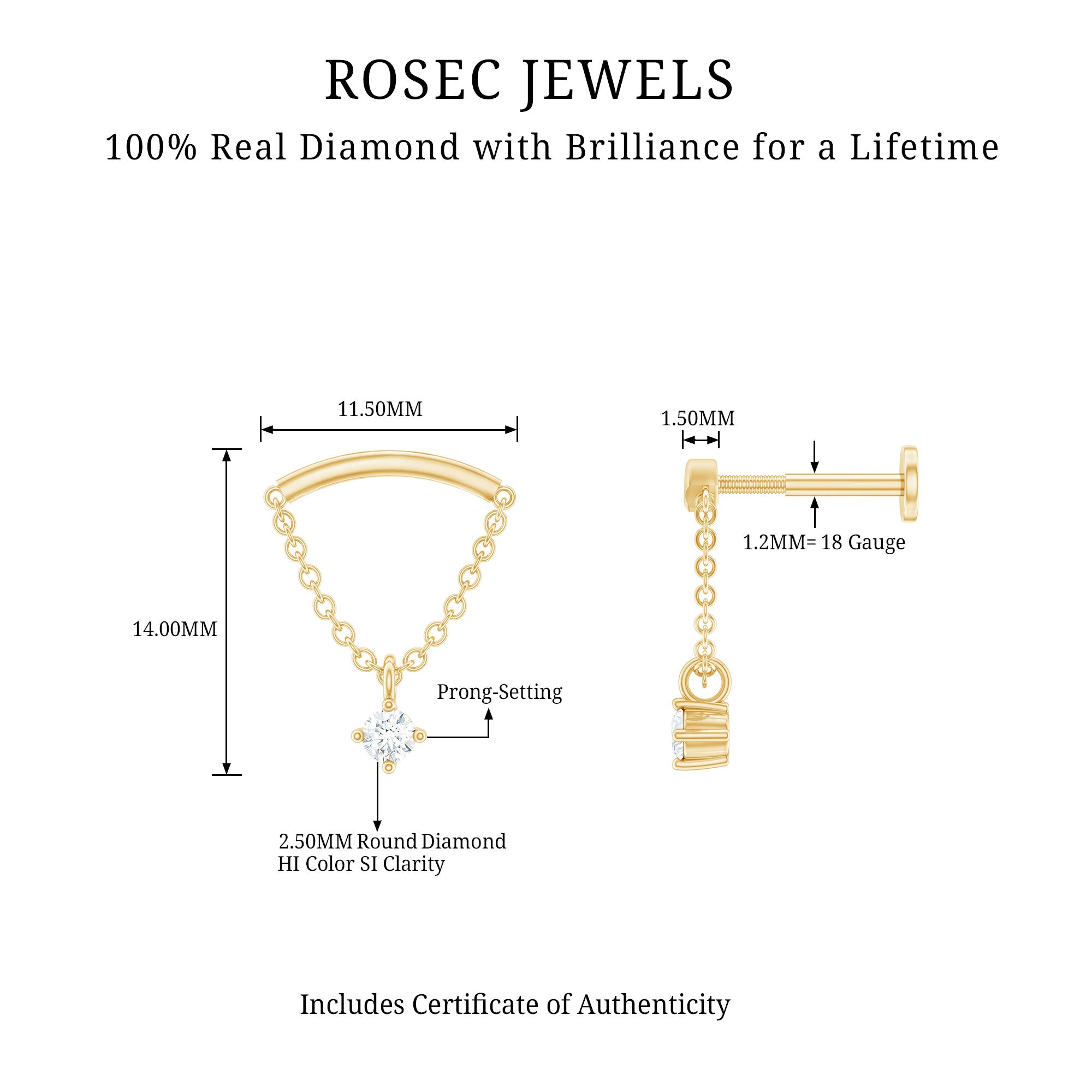 Here is something that will totally make you fall in love with piercing jewelry! Check out this Diamond Helix Earring that will help you shine and stand out. It features a curved bar on top that fits snugly into the fold of your ear, with a metal chain dangling a delicate Round Diamond held in place by prong setting, giving it a lovely dangly vibe. To take your look up a notch, mix this Diamond Chain Earring with your other piercing jewelry to nail your ear stack game. Flaunt your uniqueness and create a minimalist yet chic fashion statement with this Hidden Helix Earring, guaranteed to catch eyes with its dazzling sparkle or be admired for its distinct beauty. The striking simplicity of this classic earring is free from unnecessary frills, making it a sophisticated pick for any jewelry enthusiast who wants to carry themselves with elegance. Gift this Minimalist Dangle Earring to your daughter, sister, wife, or mom, and watch her face light up with joy.