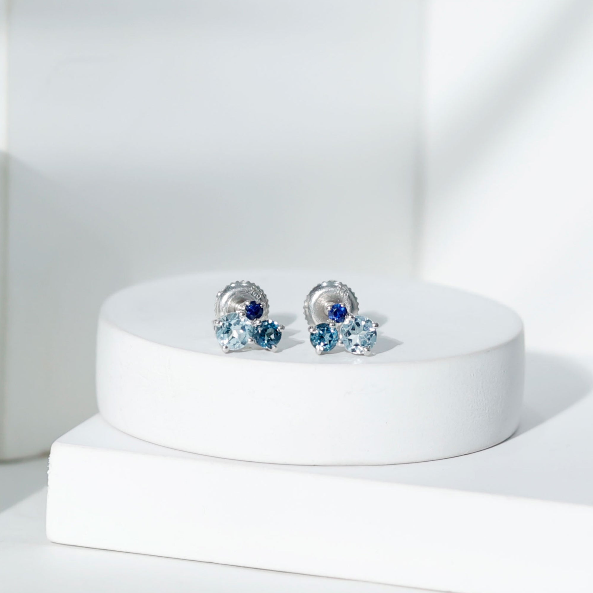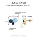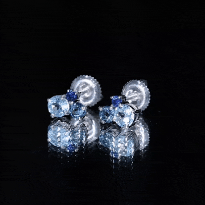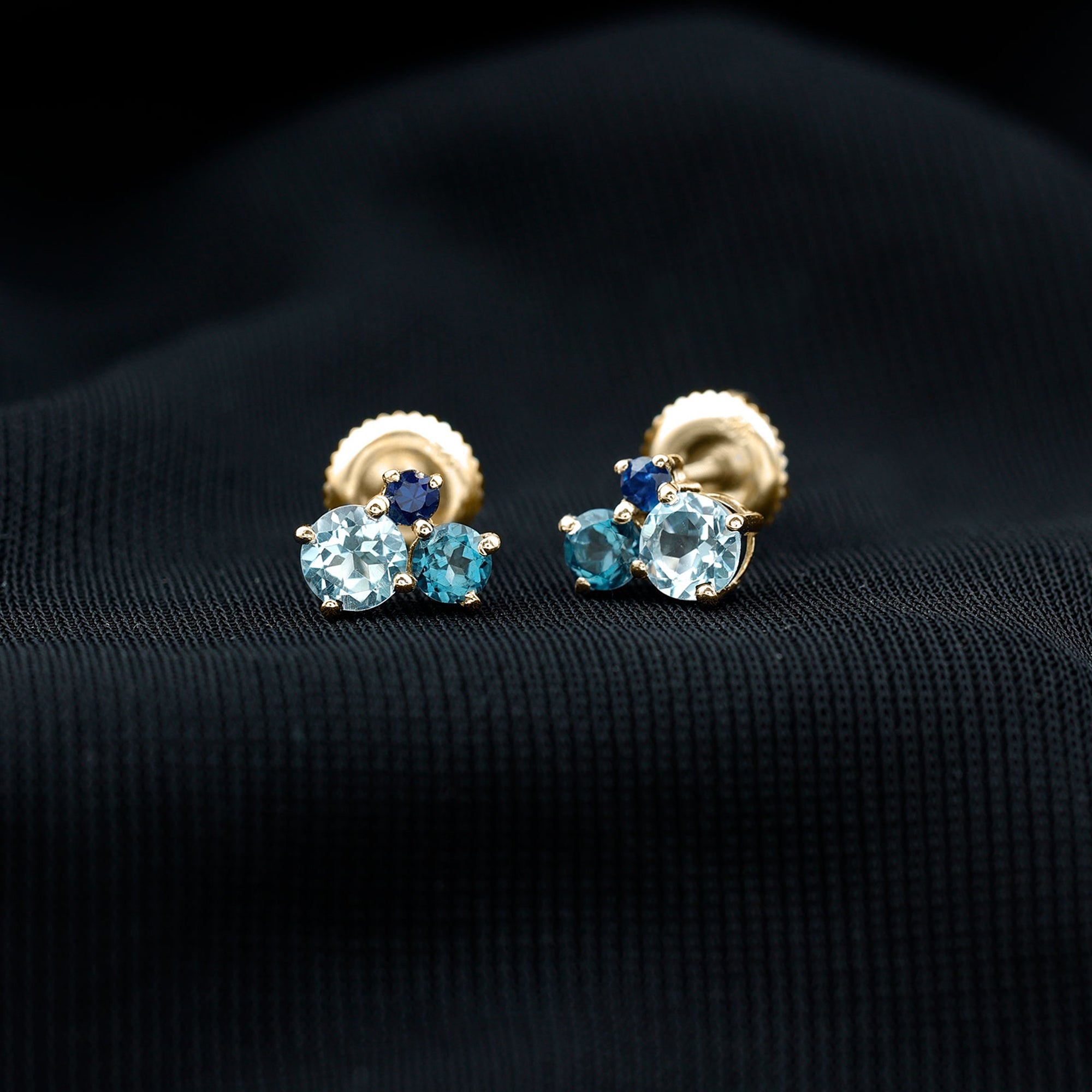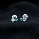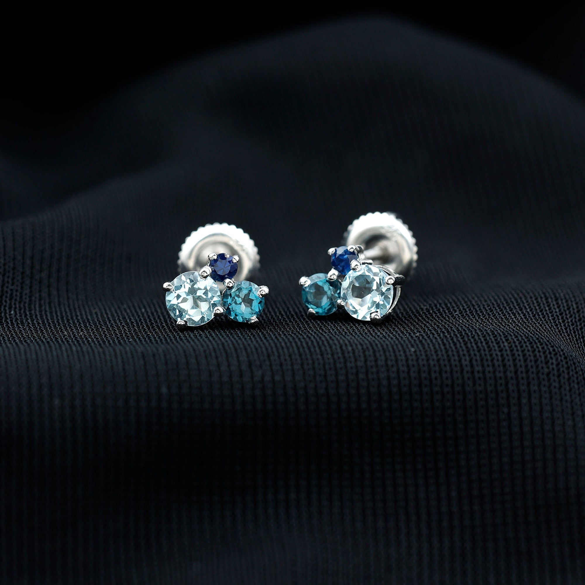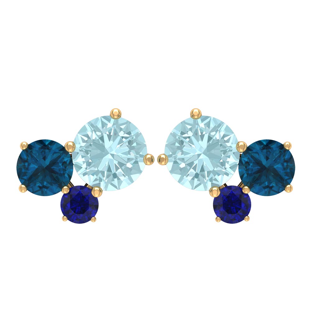These Three Stone Stud Earrings embellished with Round Shape Sky Blue Topaz, London Blue Topaz and Blue Sapphire Gemstones are set in a Prong Setting.
