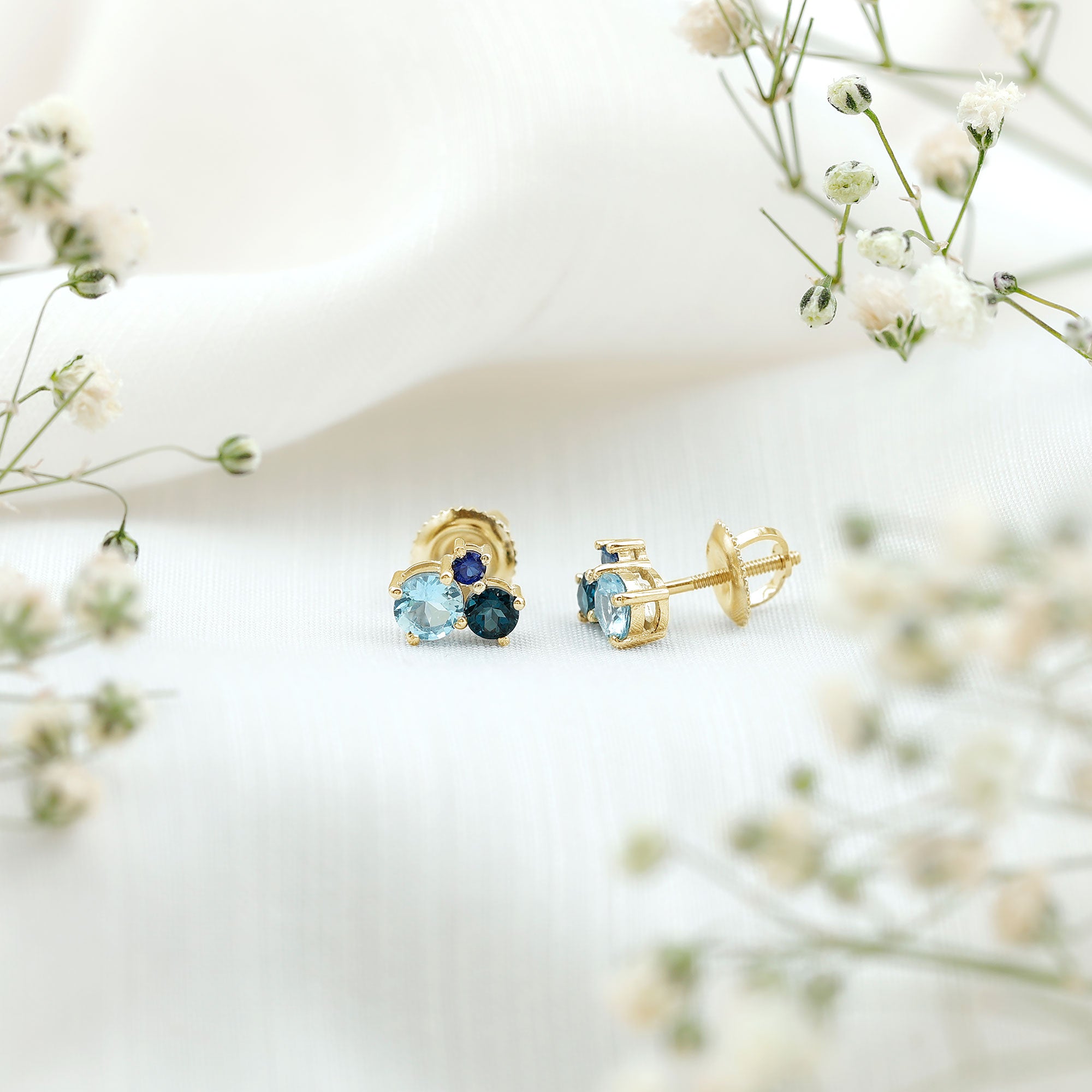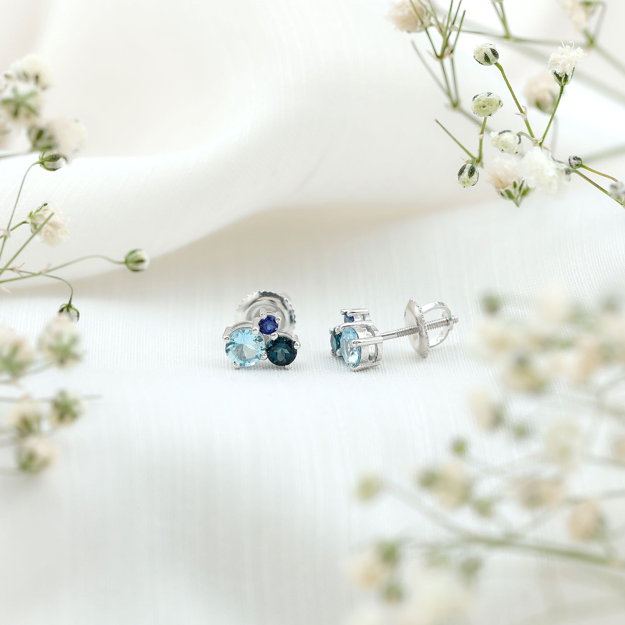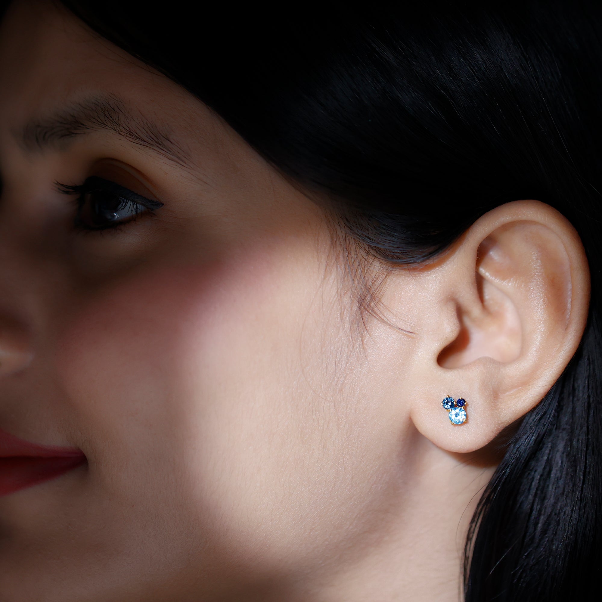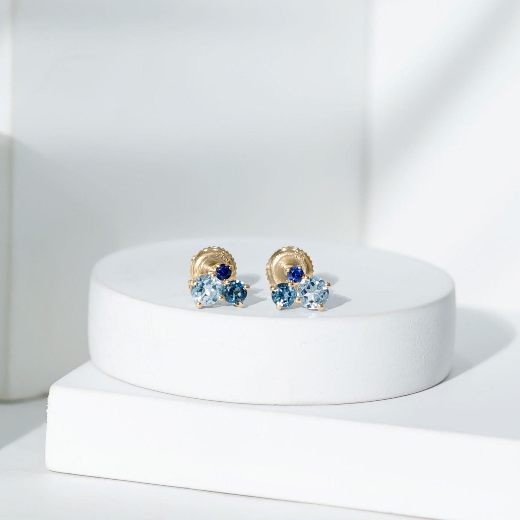 These Three Stone Stud Earrings embellished with Round Shape Sky Blue Topaz, London Blue Topaz and Blue Sapphire Gemstones are set in a Prong Setting.