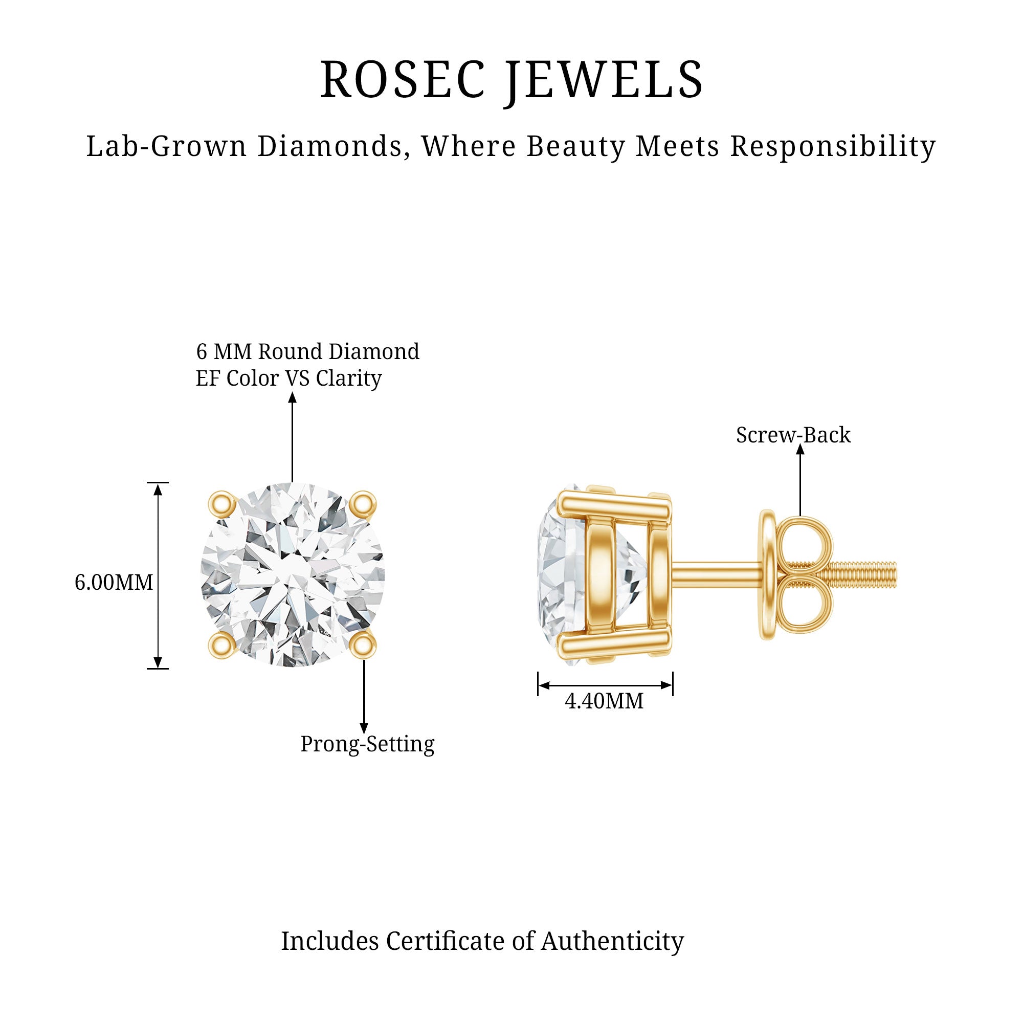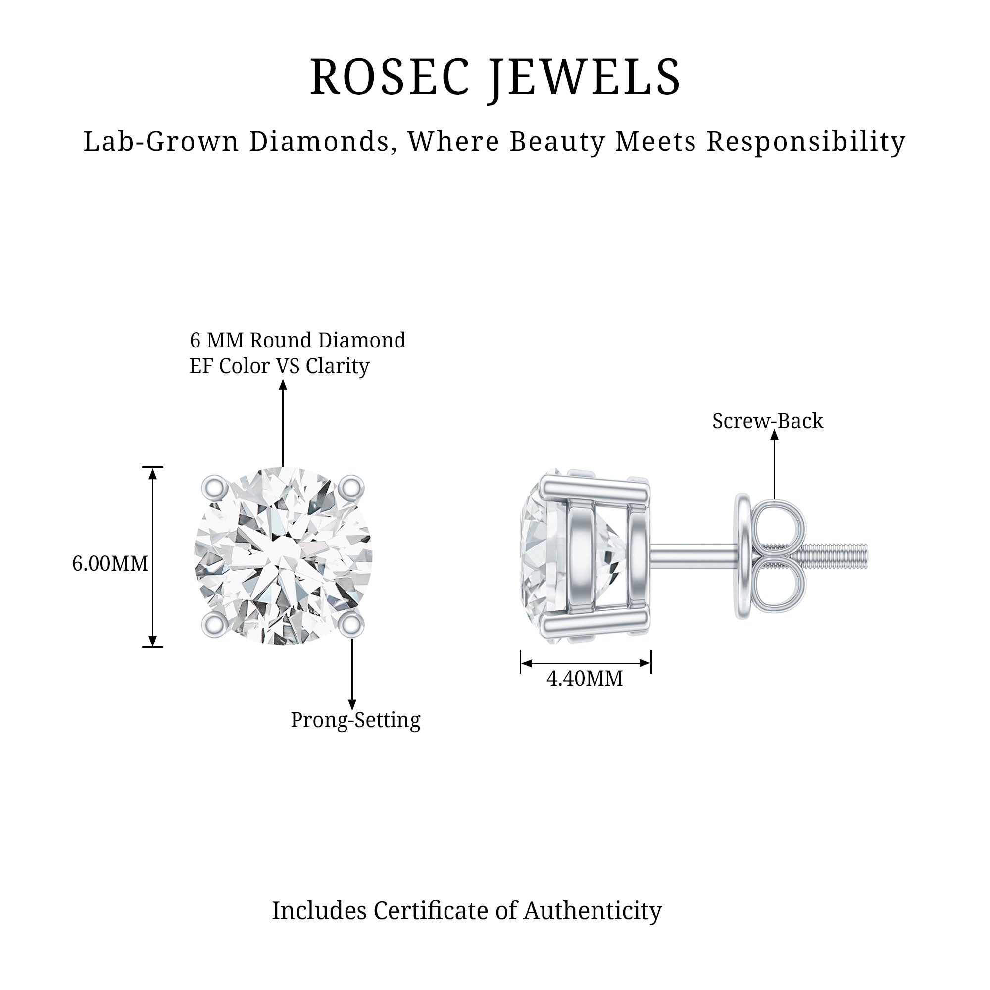 Grace your ears with timeless elegance by wearing these Solitaire Stud Earrings featuring a 6 MM round shaped diamond gemstone of EF-VS Quality set in prong setting. These Lab Grown Diamond Earrings come with screw back closure for secure wear throughout the day. Brought to you by Rosec Jewels, these Diamond Solitaire Earrings are handcrafted with ethically sourced, eco-friendly gemstones and come with a certificate of authenticity. Its a thoughtful and budget friendly choice for your daily wear or any meaningful occasion. You can customize these 2 Carat Diamond Earrings in available metal color options to reflect your unique style, making it a truly personal and thoughtful piece.