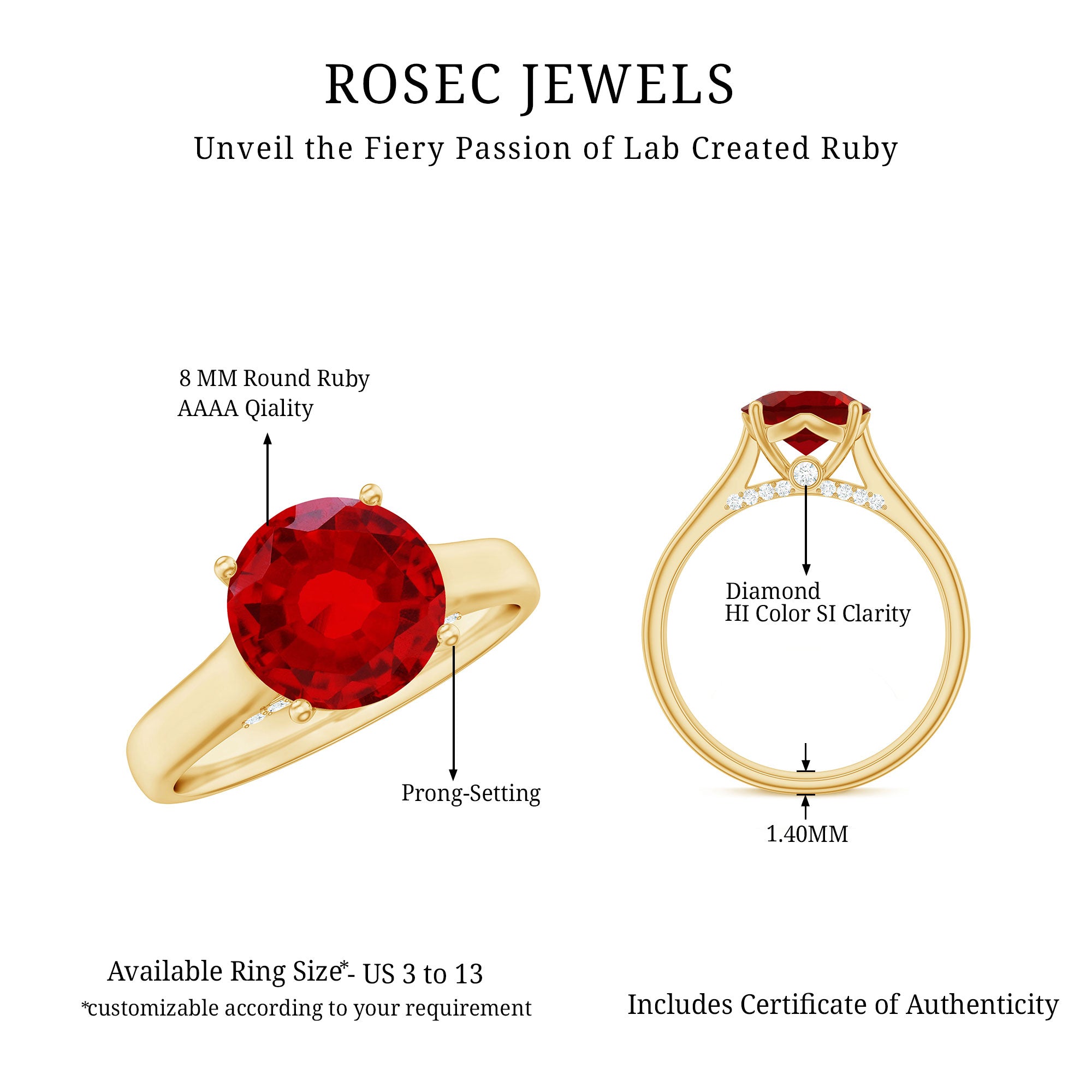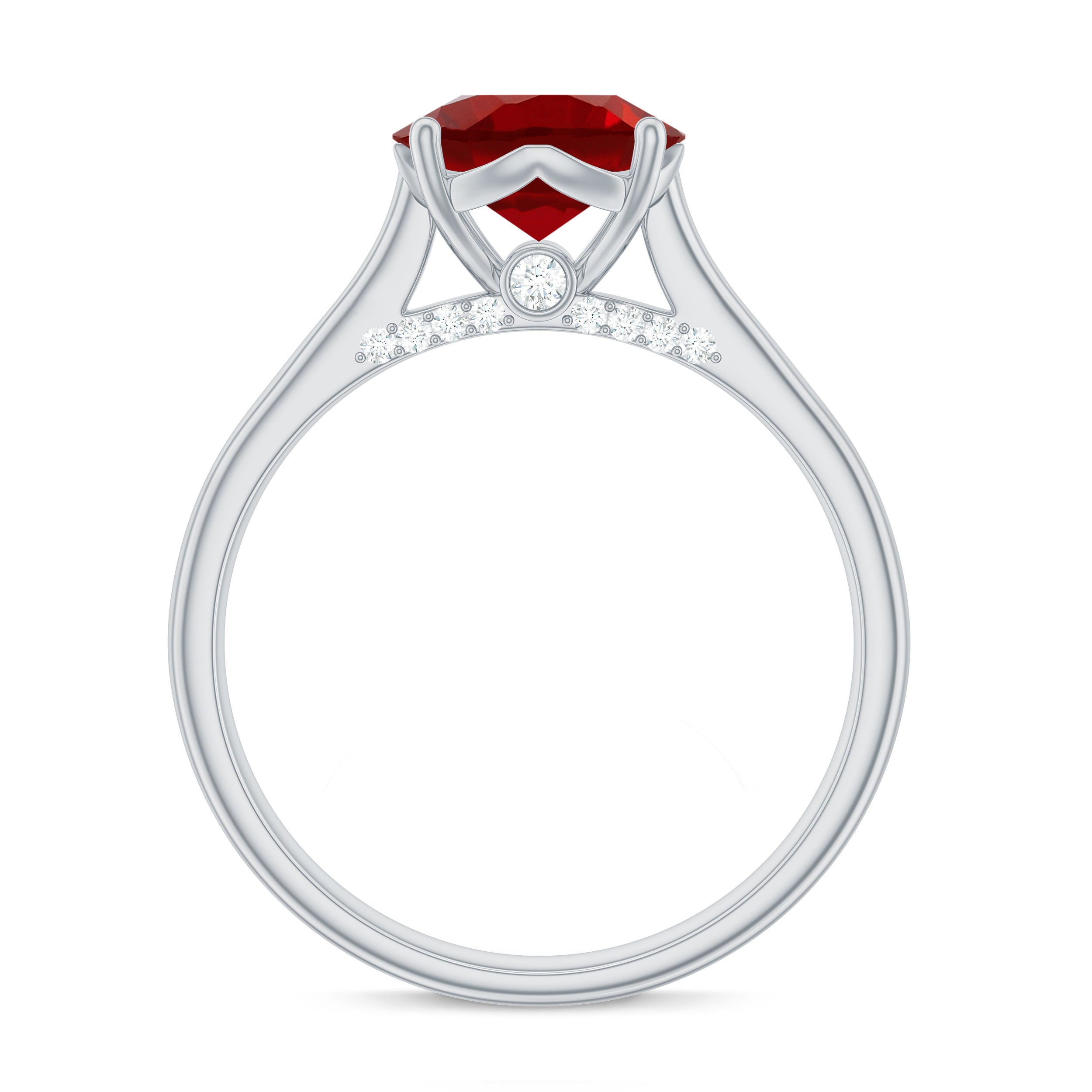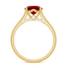Make your proposal moment even more special with this beautifully designed Lab Created Ruby Engagement Ring. At the heart of the Cathedral Engagement Ring sits a bold and brilliant 8 MM Round Cut Lab Grown Ruby, carefully held in prong setting. The center stone rests within a graceful cathedral style band, giving the ring an elegant and elevated look. Just beneath the main stone, round diamonds are hidden as a delightful surprise, adding a soft sparkle from a unique angle. The AAAA quality ruby and HI-SI quality diamonds create a beautiful balance of rich red color and shimmering white brilliance. This thoughtful mix gives the Ruby Solitaire Ring a timeless charm, making it perfect for a romantic proposal or a meaningful promise. Whether worn every day or saved for special occasions, this Solitaire Engagement Ring brings grace and beauty to any moment. It is ideal for those who love elegant designs with a small twist and want their ring to feel both classic and personal. Comes packaged in a lovely jewelry box, ready to make memories.