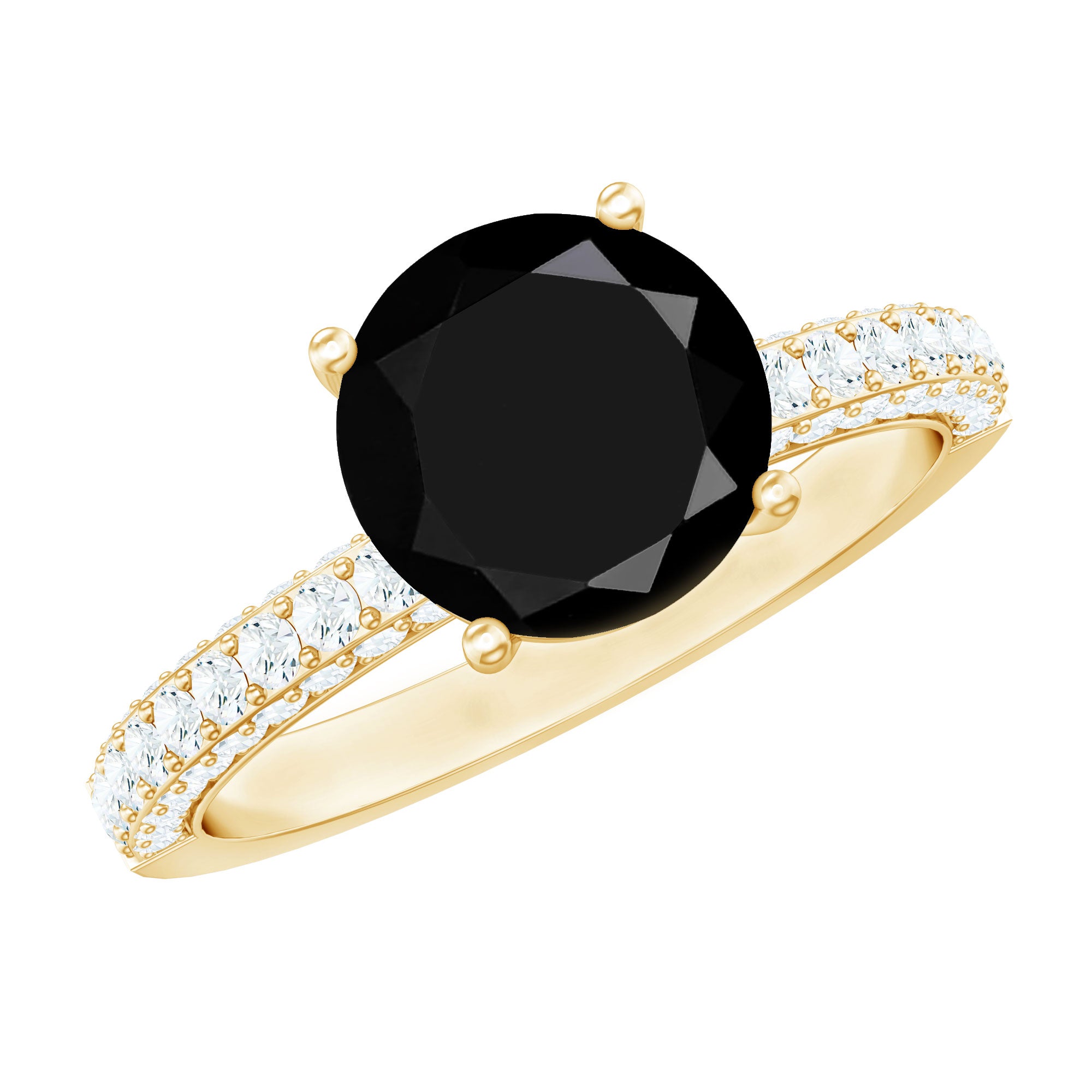 Black onyx is valued for its rich, opaque appearance and modern appeal in fine jewelry. As a natural gemstone, it may display subtle individual characteristics. Moissanite is known for its brilliance and durability, making it suitable for everyday engagement wear when properly cared for.