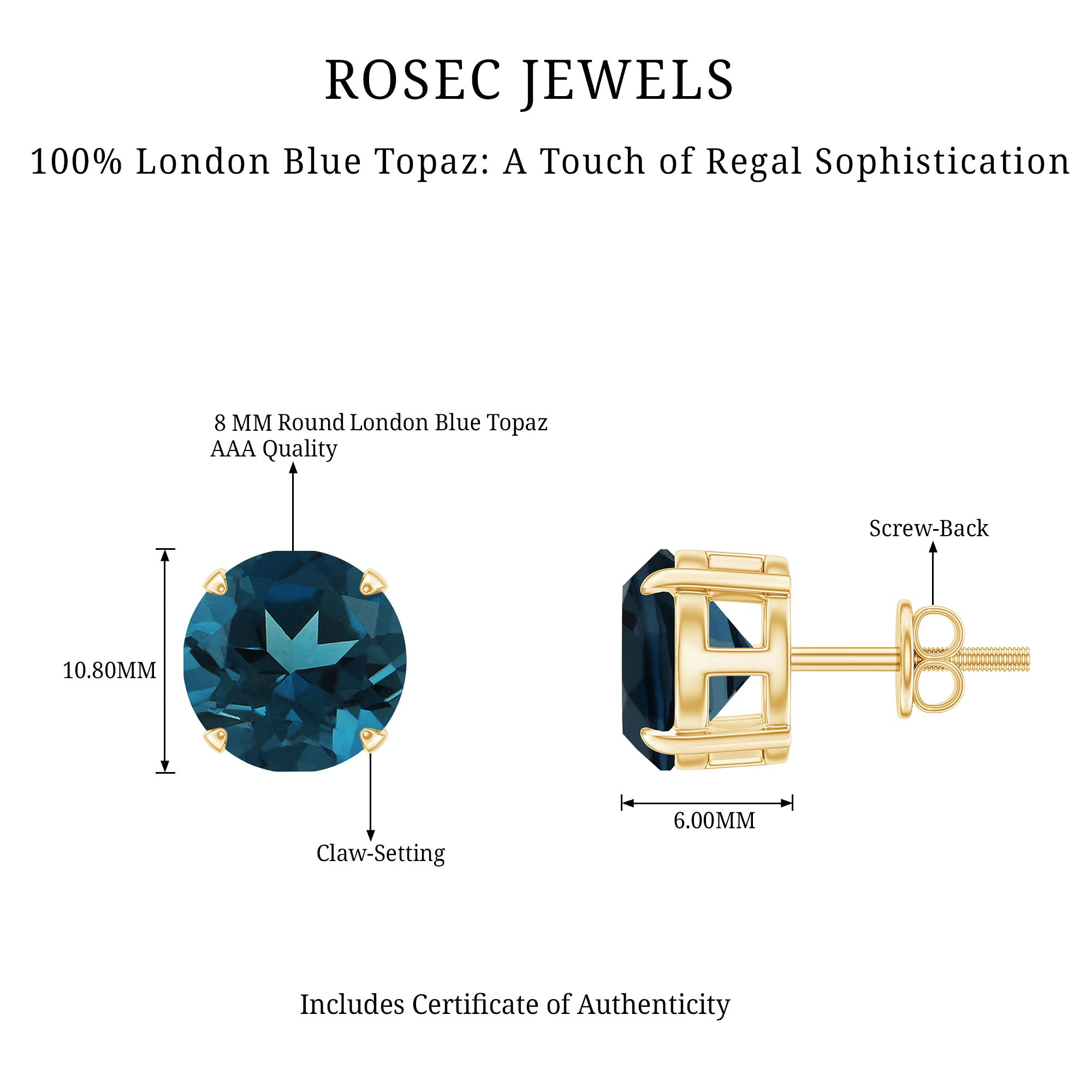 These Solitaire Stud Earrings feature an 8 MM London Blue Topaz, also known as the December birthstone. The deep blue color of the gemstone adds a calm and stylish touch to any outfit. Each topaz is set securely in claw setting with screw back closures, keeping the Everyday Stud Earrings safe and comfortable to wear all day. Designed for everyday use, these London Blue Topaz Earrings mix simplicity with elegance. The classic round shape makes them easy to pair with any look, perfect for both casual days and special occasions. The design lets the gemstone shine naturally, giving a soft sparkle that looks beautiful. These AAA quality London Blue Topaz Stud Earrings are timeless pieces that never go out of style. They are light, easy to wear, and add just the right amount of shine without being too bright. They also make a thoughtful gift for someone born in December or anyone who loves meaningful jewelry. Whether for a birthday, holiday, or personal treat, these studs are a lovely way to show care and appreciation. Simple, elegant, and full of color, they are sure to become a favorite piece to wear every day.