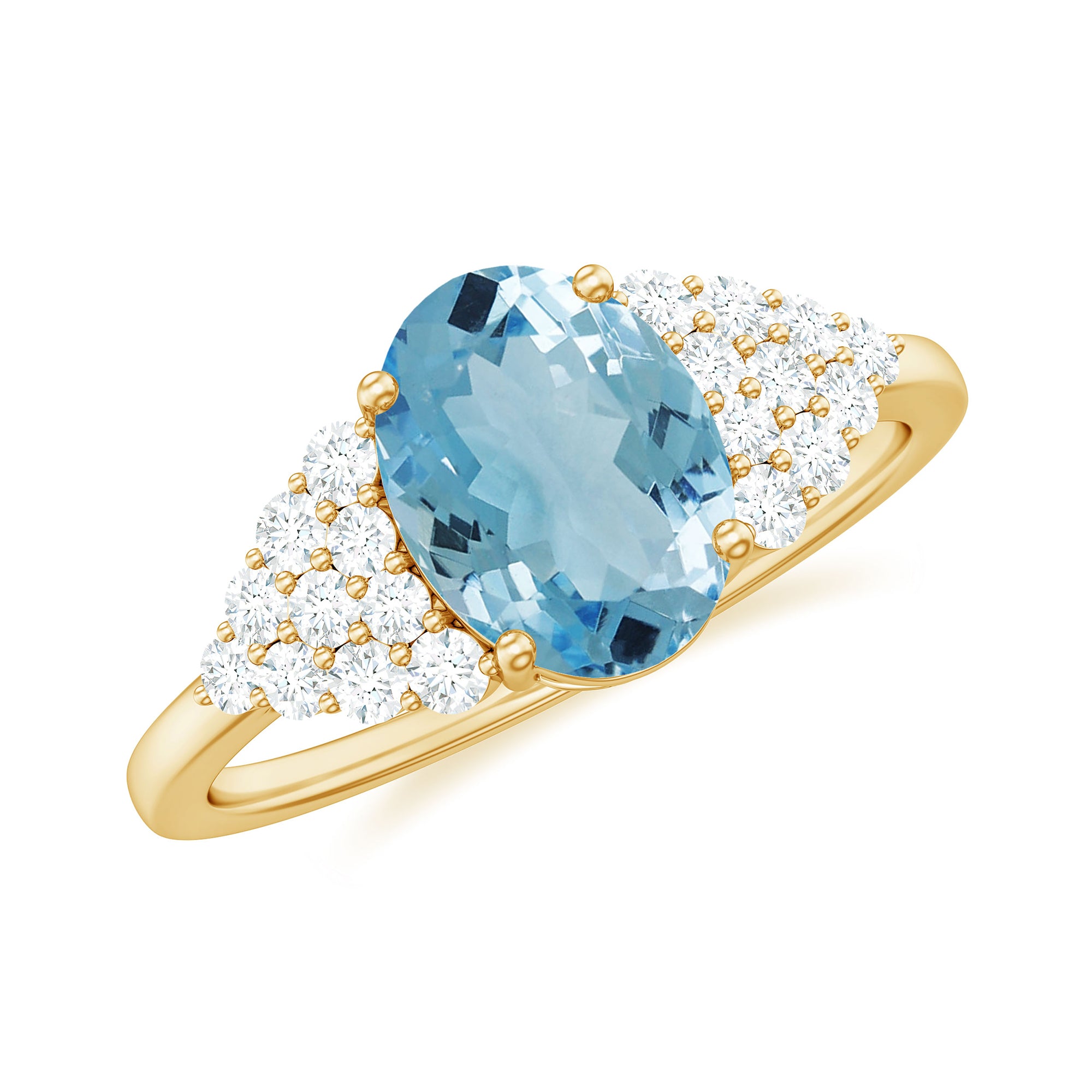 Profess your undying love for the woman of your life with this Oval Solitaire Engagement Ring. This Gold Engagement Ring is embellished with Oval Shape Aquamarine as a solitaire in a prong setting with round Diamond cluster in a prong setting. This Aquamarine Engagement Ring is available in gold metal.