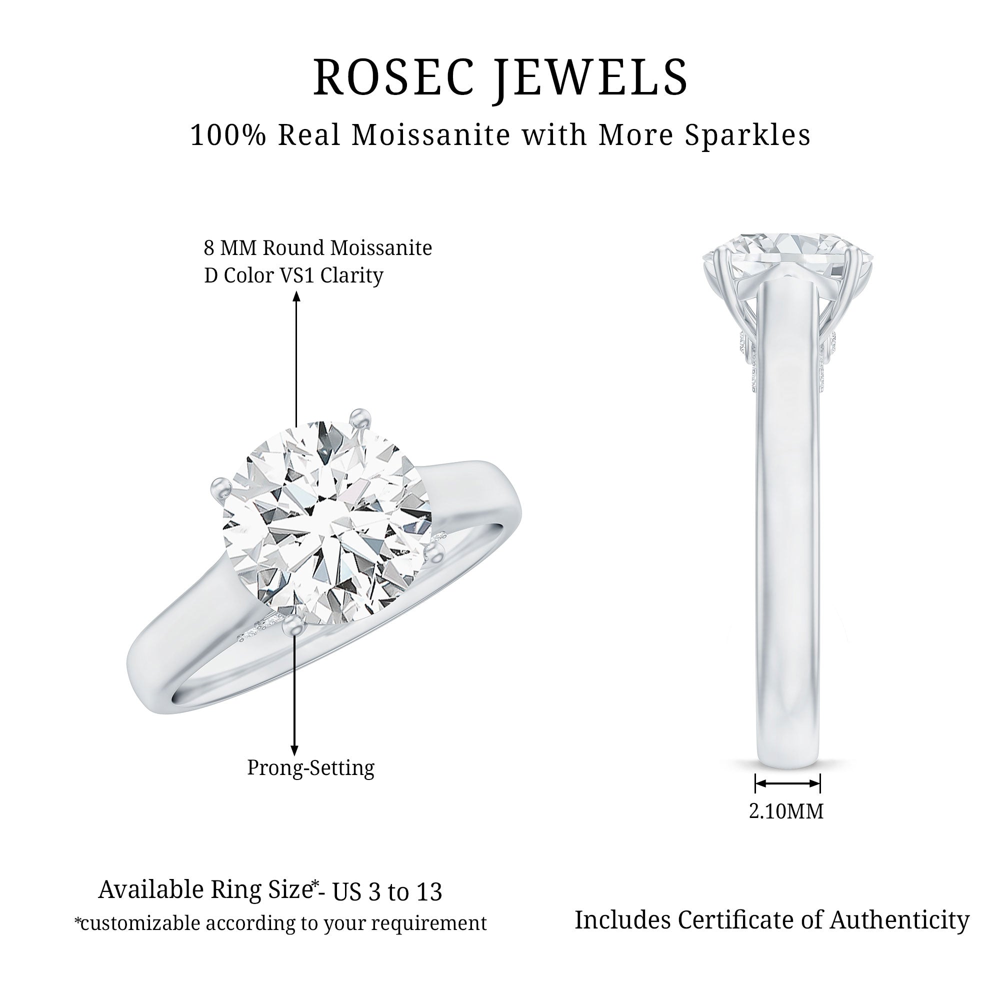 Effortlessly elegant and timelessly refined, this Solitaire Moissanite Engagement Ring proves that true beauty lies in simplicity. At its center, an 8 MM round cut moissanite shines with breathtaking brilliance, securely held in prong setting. Subtle surprise stones tucked beneath the center gem add an unexpected touch of sparkle, making this Solitaire Engagement Ring feel even more special and unique. The cathedral style band gracefully elevates the center stone, allowing more light to pass through and enhancing its natural fire. Designed with a smooth, simple band, this Cathedral Engagement Ring captures a delicate balance between modern sophistication and timeless charm. Crafted with care, this piece is perfect for anyone who values both beauty and meaning. This 2 Carat Moissanite Ring arrives in a thoughtfully crafted jewelry box, ready to gift or keep safe as a treasured keepsake. Available in multiple sizes to ensure a flawless fit, this Round Moissanite Ring is a bold yet understated symbol of love, never too flashy, never too simple, but just right. Let it be the piece that captures your forever with grace, brilliance, and meaningful elegance.