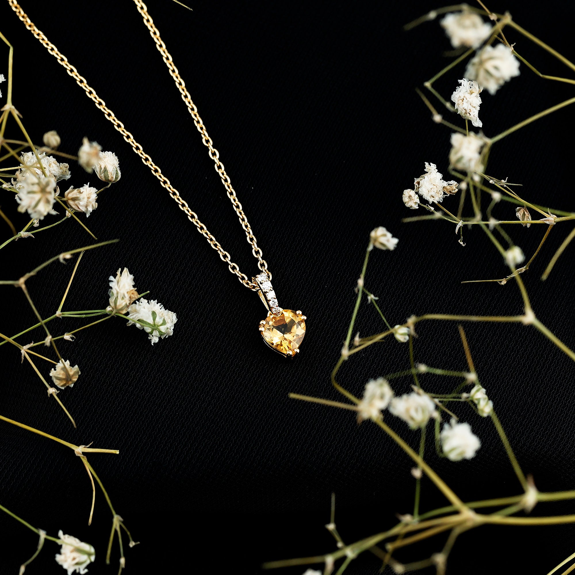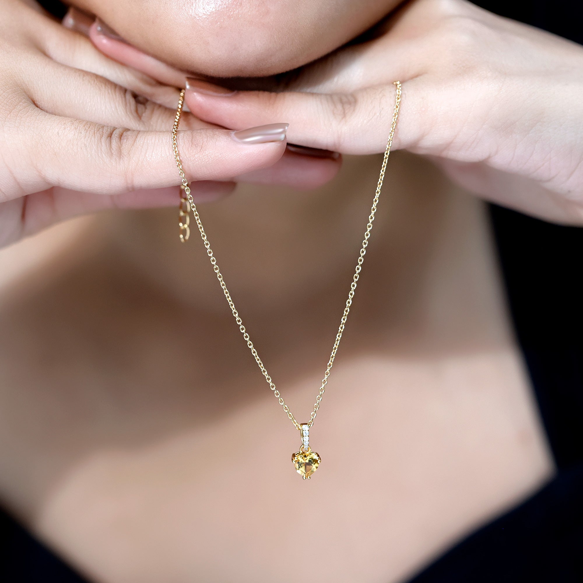 This radiant Solitaire Pendant Necklace features a stunning 6MM Citrine, the vibrant November birthstone, nestled in secure double prong setting that allows its sunny hue to shine from every angle. Crafted in luxurious 14k yellow gold plated sterling silver, the Heart Pendant glows with a rich warmth that beautifully complements the golden tones of the gemstone. A touch of sparkle comes from round cut lab grown diamonds, delicately set along the bail, adding elegance and brilliance without taking attention away from the heart of the design. The sleek, gold plated chain is designed for effortless wear, allowing the Citrine Pendant to sit gracefully at the neckline, perfect for everyday elegance or meaningful gifting. Whether you are celebrating a birthday, a milestone, or simply want to share a symbol of love and positivity, this Citrine and Diamond Necklace is designed to leave a lasting impression. Presented in a signature jewelry box, this Citrine Heart Necklace makes a thoughtful and meaningful gift for someone special, or a cherished piece for yourself. It is a celebration of warmth, joy, and golden moments.