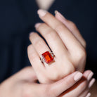 She will feel pleased when you present this dazzling Engagement Ring to her on your special day. Embellished with Octagon Cut Lab Created Orange Sapphire secured by Prong Setting. . The Solitaire Ring is phenomenal and will leave her mesmerized and in tears of joy and happiness.