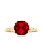 Celebrate the special occasion with your beloved by gifting this Classic Twisted Rope Ring. Adorned with a captivating Cushion Shape Created Ruby in a secure Prong Setting, this ring also features round-shaped Diamond stones set in a hidden setting, adding a touch of brilliance and sophistication. Its a timeless and elegant choice to mark your love and cherished moments together.