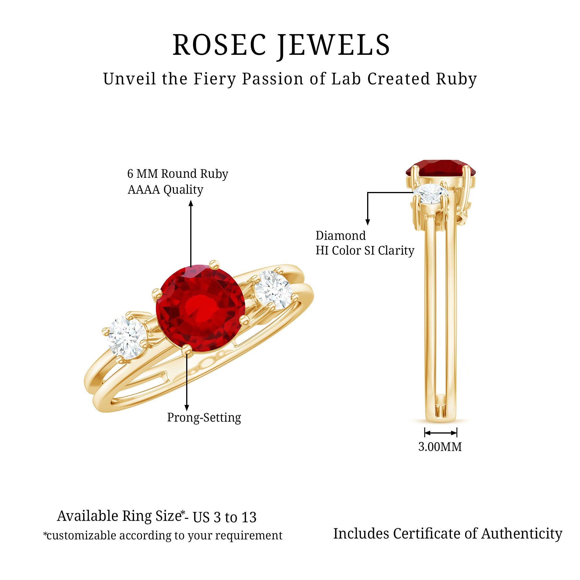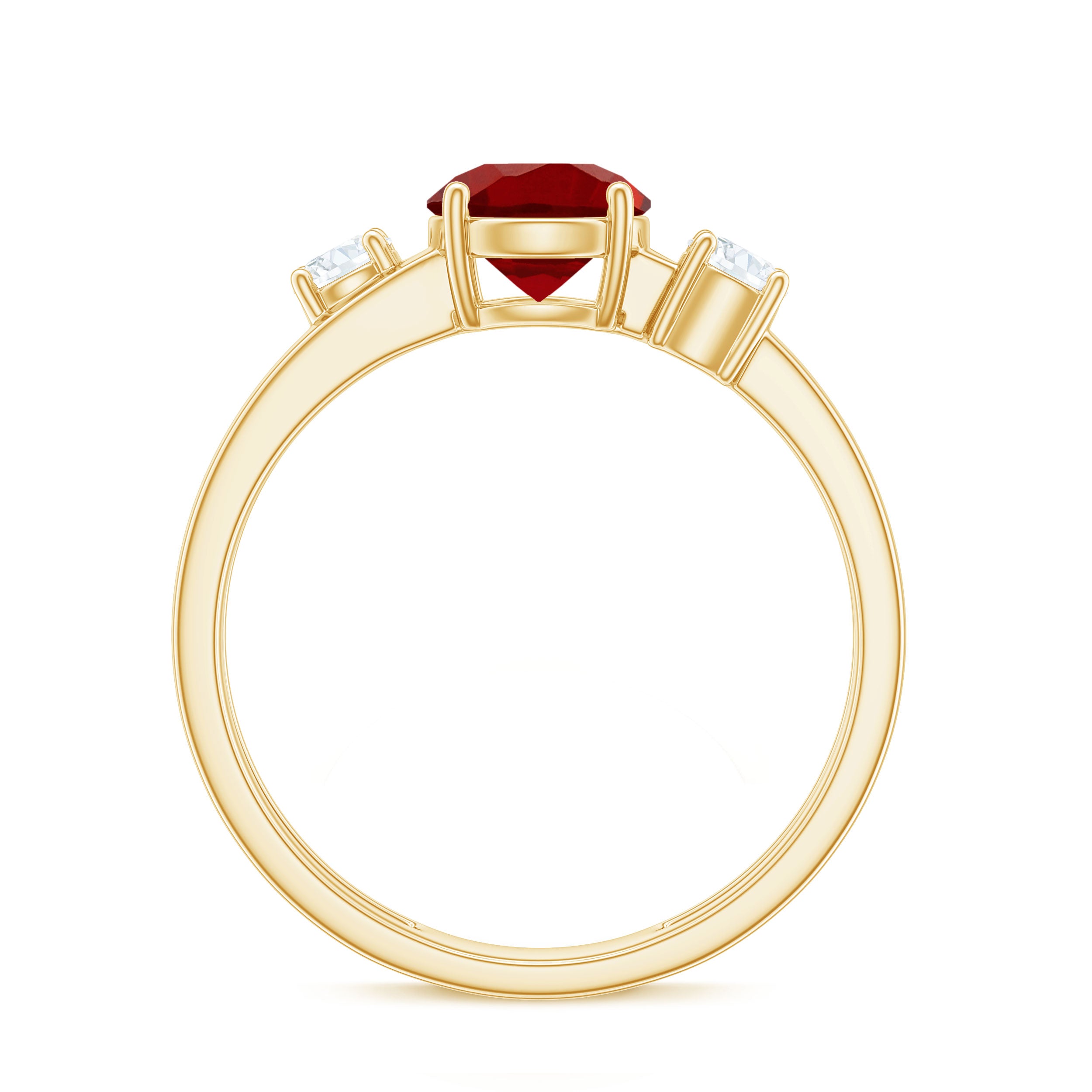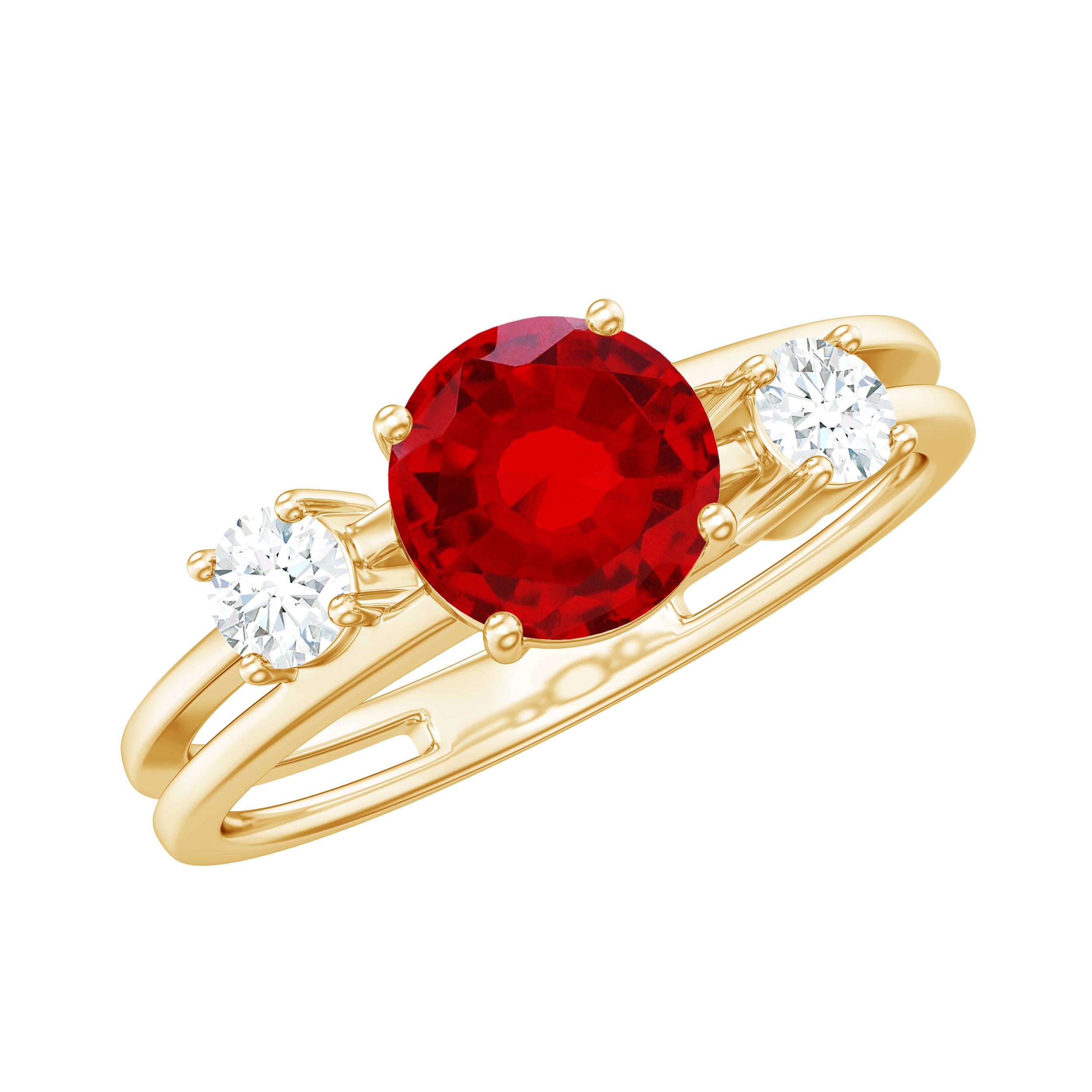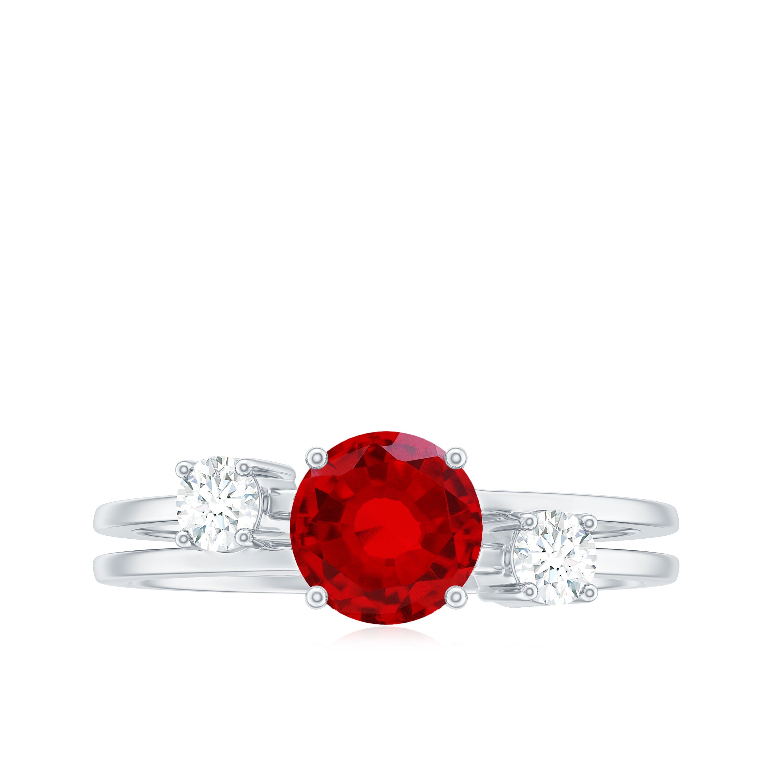 Adorned with a round shape created ruby, this dazzling ring is complemented by two round shape Diamond stones for added luster. The stones are elegantly set on a double-band shank, enhancing the classic style. If you love the 3-stone ring design, this is the perfect piece to grace your finger with dazzle and allure.