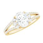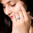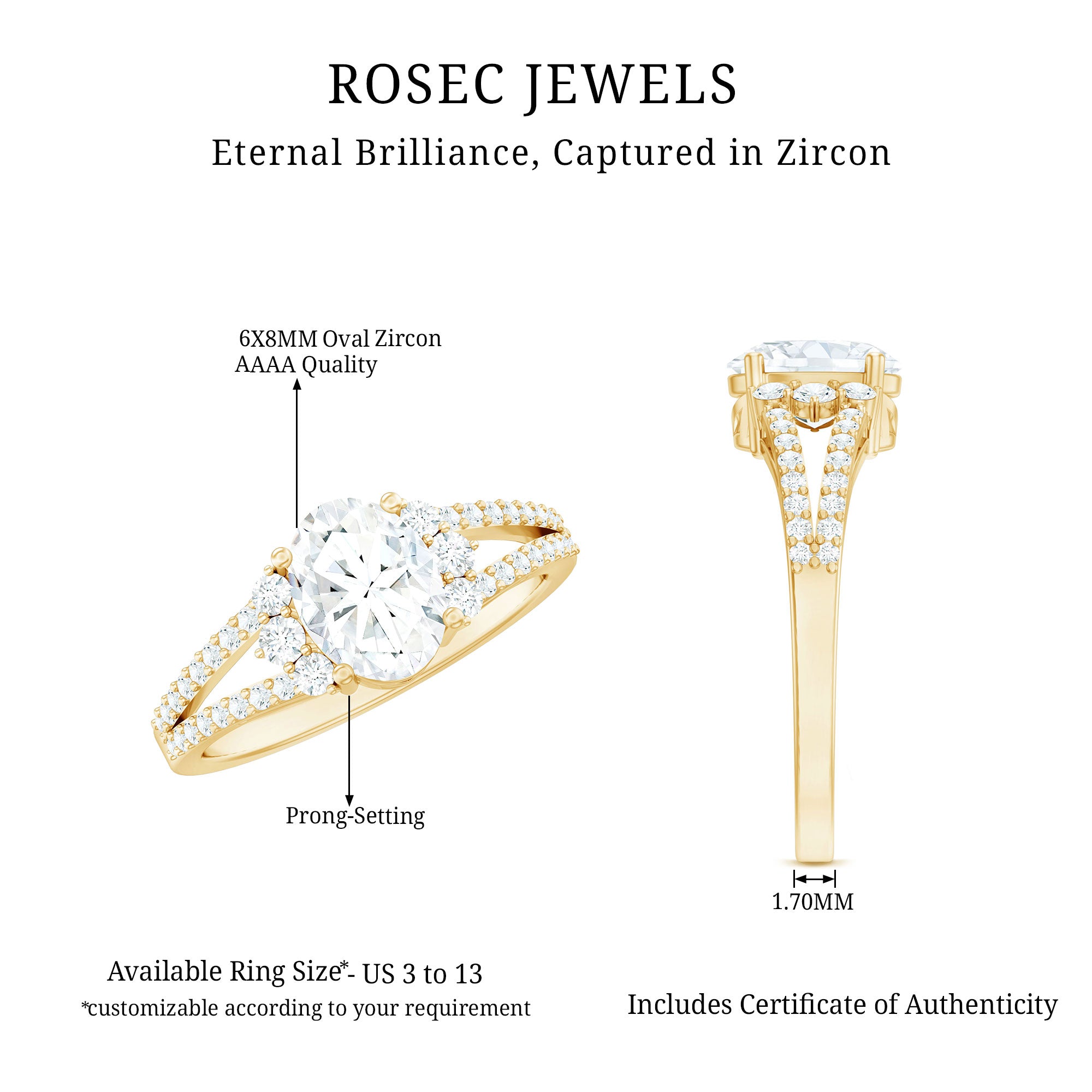 Make a sweet proposal with this Zircon Engagement Ring featuring an Oval Cut Cubic Zirconia secured by 4 Prong Setting, the center stone flanked by sparkling three Round Shape Cubic Zirconia. Additionally, Round Cubic Zirconia studded on the split shank. This Cubic Zirconia Ring for Women arrives in our ready-to-gift Signature Jewelry Box, present it as an Anniversary Gift, Birthday Gift for Her, and Valentines Day Gift.