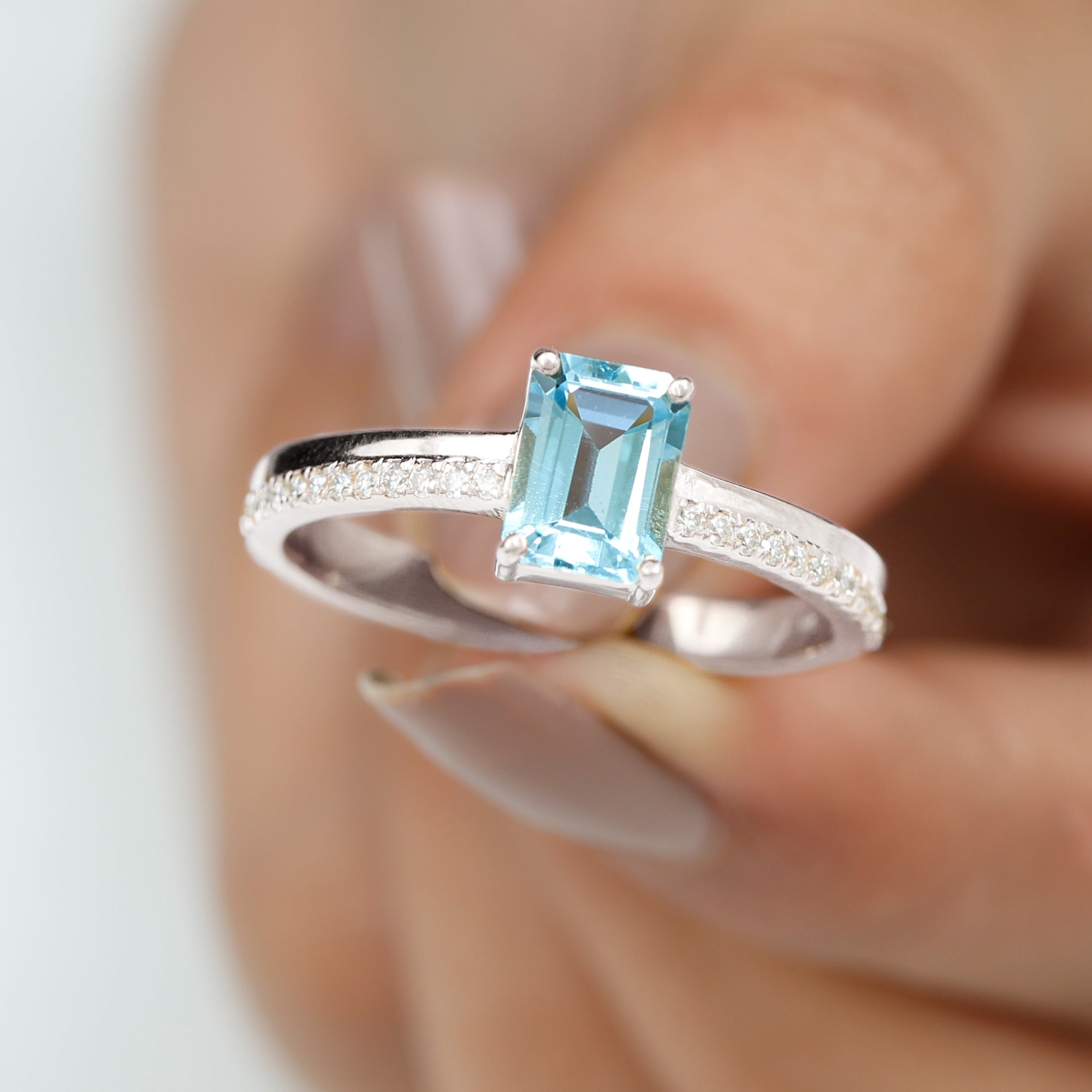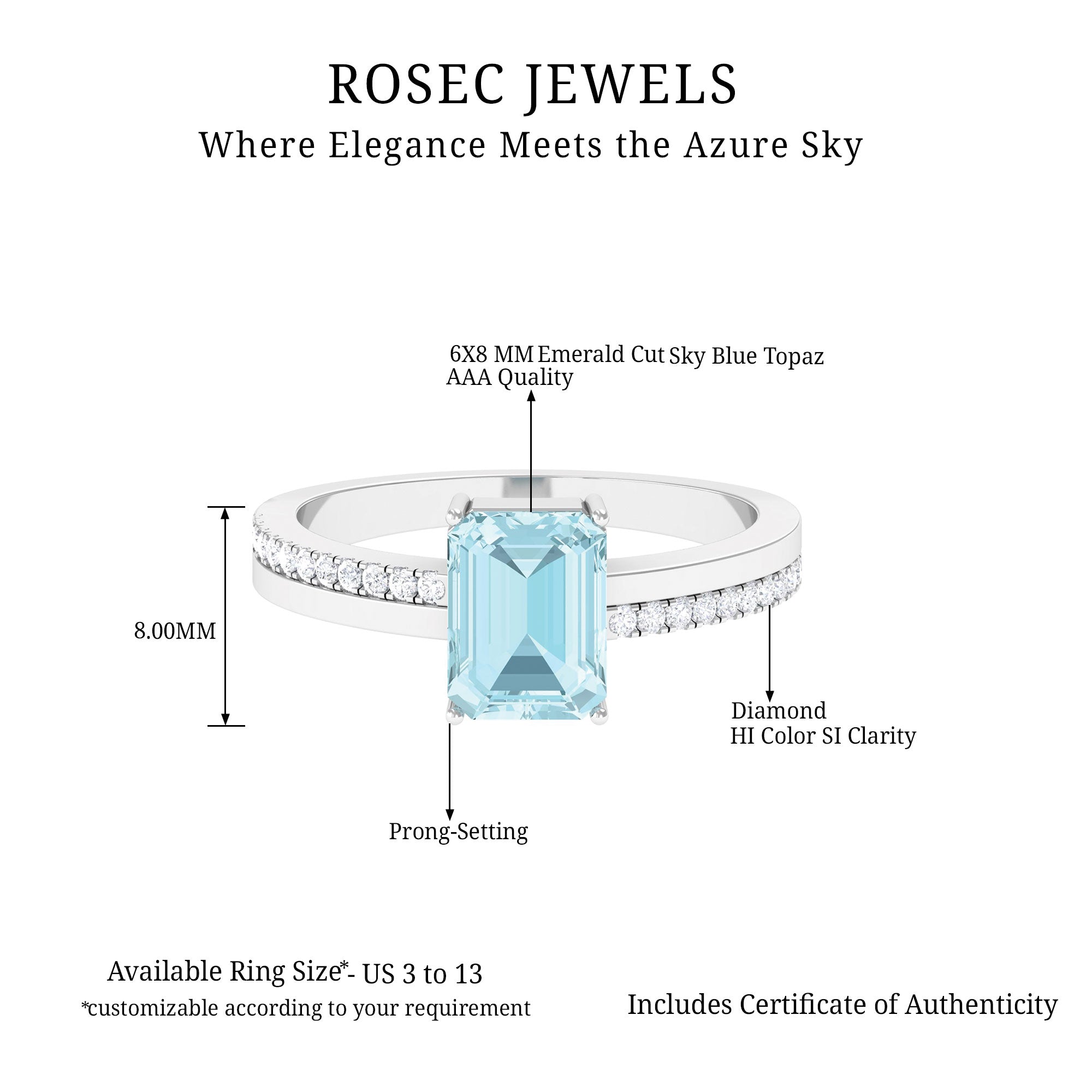 Solitaire Engagement Ring with Emerald Cut Sky Blue Topaz and Diamond