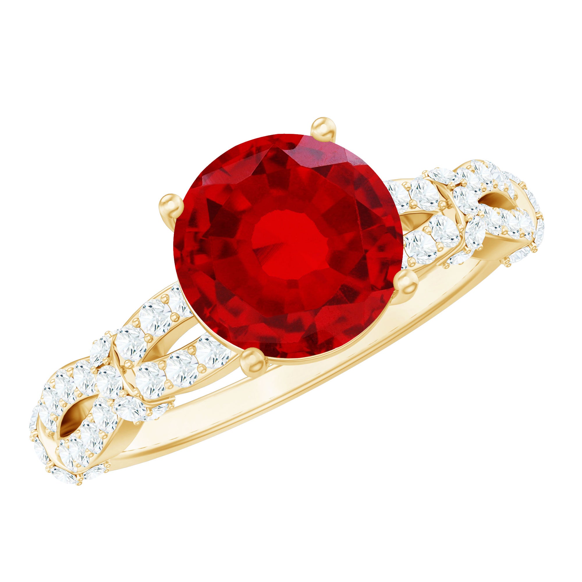 Designed to capture the magic of two hearts coming together. At the heart of this Solitaire Engagement Ring sits a stunning 8 MM round cut lab created ruby, shining bright and full of passion. The band adds a creative twist with diamonds that crisscross gently, making the design eye-catching and different from the usual. There is a sweet surprise too, a secret diamond set right beneath the main stone, adding a hidden touch of romance only you will know about. This Ruby and Diamond Engagement Ring is all about showing how your lives are connected and how your love grows stronger every day. With its mix of classic charm and modern style, this Crossover Engagement Ring is a symbol of your promise, a beautiful reminder of your journey together. Whether you are planning to pop the question or want a meaningful way to show your commitment, this Lab Created Ruby Ring is made to be cherished forever. Simple yet striking, it is the perfect way to tell your love story without saying a word. Available in US sizes 3 to 13 and crafted for a comfortable fit, it arrives in a luxury jewelry box, ready to be gifted and treasured forever.