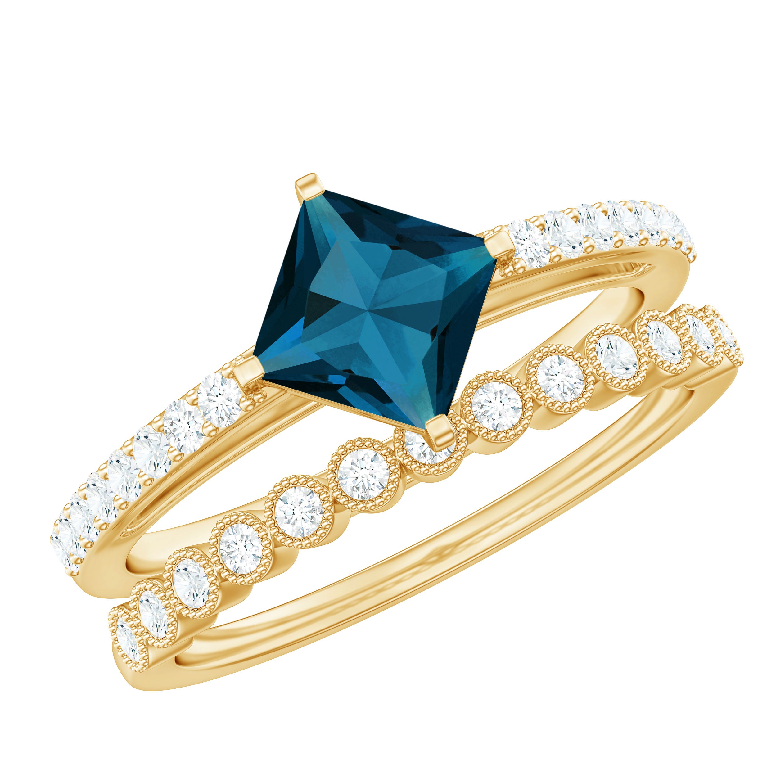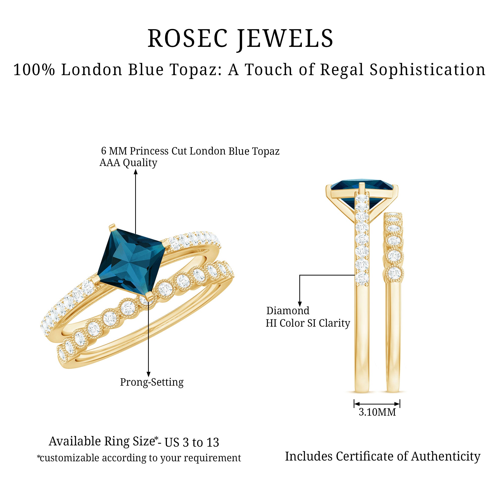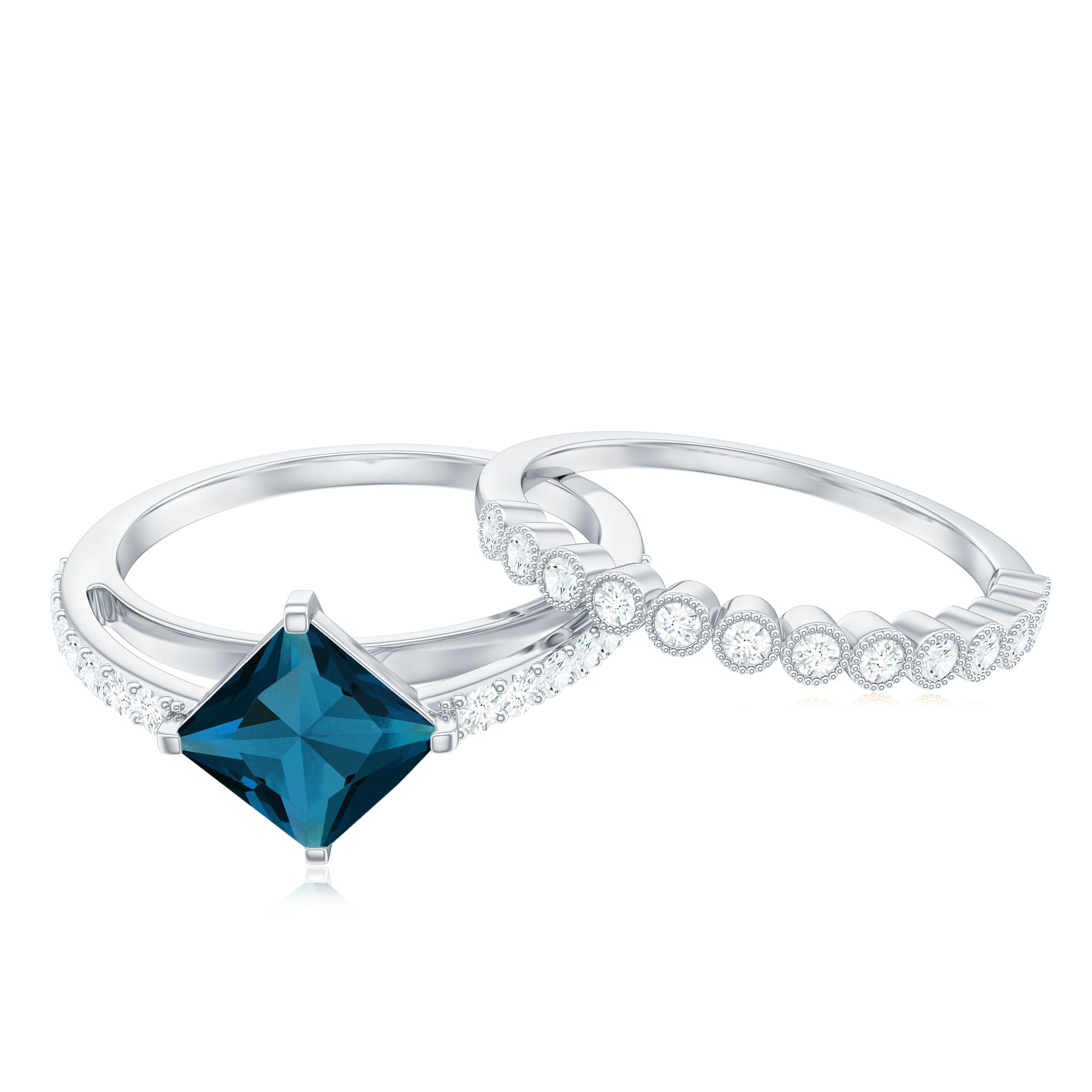 This exquisite Blue Topaz Bridal Ring Set is designed for the woman who desires a blend of timeless elegance and contemporary flair in her jewelry. This beautiful London Blue Topaz engagement ring is accompanied by a matching wedding band in this Princess Cut Wedding Ring Set. It showcases a 6 MM princess cut London Blue Topaz that exhibits exceptional sparkle and brilliance as the centerpiece. Crafted in a prong setting, this piece boasts an elegant and enduring design. The Engagement Ring is enhanced by a wedding band, which features a row of beaded bezel set round Diamond stones. This Solitaire Bridal Ring Set is an excellent choice for those seeking a meaningful, fashionable, and durable jewelry for wedding. It is intended to create lasting memories, whether for your proposal, wedding day, or anniversary celebration. Meticulously designed with AAA quality London blue topaz and HI-SI quality diamonds, this Princess Cut Engagement Ring Set not only exudes luxury but also offers a comfortable fit for daily wear. This womens Engagement Ring Set transcends mere jewelry; it symbolizes love and adds brilliance to your everyday life. Designed in a classic style, it serves as a superb Engagement and wedding ring set for anyone in search of a sophisticated piece of jewelry.