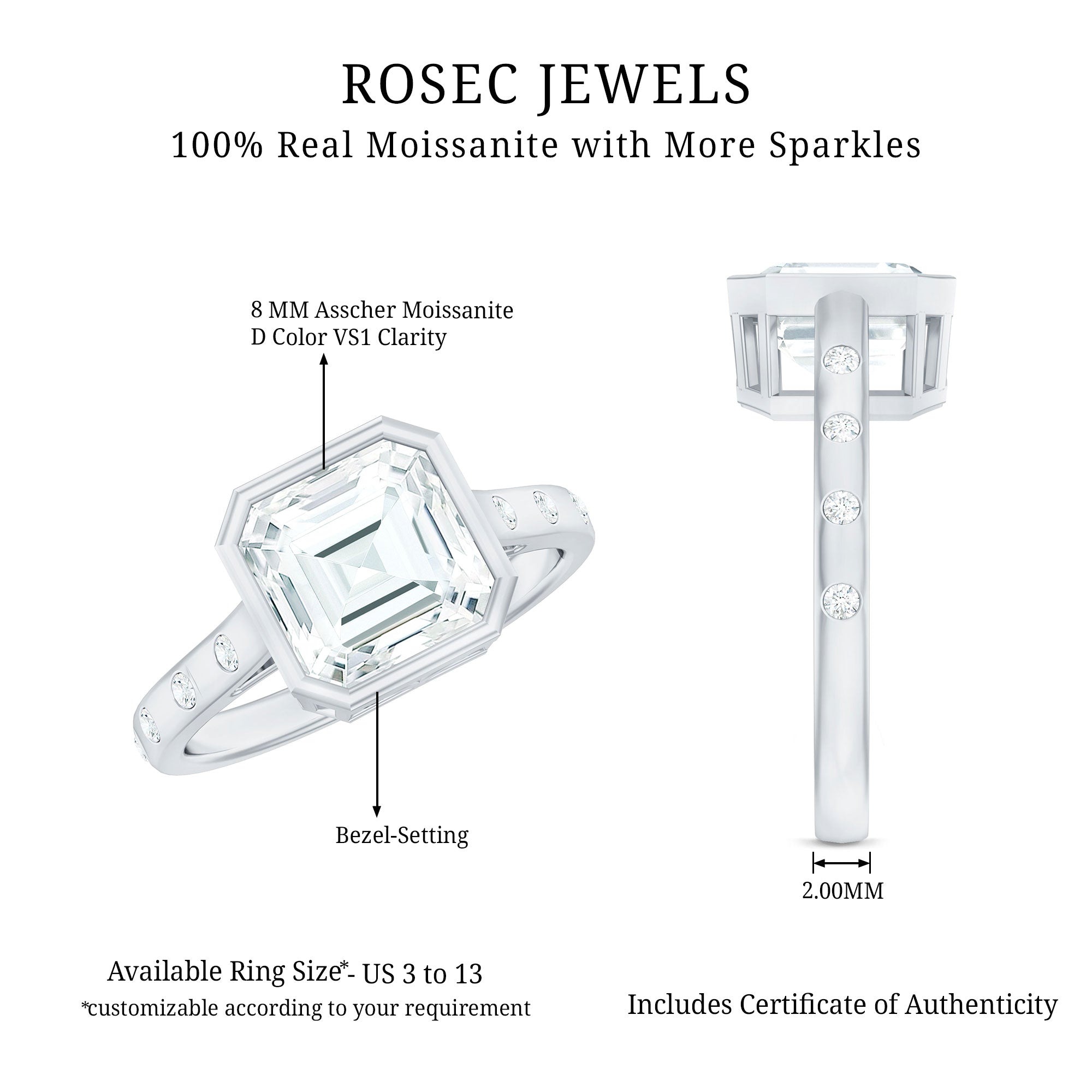 Show your special lady just how much she means to you with our gorgeous Moissanite Engagement Ring on her big day. Its elegant yet simple design beautifully showcases the center gemstone. This classic Asscher Engagement Ring features D-VS1 quality moissanites, ensuring the fire and brilliance that represent love and commitment. At the heart of it is an 8 MM asscher cut Moissanite securely set in bezel setting. The stunning round cut side stones arranged in a spaced style create a bold and eye-catching look, reflecting your unique style and personality. This Solitaire Engagement Ring has a timeless, brilliant geometric shape with sharp edges that draws all the attention. It perfectly blends classic beauty with a modern twist, providing an elegant appearance that radiates stunning brilliance. This Moissanite Solitaire Ring comes in various sizes, guaranteeing a perfect fit that feels tailor-made just for you. Every detail of this 3 Carat Moissanite Ring for Women reflects precision, passion, and a hint of magic that only true craftsmanship can achieve. Let your fingers tell your story and let your love shine with a brilliance as unique as your connection.