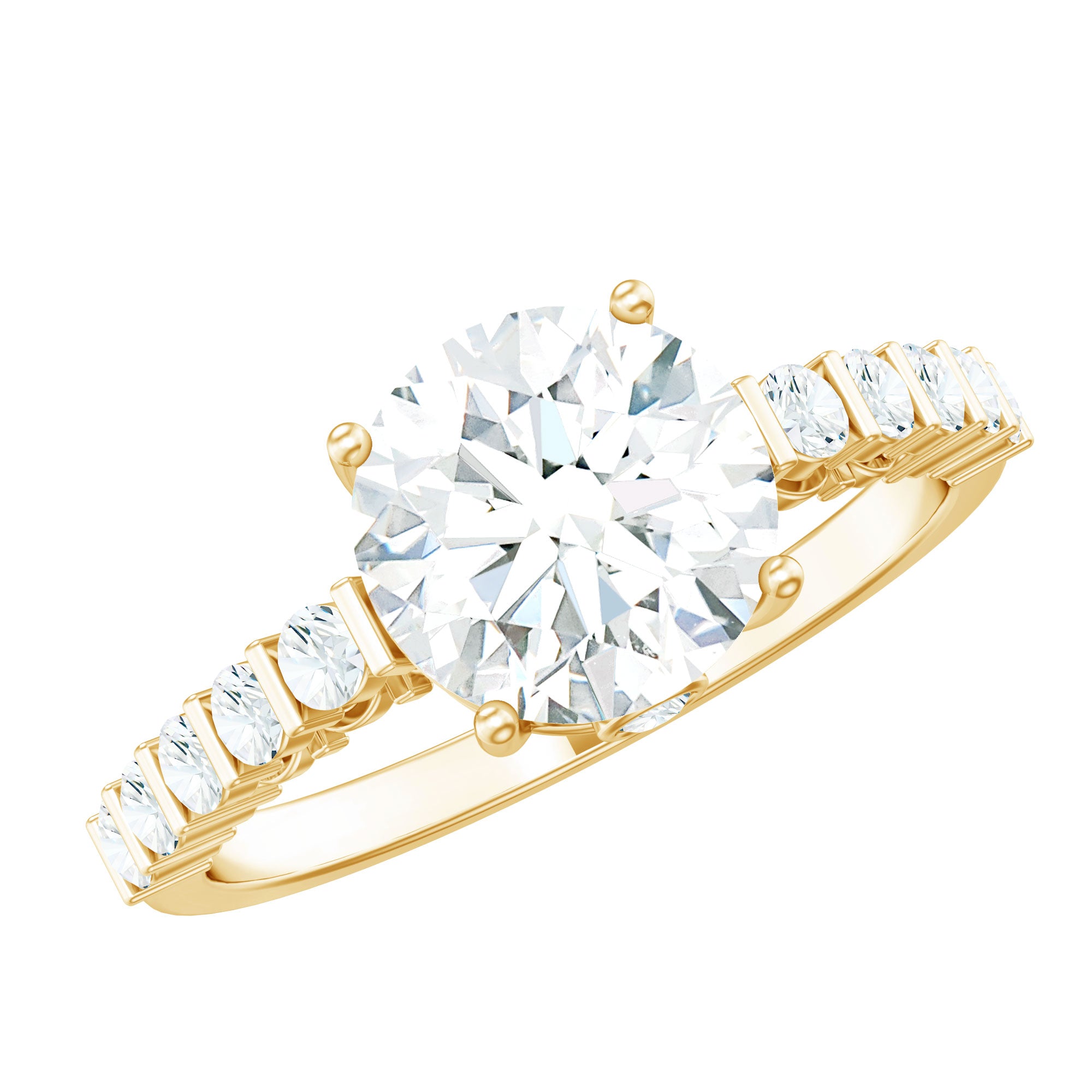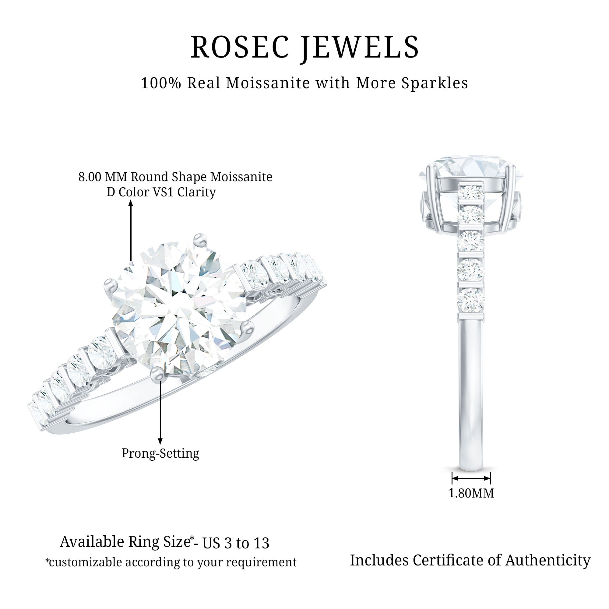Timeless elegance combines with modern brilliance in this Classic Engagement Ring, crafted to honor love with sophisticated refinement and dazzling sparkle. At its heart is a stunning 8 MM Round Shape Moissanite, graded with D-VS1 quality for outstanding clarity and brilliance, securely held in Prong Setting with 2 peek-a-boo moissanites beneath the main gem for an unexpected touch of sparkle. The setting gives this Solitaire Engagement Ring a remarkable visual impact, enhancing the brilliance of the center stone while creating a silhouette that beautifully stands out from every angle. Flanking the center gem are delicate Round Cut Moissanite side stones set in sleek Bar Setting, adding an extra layer of shimmer without overshadowing the main attraction. Thoughtfully designed with a blend of timeless appeal and contemporary sparkle, this Moissanite Engagement Ring is ideal for proposals, anniversaries, or any memorable occasion worth celebrating. The balanced design ensures that all elements harmonize - classic in structure yet bold in radiance. Elegantly presented in a luxurious jewelry box, this 2 Carat Moissanite Ring is ready to signify the start of forever with stunning brilliance.