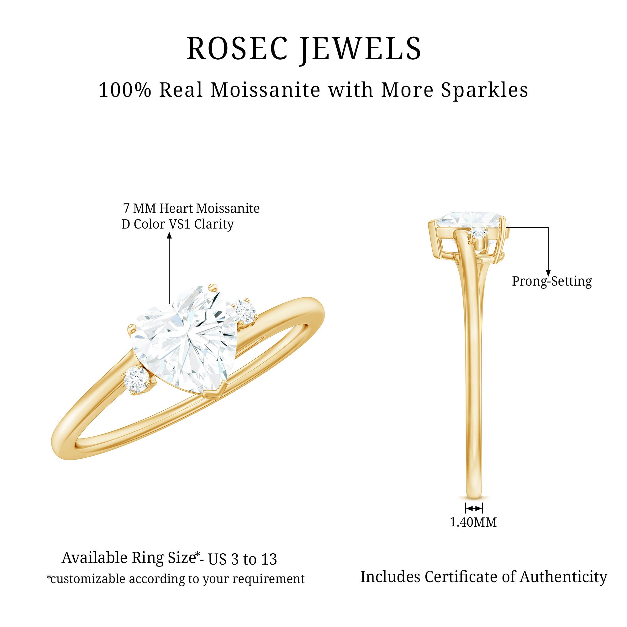 Enhance your special day with this captivating Heart Shaped Moissanite Engagement Ring, perfect for your momentous occasion. At its heart is a stunning 7 MM heart shaped moissanite, securely held in prong setting that provides a sleek and modern appearance while ensuring long-lasting durability. The brilliance of the center stone is unmistakable, exuding warmth, sophistication, and timeless beauty with every look. Enhancing its refined charm, the Solitaire Heart Ring showcases two delicate round moissanite stones on either side, adding a light to the overall design. These subtle details enhance the bold center stone without taking away from it, achieving the perfect harmony between gentle sparkle and striking elegance. Designed for comfort and made for everyday wear, this Solitaire Engagement Ring comes in a variety of US sizes from 3 to 13, making it simple to find the ideal fit. Whether you are getting ready for a proposal or want to give something lovely to commemorate a special moment, this 1.5 Carat Moissanite Ring is a sincere choice. Delivered in a signature jewelry box, ready to be gifted or treasured for years ahead, this piece embodies elegance, emotion, and the start of forever. Let it be the ring that narrates your love story in the most memorable way.