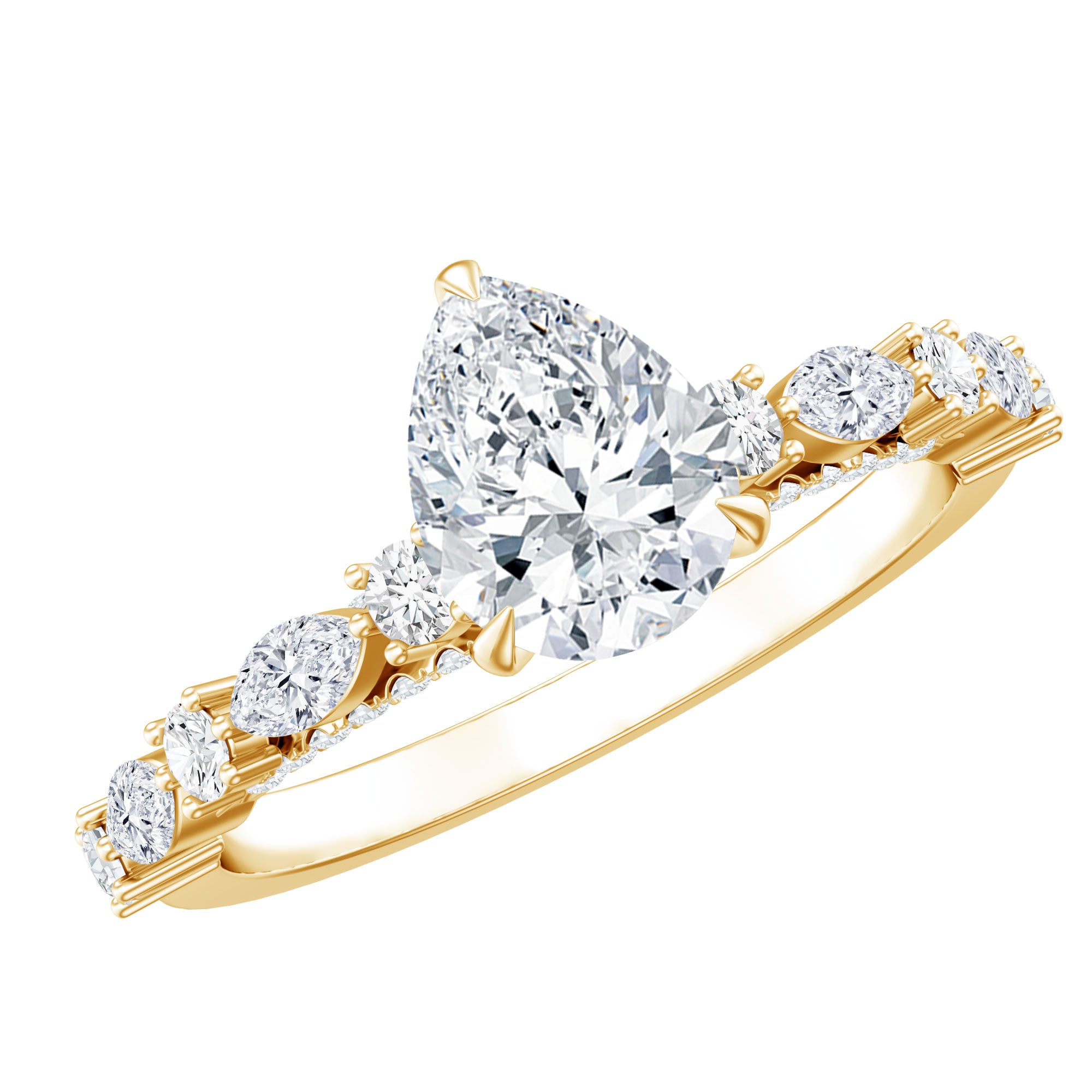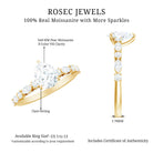 Rosec Jewels Pear Moissanite Engagement Ring brings together graceful design and brilliant sparkle, making it a wonderful choice for a once-in-a-lifetime moment. At the center sits a stunning 6X8 MM pear shaped moissanite, held securely in claw setting. To enhance the center stone, the band is lined with marquise and round moissanites that add extra brightness and depth. Additionally, there is a delightful surprise - a row of round cut stones create a surprise band that adds a special sparkle beneath the center stone. These D-VS1 quality moissanite stones are chosen for their exceptional fire and clarity, making the Teardrop Engagement Ring sparkle from every angle. Perfect for marking a proposal, celebrating a milestone, or expressing a timeless promise, this Pear Moissanite Ring carries both beauty and sentiment. Its radiant glow and thoughtful craftsmanship make it a meaningful symbol of the love you share. Designed with comfort in mind and crafted with care, it is a piece that will continue to shine through every chapter of your journey together.