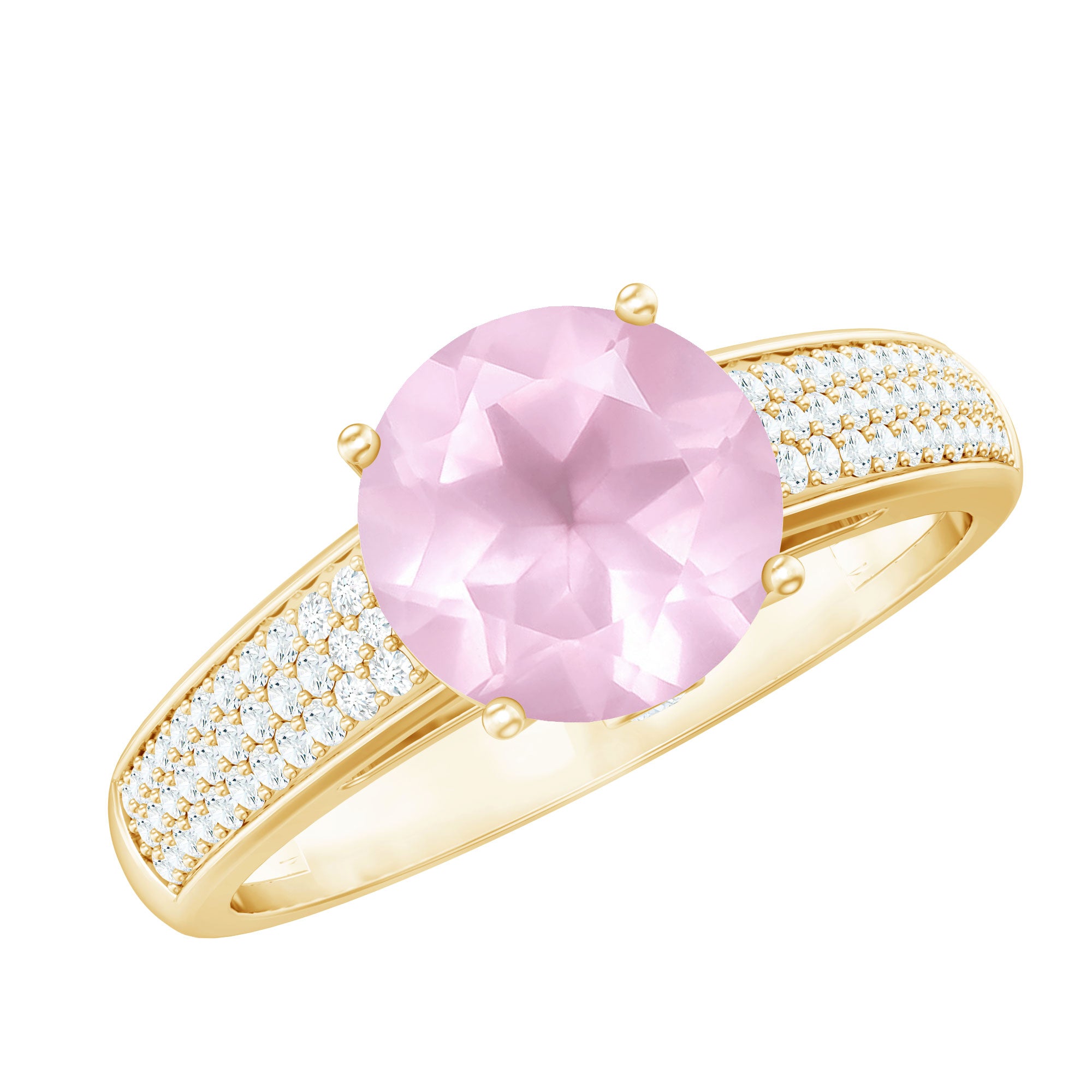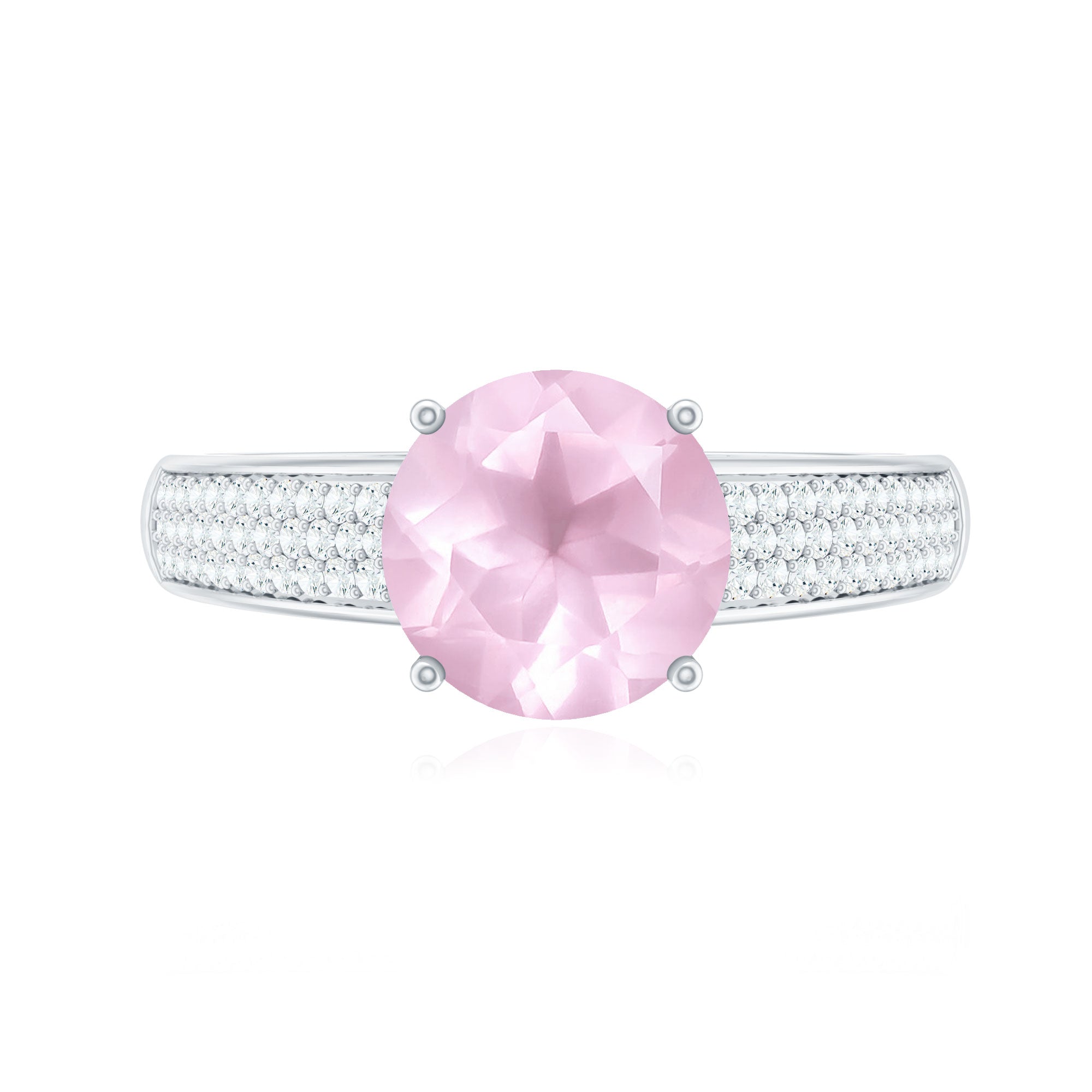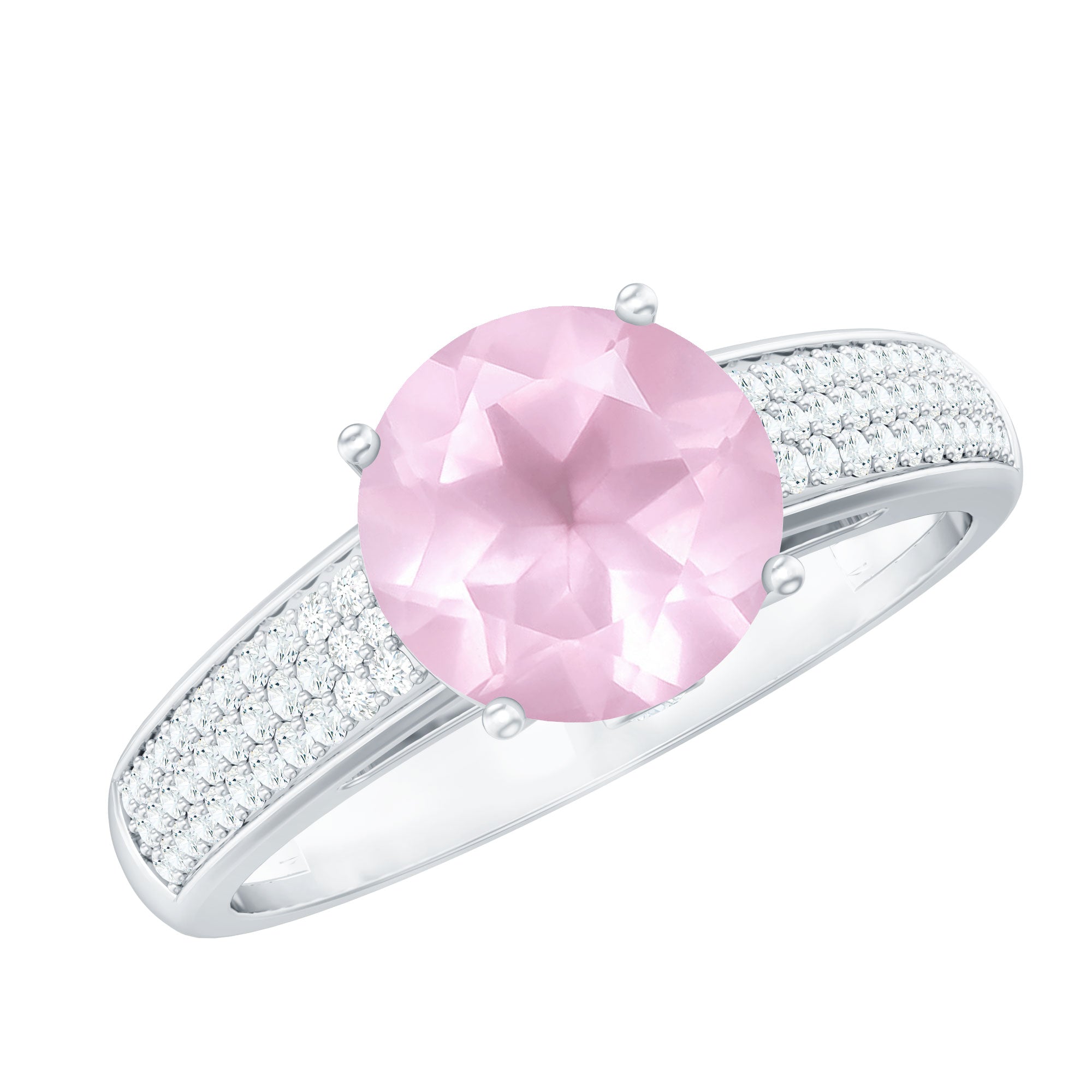 A Wonderful and Lovely Engagement Ring has been embellished with Round Shape Rose Quartz set as a solitaire in a 4 prong setting and Round Shape Diamond as Hidden and Side Stone Style. This Side Stone Engagement Ring is available in various metal options.