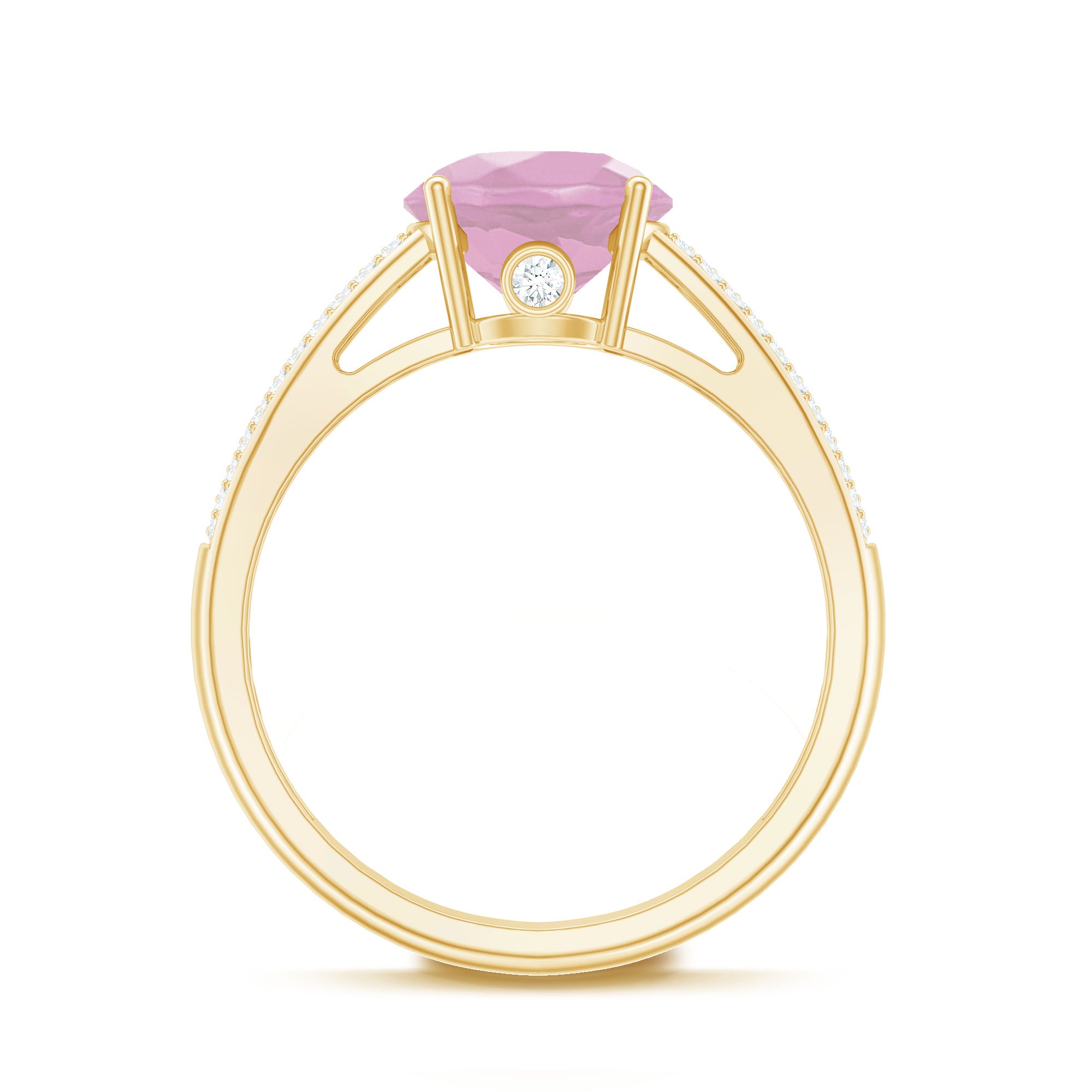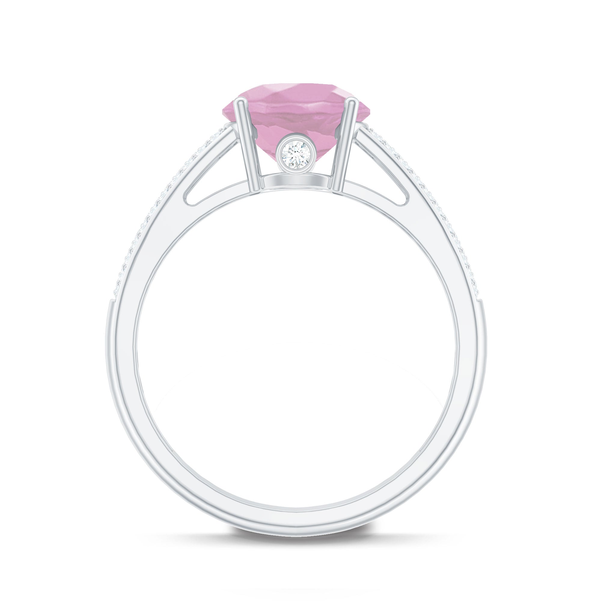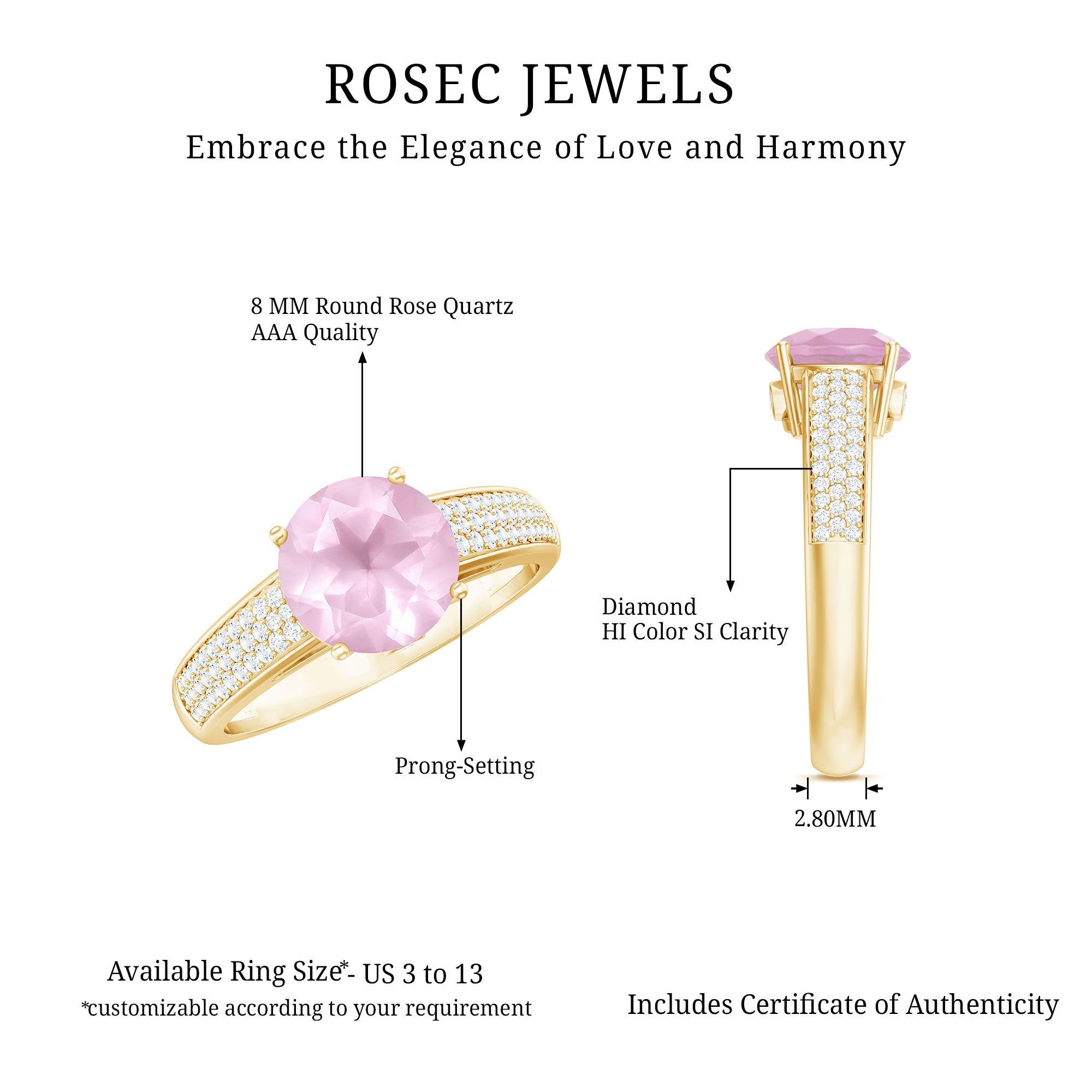 A Wonderful and Lovely Engagement Ring has been embellished with Round Shape Rose Quartz set as a solitaire in a 4 prong setting and Round Shape Diamond as Hidden and Side Stone Style. This Side Stone Engagement Ring is available in various metal options.