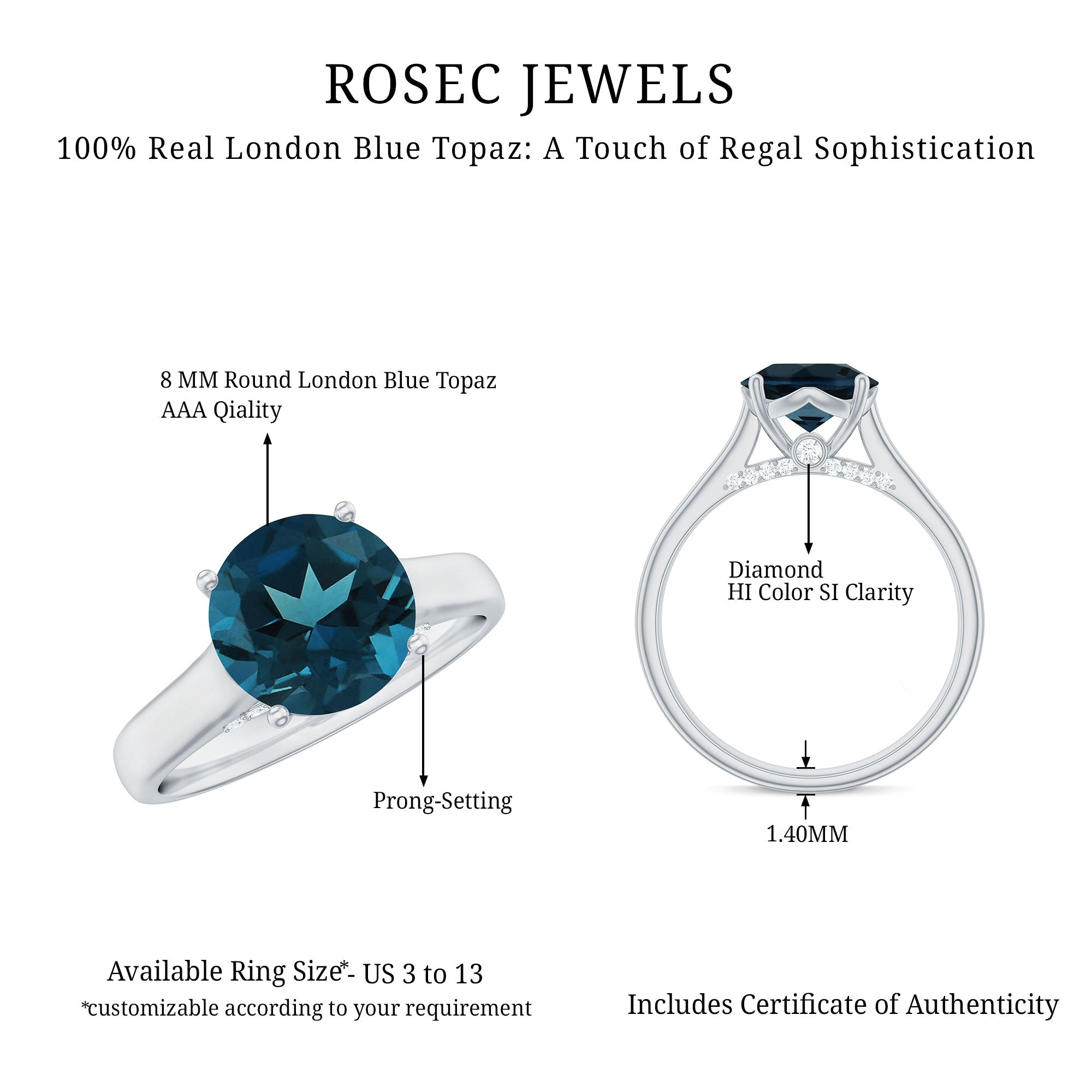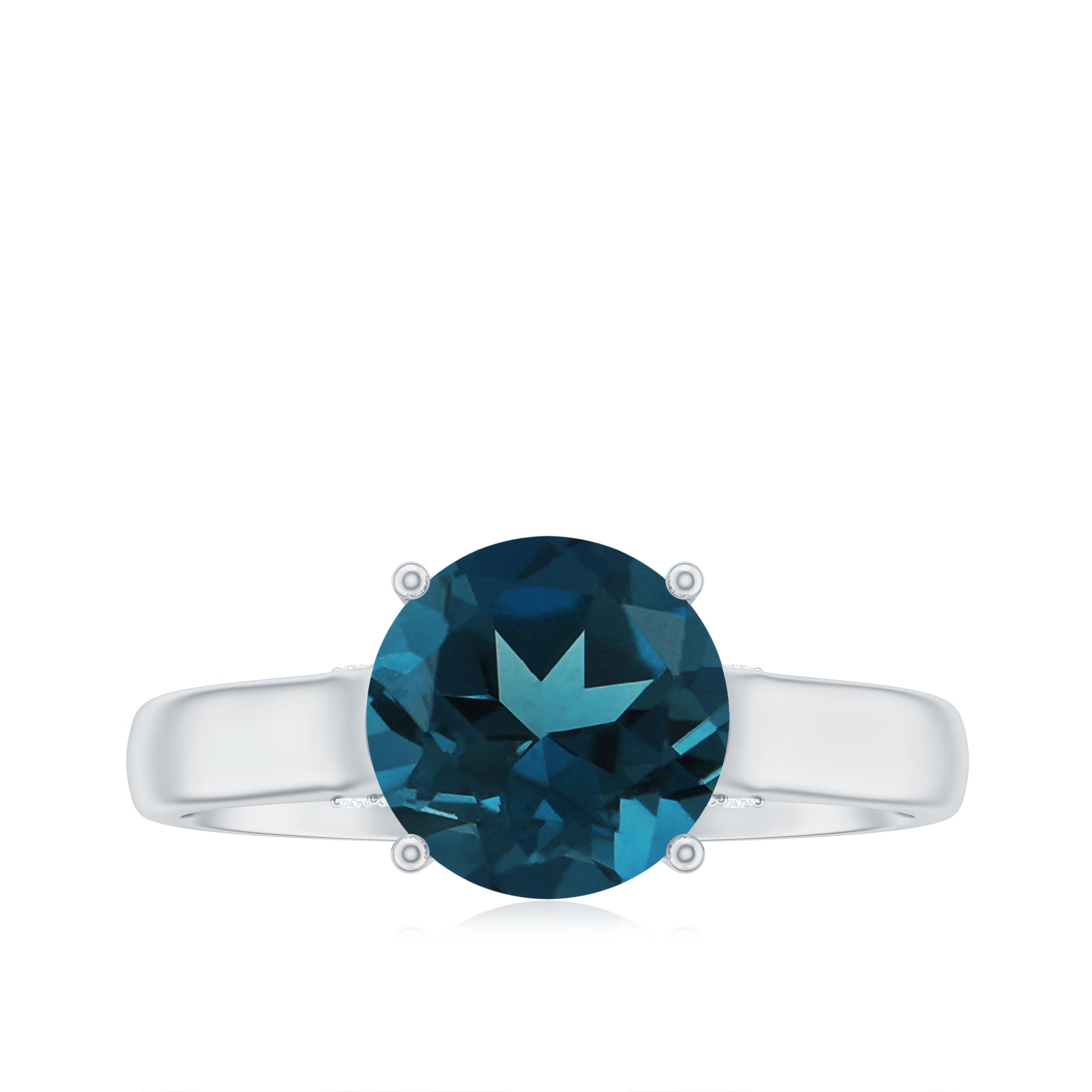 Make your moment extra special with this beautiful London Blue Topaz Engagement Ring. It is designed with a simple and classic style that never goes out of fashion. At the center of the Solitaire Engagement Ring is an 8 MM round cut london blue topaz, set securely in prong setting. The gemstone weighs about 2 carats and is of AAA quality, making it bright, clear, and eye-catching. This Cathedral Engagement Ring is a great choice if you are looking for something meaningful. Since blue topaz is the birthstone for December, it is also a thoughtful gift for someone born in that month. The band is designed in a cathedral style, which gently lifts the center stone, giving it a graceful and elegant look. A tiny detail that makes this Round Engagement Ring even more special is a small round diamond hidden just beneath the main stone. It is a little sparkle that adds a romantic and personal touch to the design. The diamond is HI-SI quality, chosen for its clarity and shine. Whether you are proposing, marking a special day, or just want to give someone you love a meaningful gift, this London Blue Topaz and Diamond Ring is a beautiful choice. It is easy to wear every day, feels comfortable on the finger, and pairs well with other rings too.