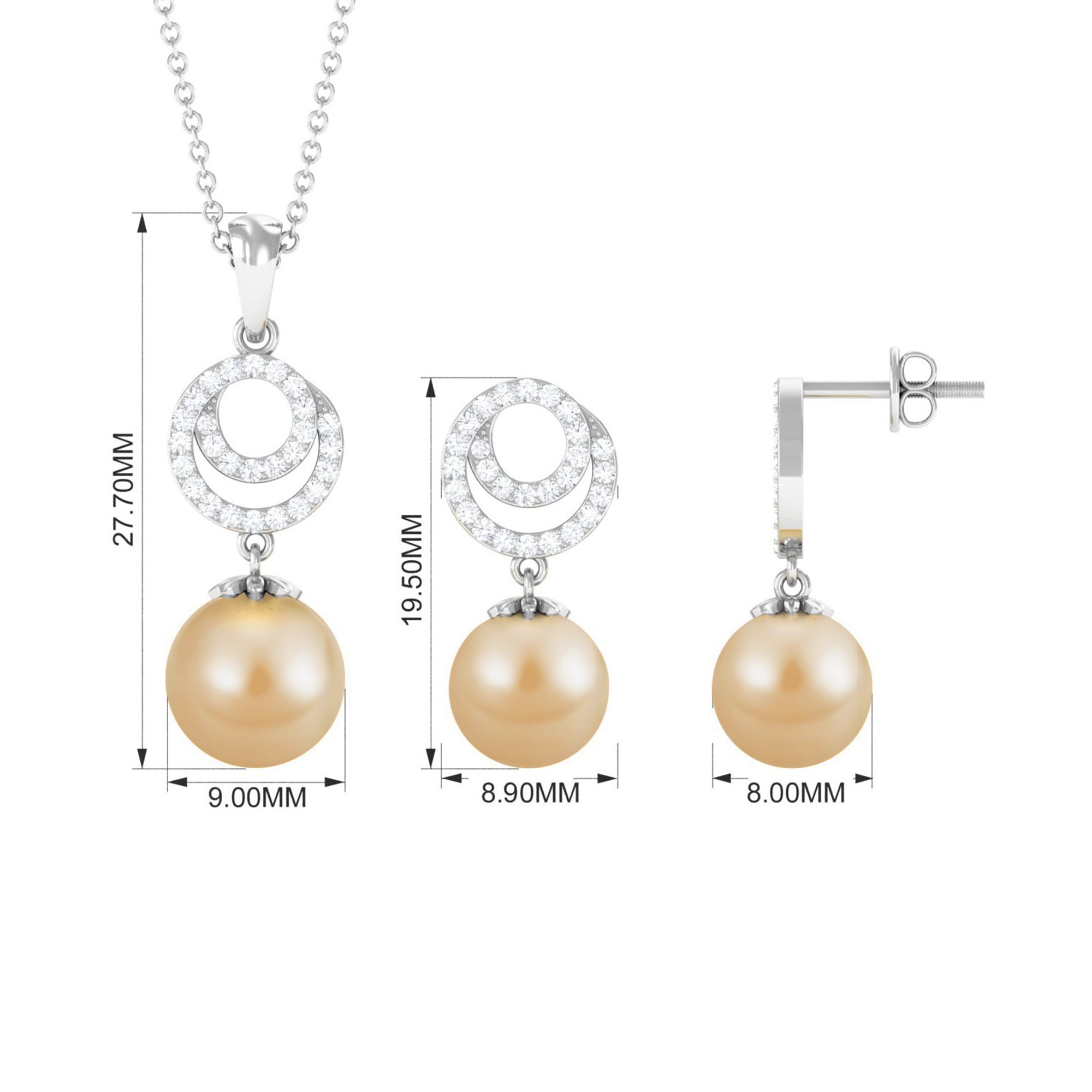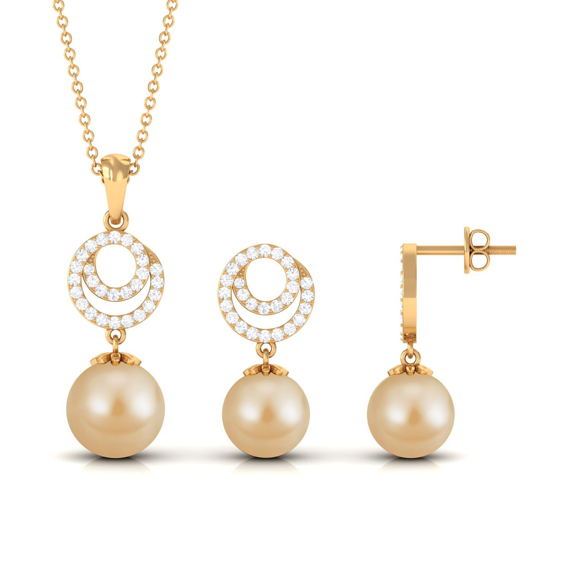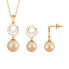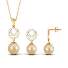 Experience the sheer brilliance of this meticulously crafted Pearl Jewelry Set, a testament to exquisite craftsmanship destined to leave an enduring mark. This Pendant and Earrings Set features an elegant South Sea Pearl delicately nestled within a Bead Setting. It gracefully dangles from a circle adorned with shimmering Moissanite gemstones, creating a stunning and captivating ensemble thats bound to make a lasting impression.