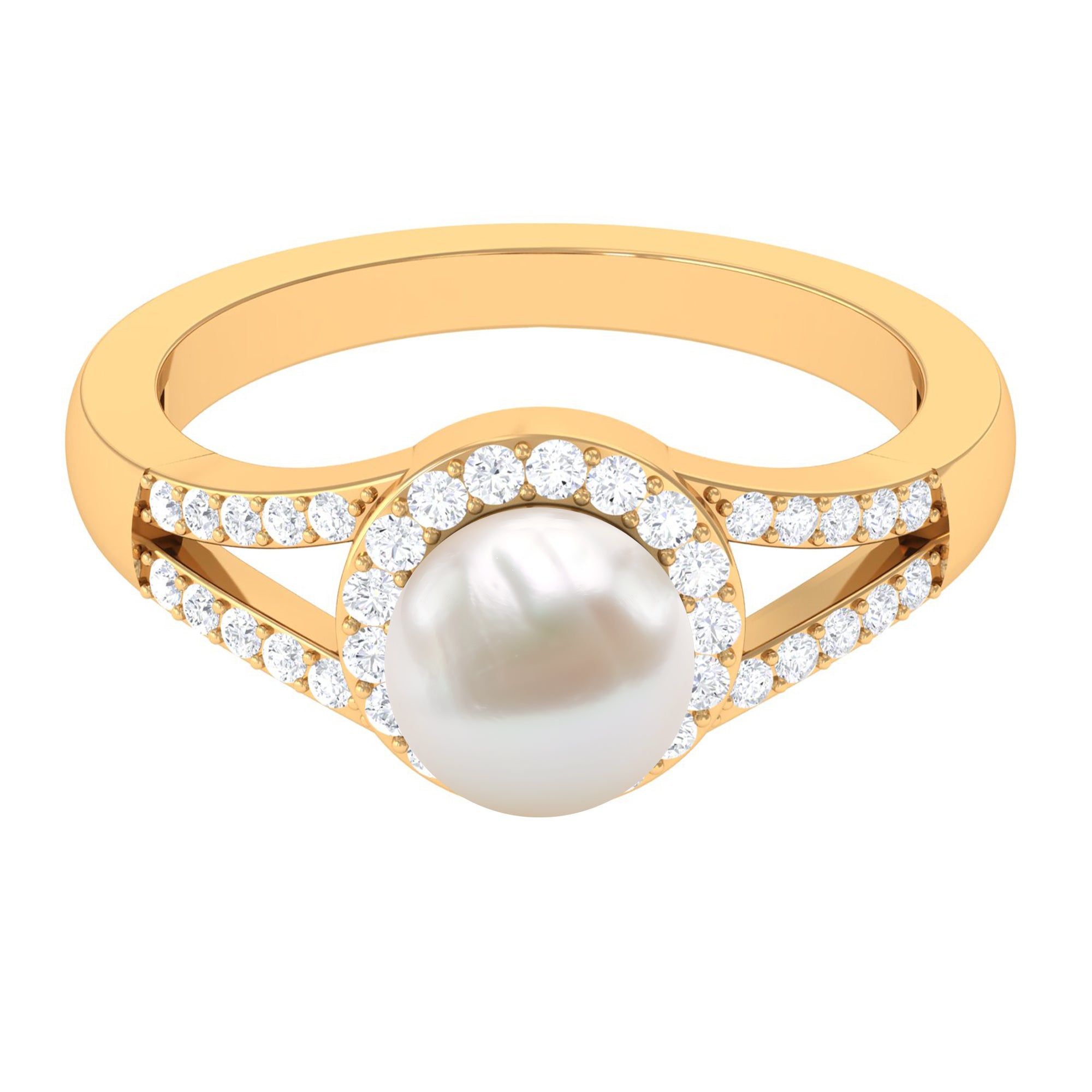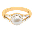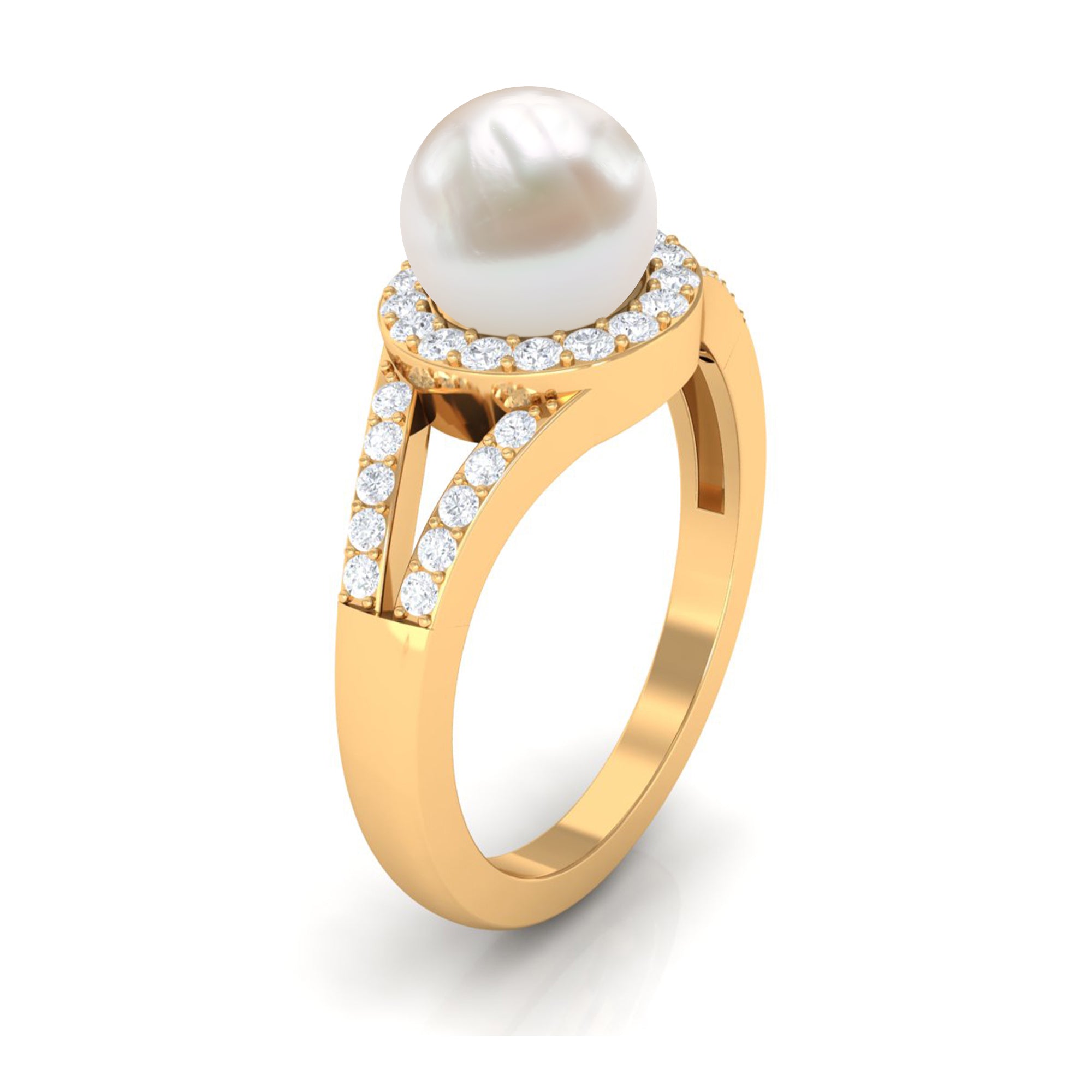 Split Shank Freshwater Pearl Engagement Ring is accentuated with Diamond Halo and side stones. This White Pearl Ring is a scintillating piece of fine jewelry, crafted in Gold for sumptuous charm. This Freshwater Pearl Gold Ring is a perfect designer ring for women born in June.