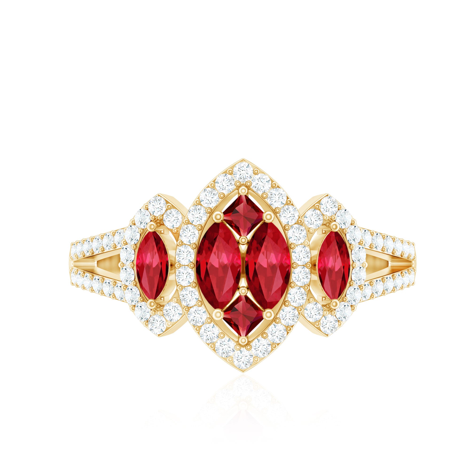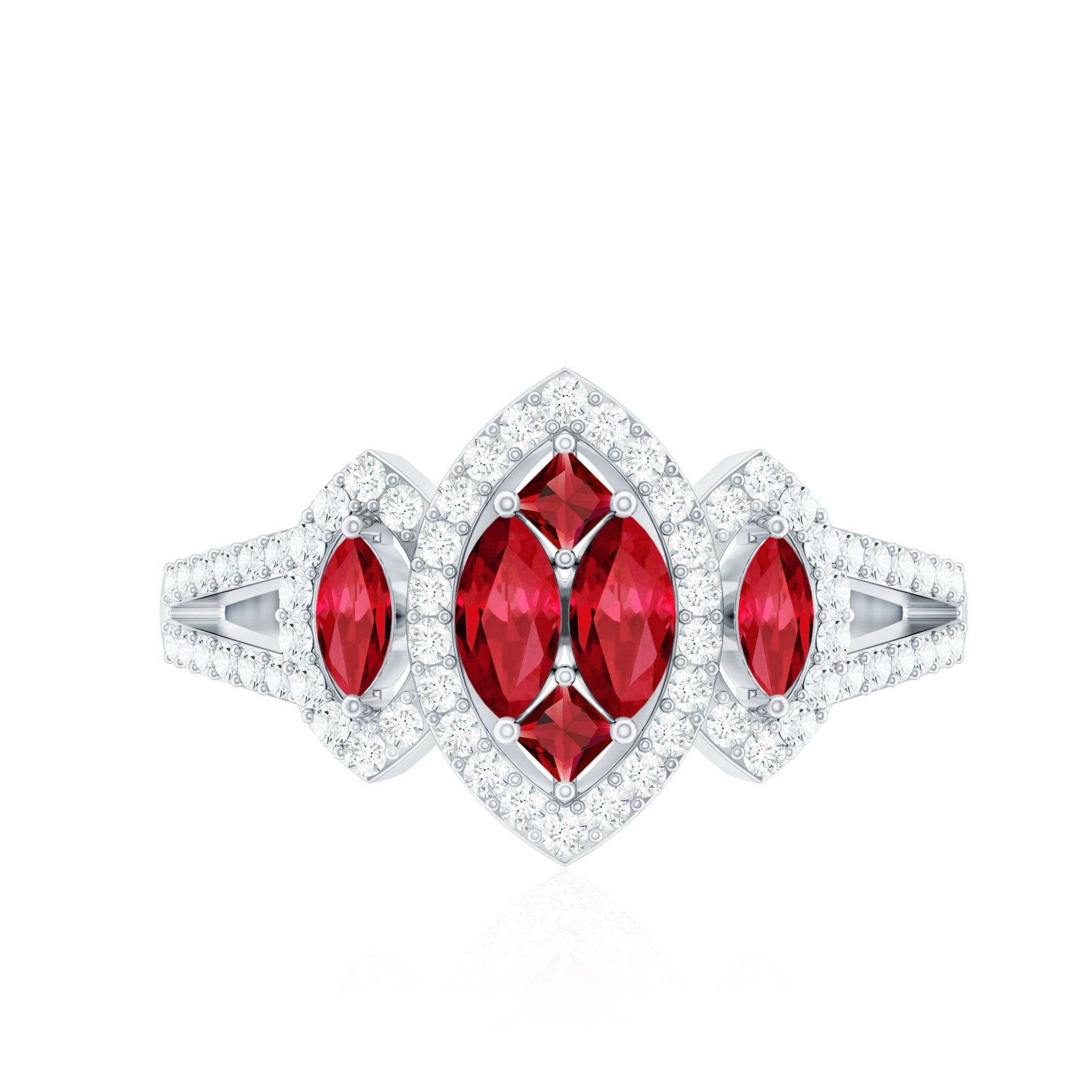 Presents an elegant ring showcasing a central cluster design embellished with Marquise and Princess-cut created ruby gemstones on a split shank that gracefully extends along the band. The center stone is accentuated by dazzling round-cut Diamond stones, creating an enchanting and memorable appearance.