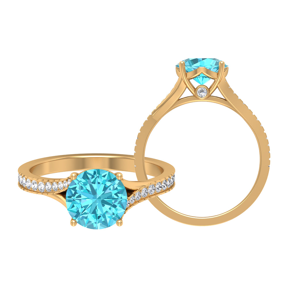 This womens engagement ring showcases a Swiss Blue Topaz, cut in a round shape measuring 8 MM, and set in solid gold with four prongs. The split shank design of the ring is accented with brilliant cut Diamond stones.