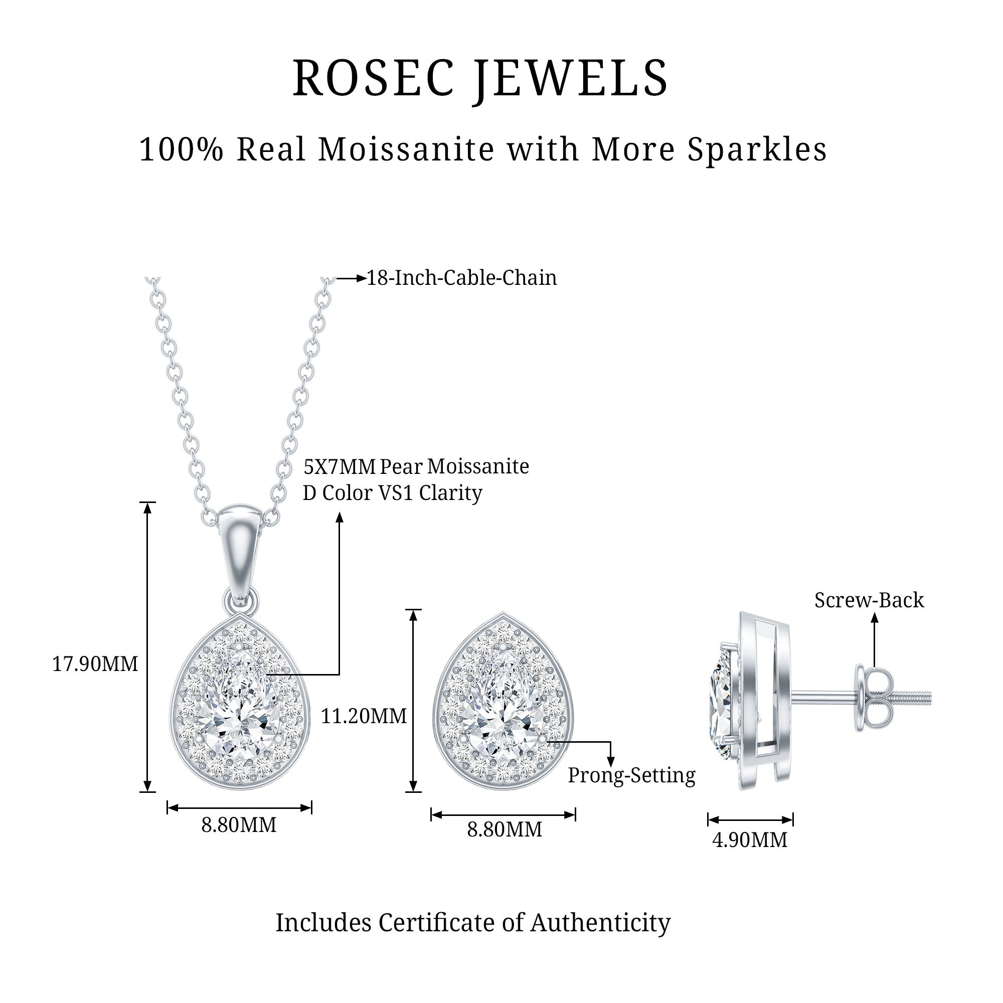 This stunning Moissanite Jewelry Set, featuring modern design and classic pear shapes, is a top pick for brides. With its luxurious diamond-like shine, our Moissanite Necklace Earrings Set is a must-have for your wedding accessory collection. If you are on the hunt for the perfect jewelry for special events, check out this Moissanite Bridal Jewelry Set, expertly made with 14K White Gold Plated Silver. The set comes with earrings and a pendant on a chain, each adorned with a 5X7 MM Pear Shape Moissanite surrounded by smaller round Moissanite stones. The earrings have a secure screw back closure to keep them in place from day to night. This popular necklace and earrings combo is also a fantastic gift for bridesmaids and for someone on their birthday, wedding anniversary. It is ideal for proms, homecoming, mothers of the bride, and any special occasion. The Rosec Jewels Teardrop Pendant and Earrings Set is a memorable gift that will be treasured for years. Its a glamorous and timeless accessory that will elevate your outfit. You will adore wearing this Teardrop Jewelry Set, which comes in a high-quality velvet pouch along with a certificate of authenticity.