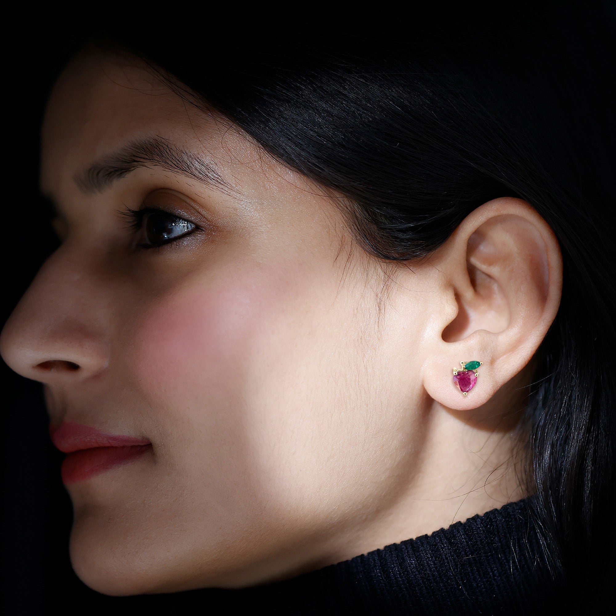 Elevate your style with these Stud Earrings embellished with Heart Shaped Ruby elegantly set in prong setting and Marquise-Cut Emerald on the top adds a pop of color to the design. The delightful hues of Natural Ruby and Emerald are sure to dazzle up any outfit, whether its casual or formal these Ruby Earrings are enough to embrace your ensemble. These Ruby Stud Earrings, a perfect pair for your daily wear come with screw-back closures which keep them safe and provide a comfortable fit during wear.