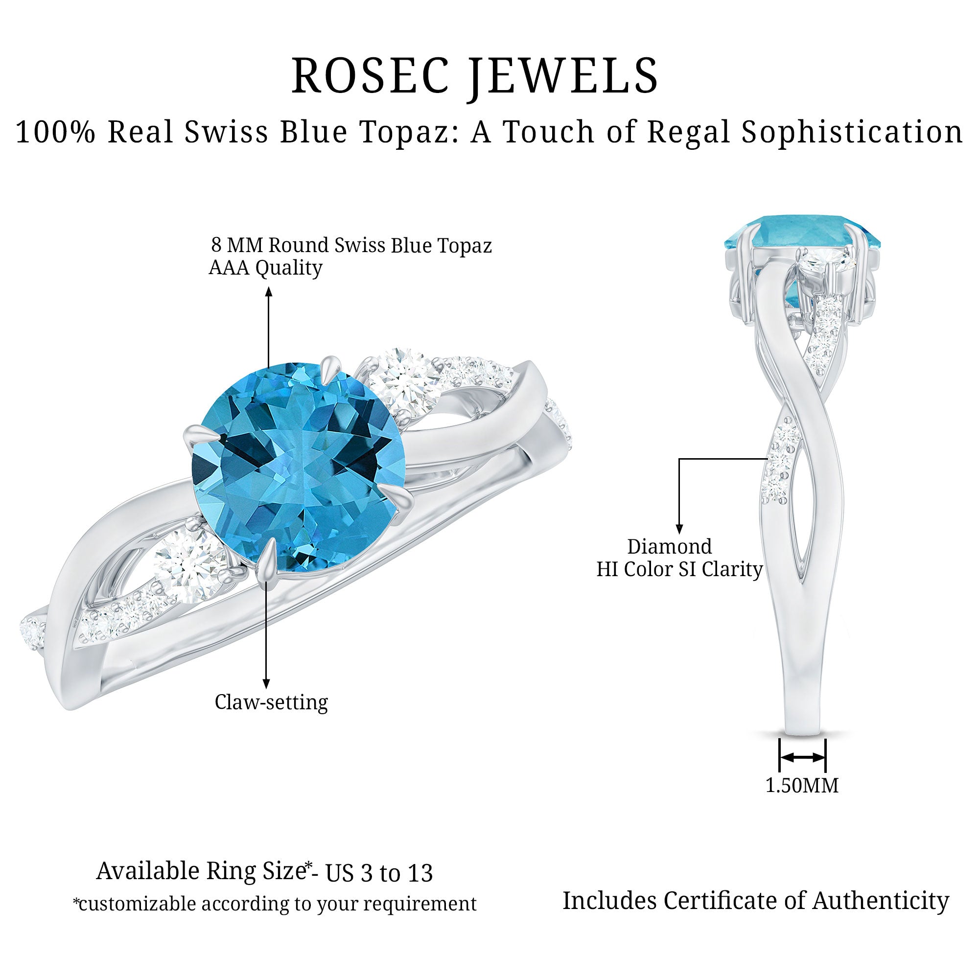 Show your admiration for the most stunning person in your life by gifting them this exquisite Swiss Blue Topaz Ring. Featuring an 7 MM Round Shape Swiss Blue Topaz gemstone set in a claw setting and a solitaire crossover infinity band adorned with a Diamond, this engagement ring is the perfect representation of your boundless love for your partner. The ring has a total weight of 1.75 Carat and boasts AAA Quality, with all gemstones certified and subjected to rigorous quality checks.