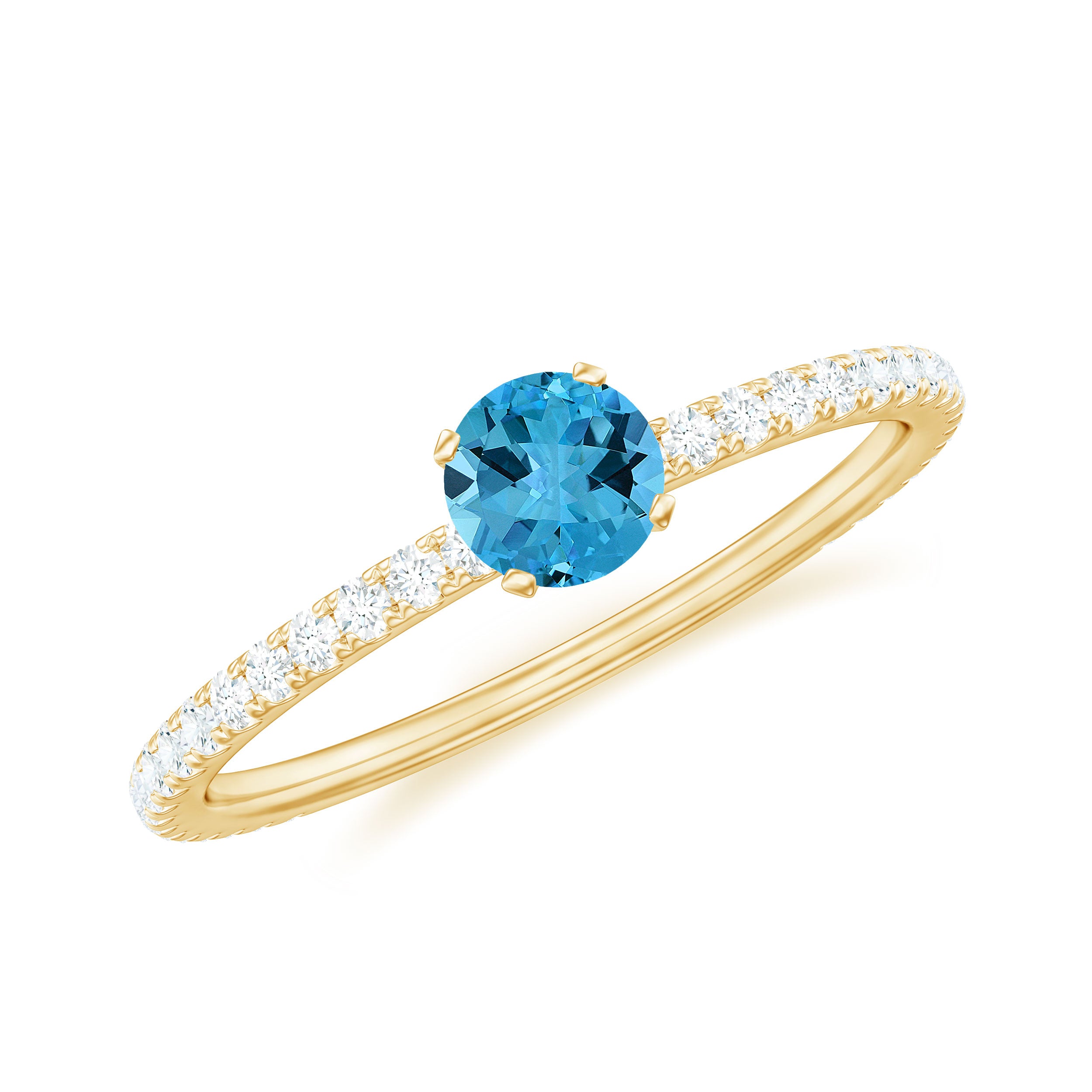 It features a Round Shape Swiss Blue Topaz as Solitaire embellished in Prong Setting with Round Brilliant Diamonds as Side Stones embellished in Pave Setting.