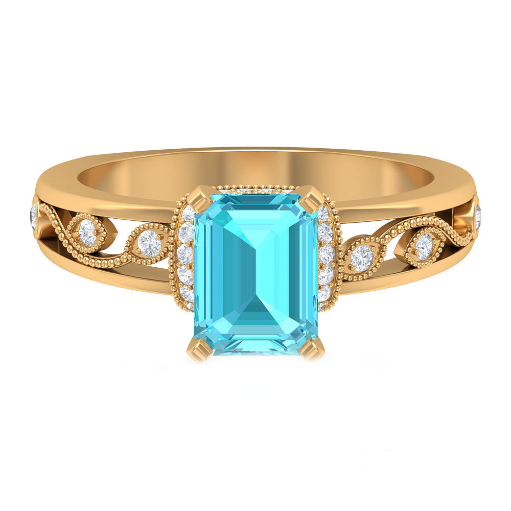Every piece of Jewelry tells a story and this timeless piece will tell yours. Decorated with Gold Milgrain, this one features an Emerald Cut Swiss Blue Topaz set as a Solitaire. Its band and unique collar is embellished with Round Shape Diamond adding stars to its overall charm.