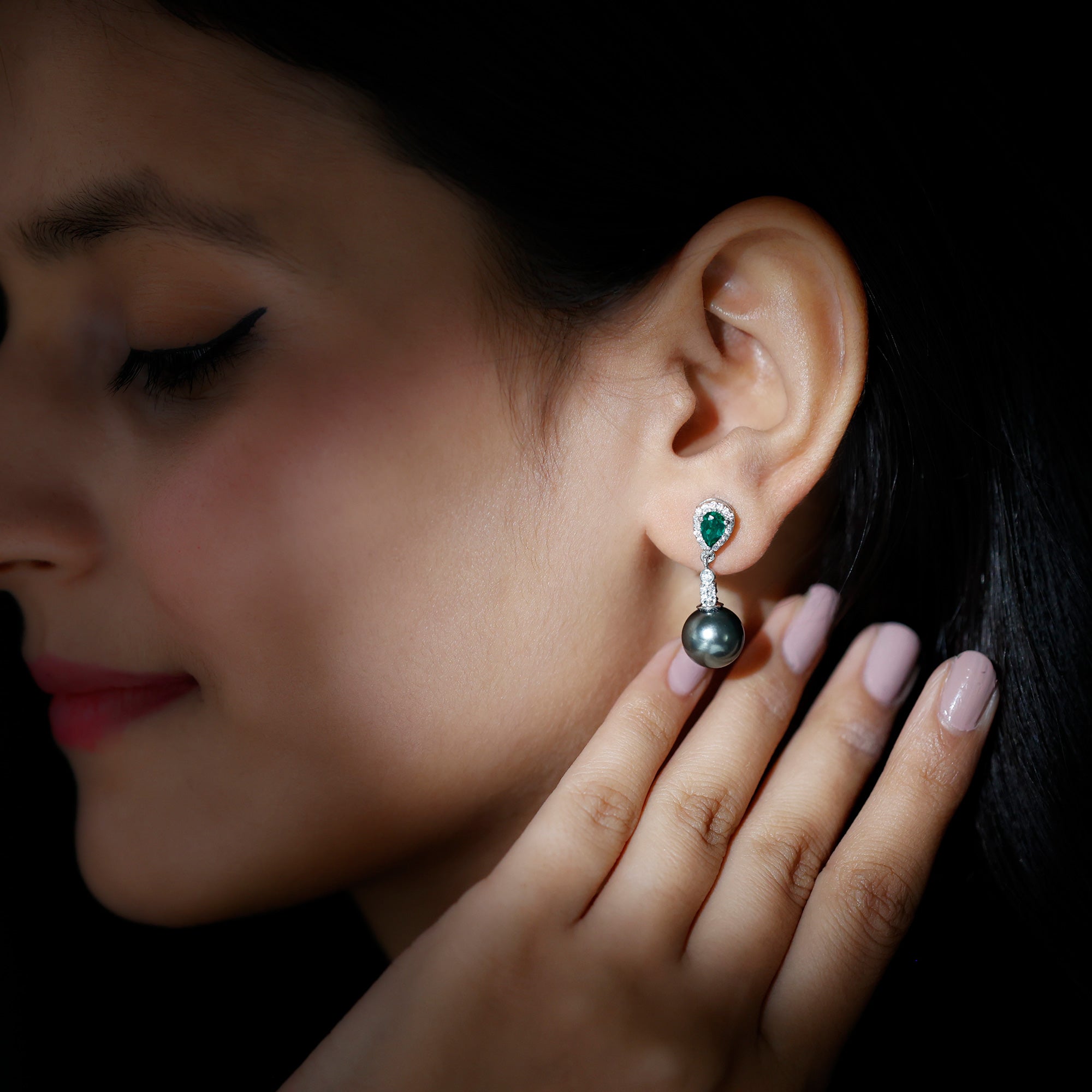 Make your special day even more memorable with our exquisite Black Pearl Dangle Earrings, embellished with a Tahitian Pearl, a Pear Cut Created Emerald, and Round Cut Moissanite stones. These luxurious Designer Drop earrings are crafted in Gold to make for a stunning choice that exudes opulence and sophistication. Perfect for adding a touch of glamour to your bridal look, these Tahitian Pearl earrings are sure to turn heads and make a statement.