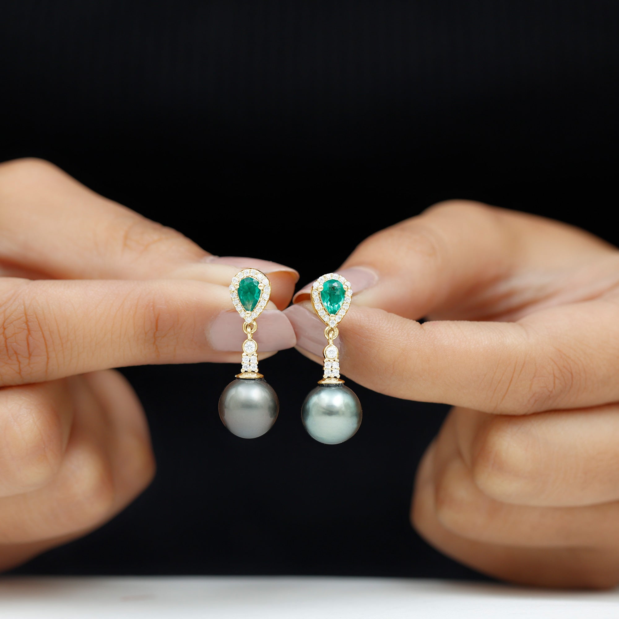 Tahitian Pearl and Created Emerald Drop Earrings with Moissanite