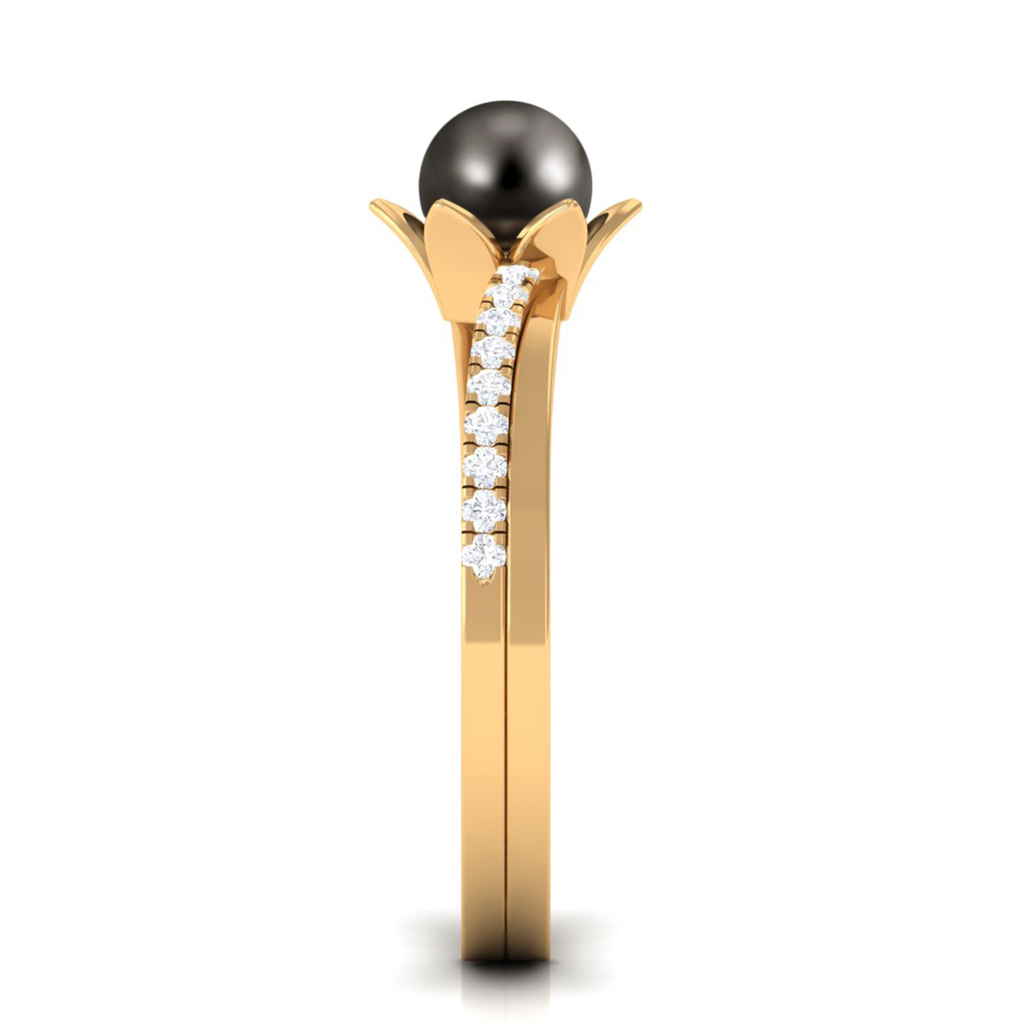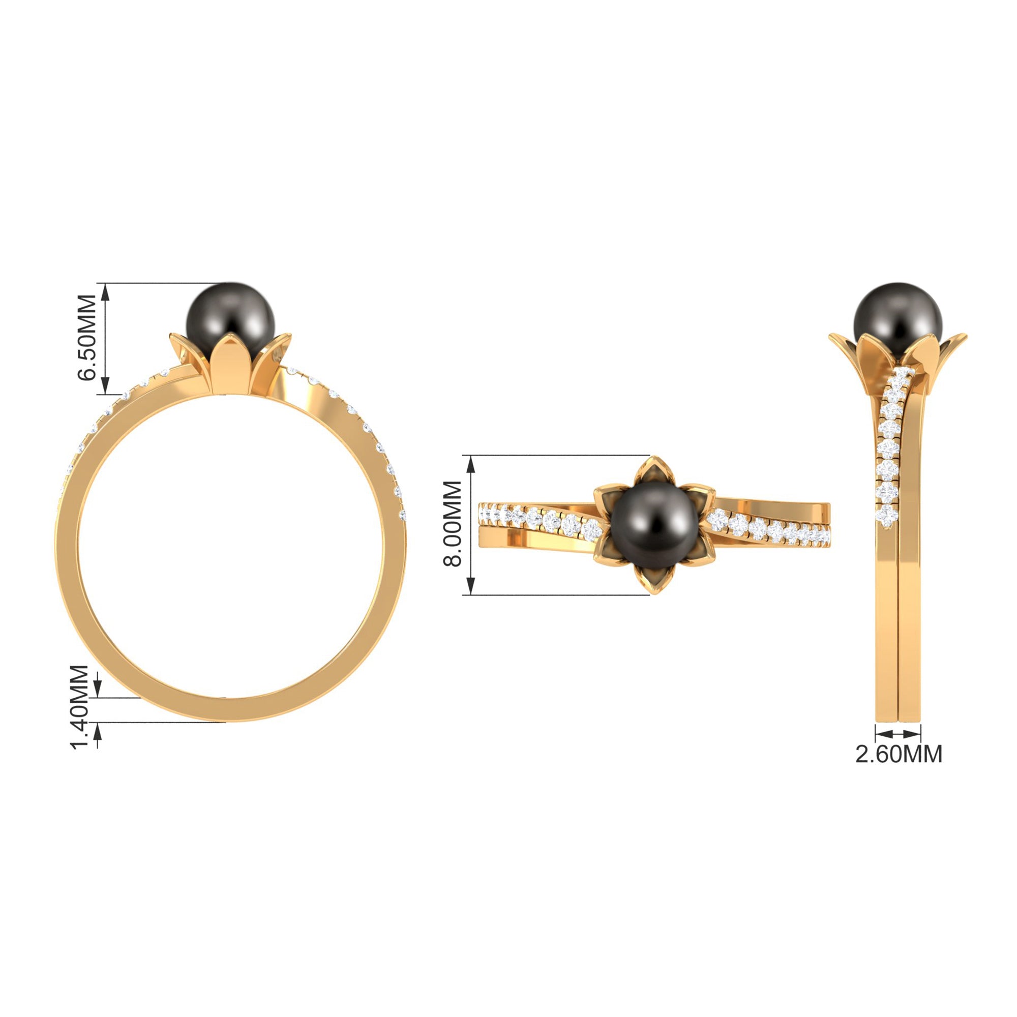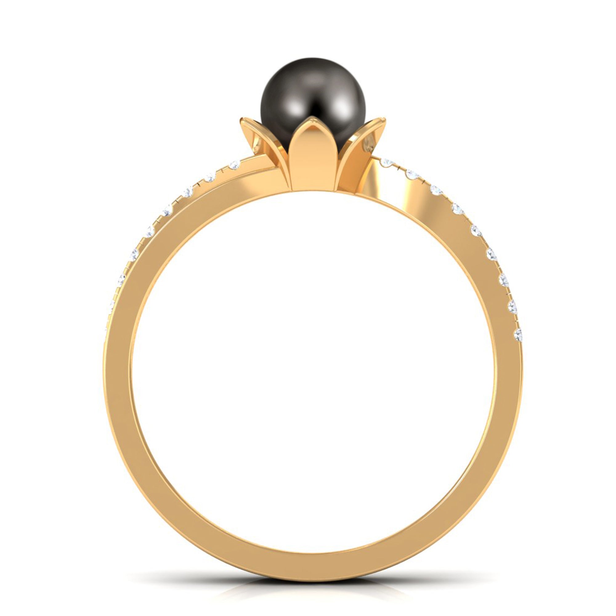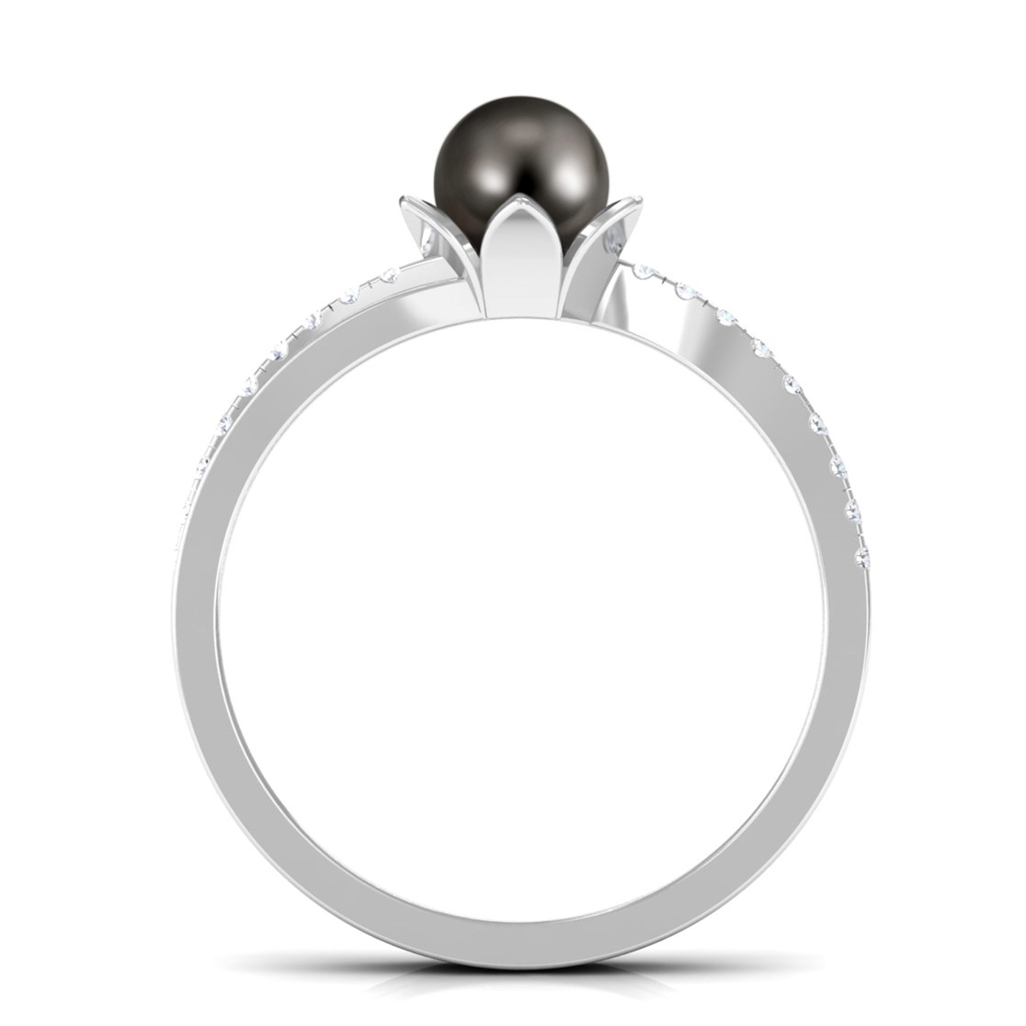 The glistening bypass shank holds an eye-pleasing round Tahitian Pearl, that is surrounded by a floriated metal motif. Perfectly cut and polished round Diamond adorn the shank band and complete this finely crafted solitaire ring. If you are an admirer of rare beauties, then get this minimalist ring for yourself as a token of self-love or present it to someone who lights up your life.