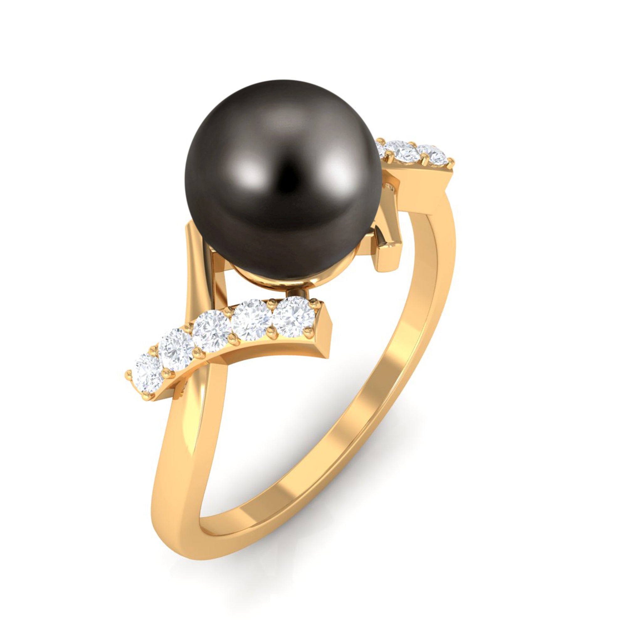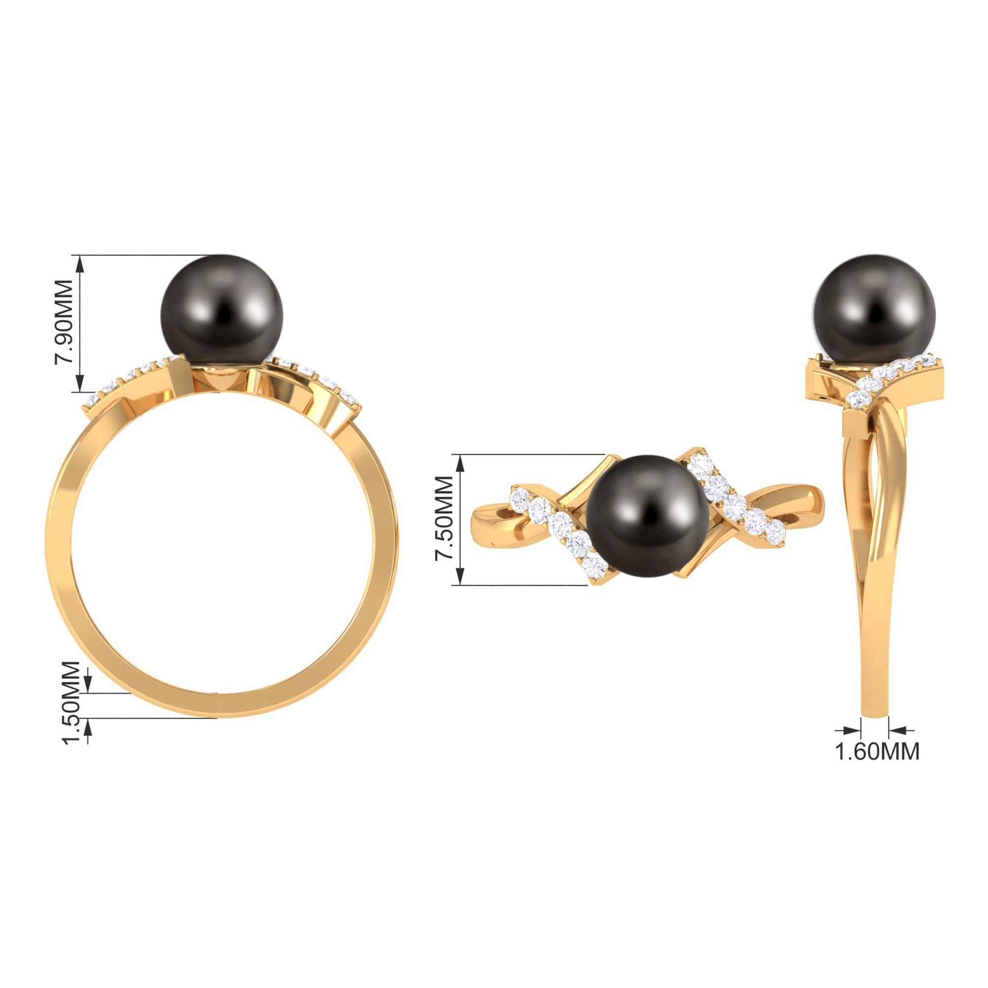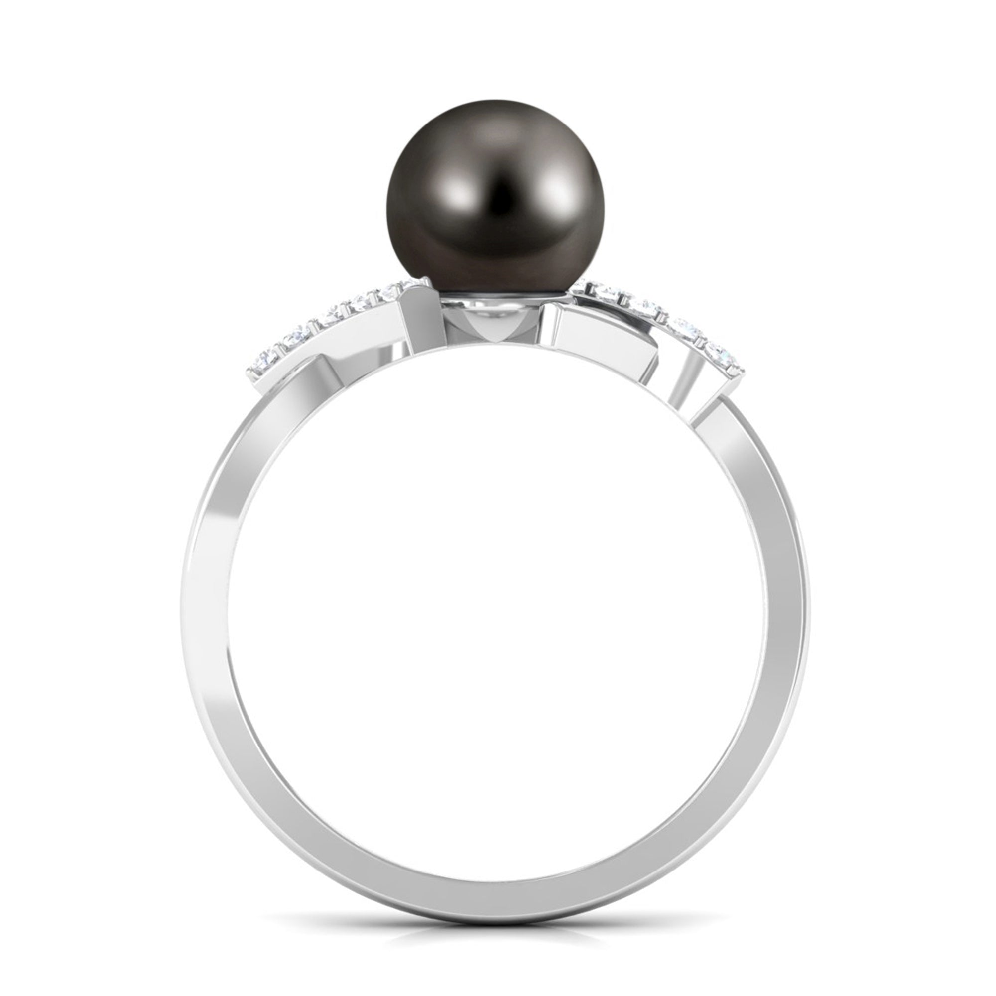 Held in between a sleek crossover shank is a round Tahitian pearl that looks nothing less than stunning in this solitaire ring. It is flanked by prong set round Diamond, and a plain metal strip, that intertwines gracefully to form this simple crossover shank. The Tahitian pearl is bead set for an added allure. If you are drawn to solitaire styles with a twist, this pearl ring deserves to be yours.