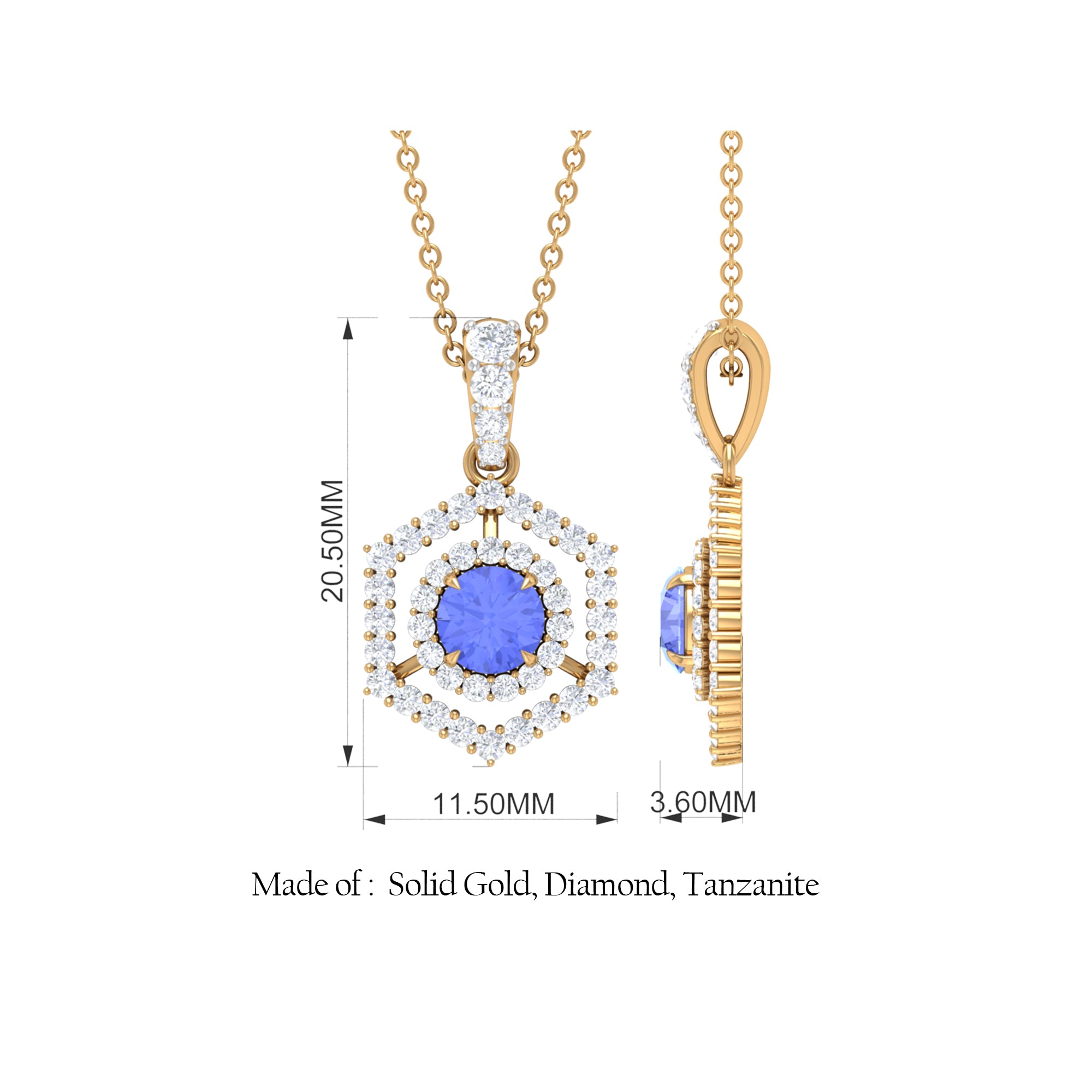 Indulge in the beauty of this Hexagon Shape Pendant, expertly crafted with Tanzanite and Diamond. The pendant necklace is adorned with a stunning Tanzanite, complemented with diamond accents, and a decorative accent bail. This elegant and sophisticated piece of jewelry is perfect for women who appreciate the beauty of natural gemstones and a touch of sparkle. The unique hexagon shape and intricate detailing of the pendant make it a striking addition to any outfit, making it the perfect accessory for any occasion.