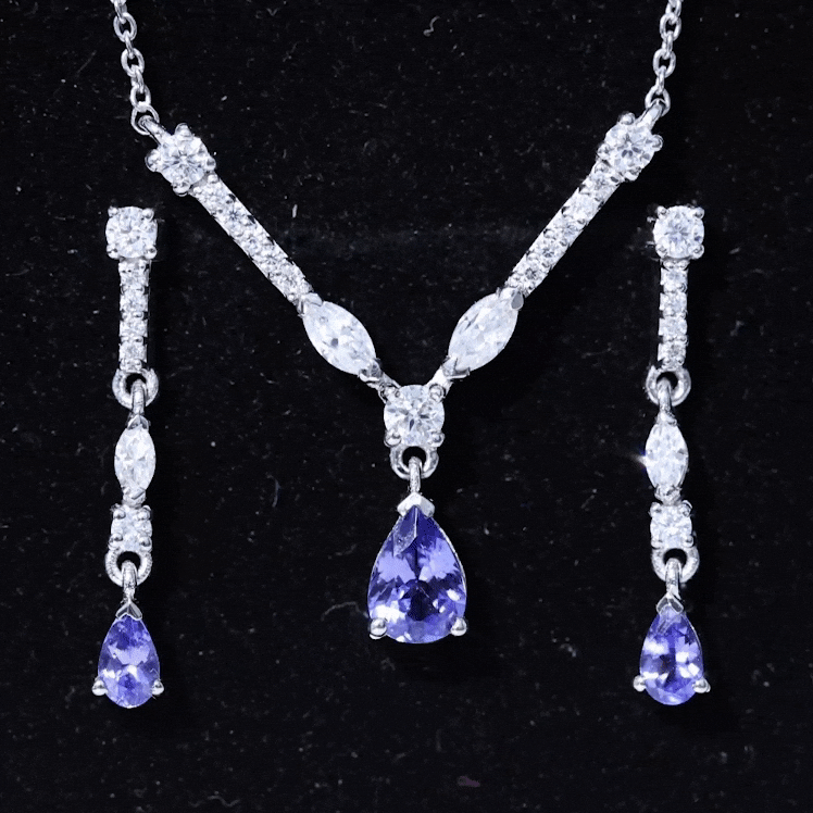 Looking for the perfect Necklace Earrings jewelry set to adorn your bride-to-be on your wedding day? Look no further than this stunning Tanzanite Jewelry Set. Featuring a gorgeous Pear Cut Tanzanite stone set in a secure Prong Setting and accented with sparkling Moissanite on both the pendant and drop earrings, this drop jewelry set is sure to make a statement. The elegant Tanzanite Pendant and Earrings Set is both beautiful and timeless and is sure to become a cherished piece in your loved ones jewelry collection.
